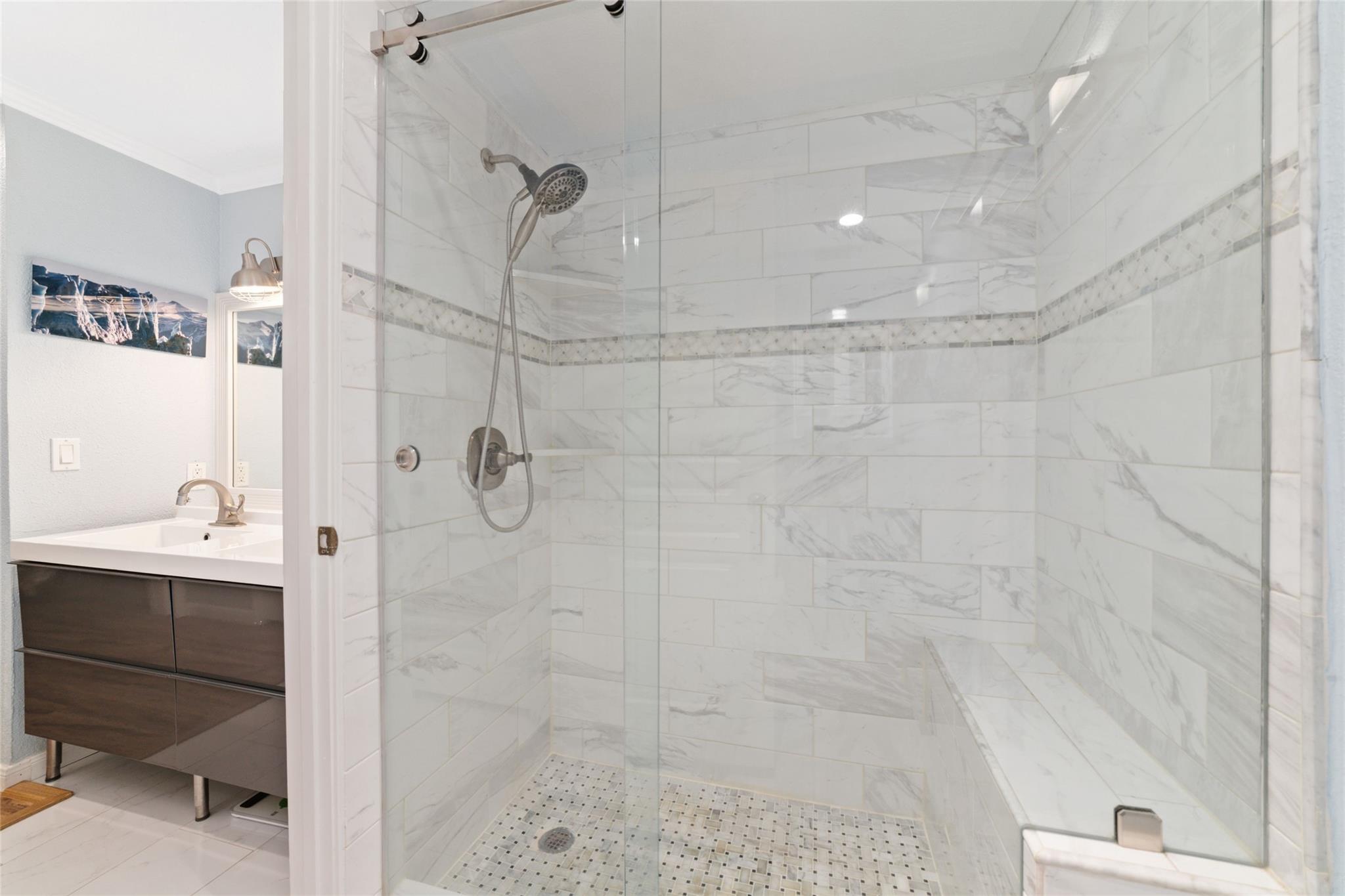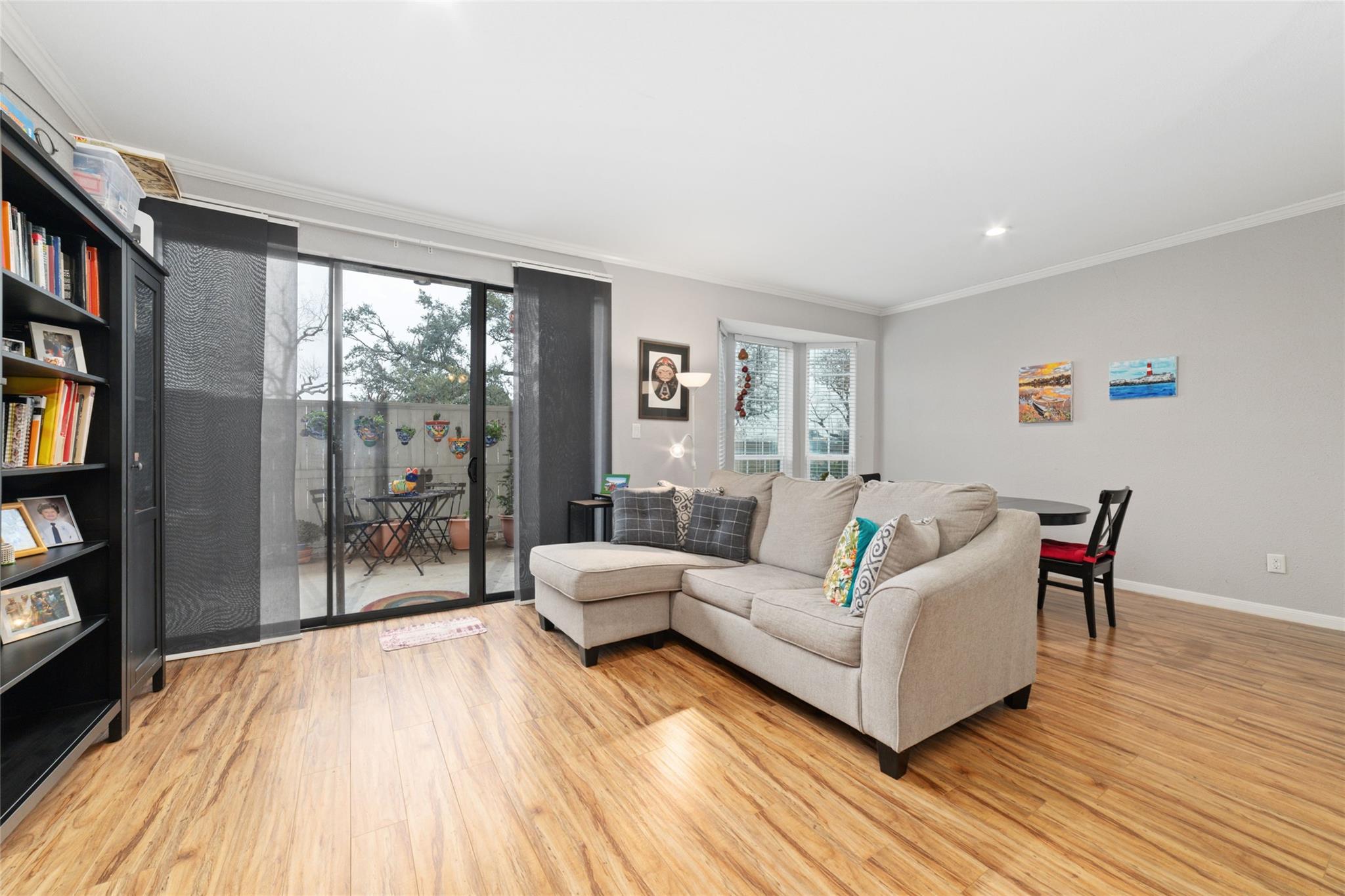 SEE VIDEO LINK! This spacious condo is minutes away from the MED CENTER, RICE University, Rice Village, Hermann Park/Golf Course, and more. This 1108SF condo offers a FLEX SPACE, HALF BATH for your guests, and a LARGE PATIO. DOUBLE-PANED, INSULATED WINDOWS AND PATIO DOOR make the condo quiet and energy efficient. The open living/dining area is great for gathering with family and friends. The kitchen features crisp white cabinets, GRANITE counters, a pantry, and soft-close cabinets/drawers. The flex space has a closet so it can be used as a small bedroom, office, hobby/exercise area, breakfast room, etc.! The main bathroom has 2 sinks and a beautiful walk-in shower with a built-in bench. IN-HOUSE LAUNDRY! Enjoy a private patio with gate access to a lawn area. The Brentwood community offers many perks that are included in the HOA fee: 2 pools, fitness center, conference room, manned entry gate, storage closet, & more! EASY LIVING INSIDE THE LOOP doesn’t get much better! (all per selle