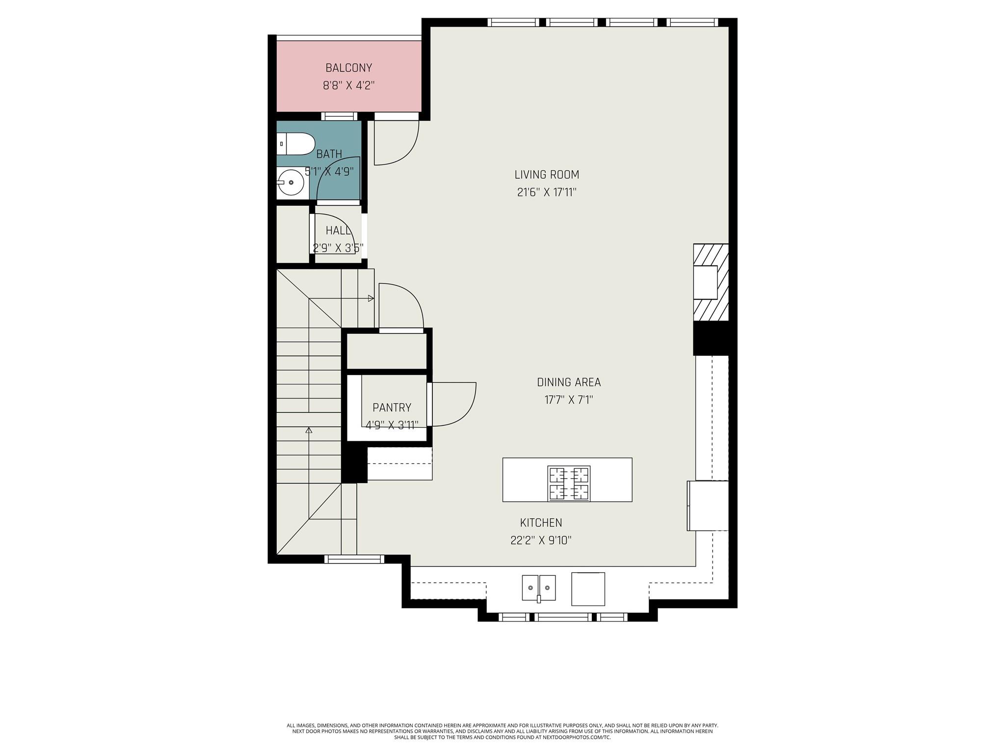 Second FloorLiving:21'6 x 17'11Dining:17'7 x 7'1Kitchen:22'2 x 7'10Exterior Porch/Balcony:8'8 x 4'2