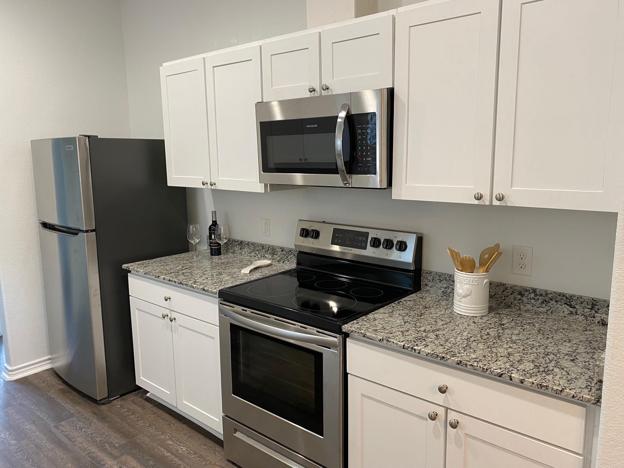 /monthReady for immediate move in and move in specials! Beautiful 2 bedroom/2 Full bath duplex features gorgeous amenities throughout. Gourmet kitchen with granite countertops, stainless appliances, refrigerator included, large pantry and plenty of cabinet space. Primary bedroom downstairs has a large walk-in closet, ensuite bath offers double sinks with granite and a spacious, beautiful walk-in shower. Secondary bedroom is located upstairs with a walk in closet and own private bathroom with tub/shower combo and granite countertops. Laundry room inside with electric washer and dryer connections. Easy care vinyl flooring and carpet throughout. Covered patio in back and private fenced yard. $165.00 monthly maintenance fees includes water, trash and yard mowing. Square footage is per the builder.