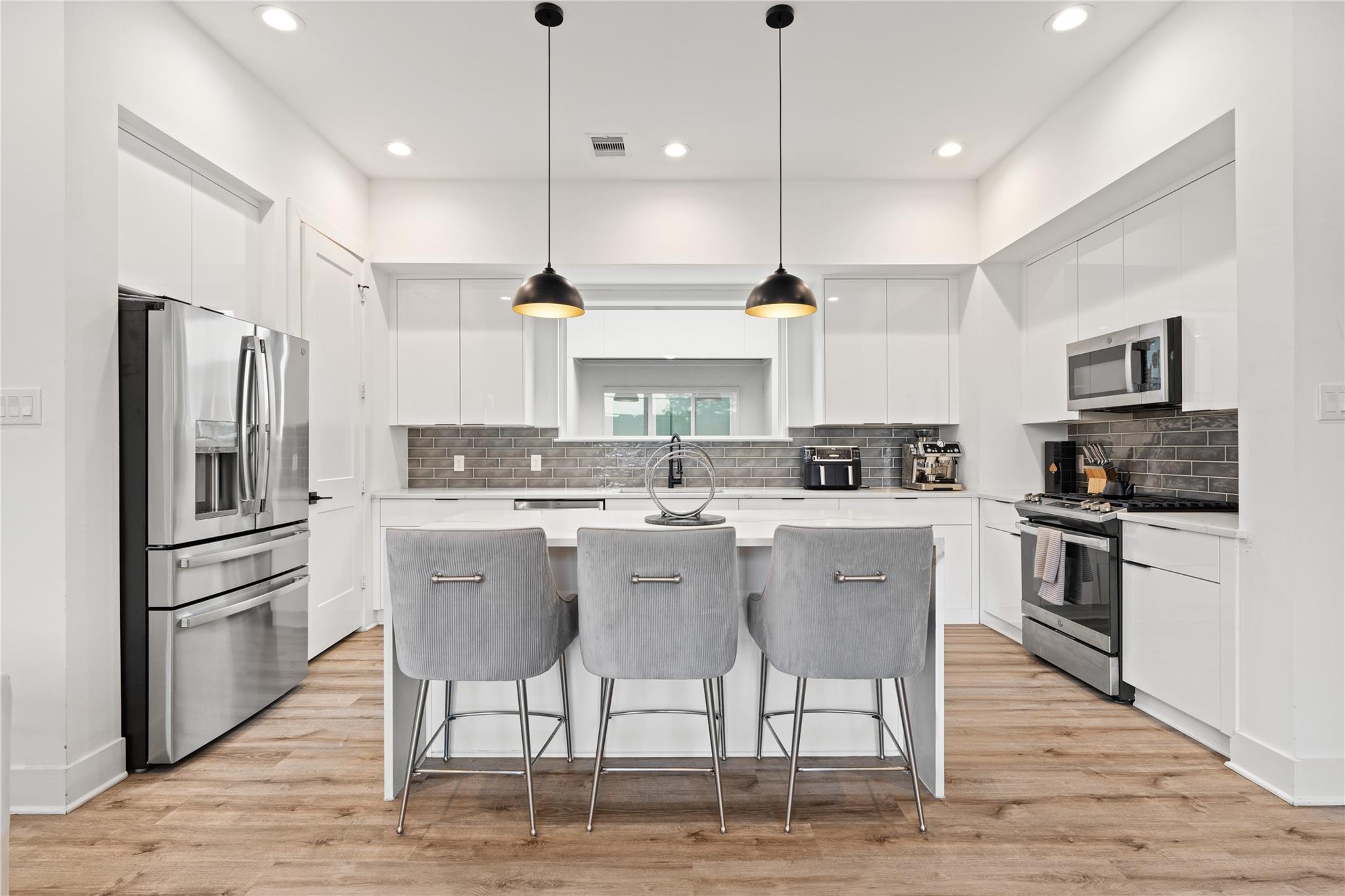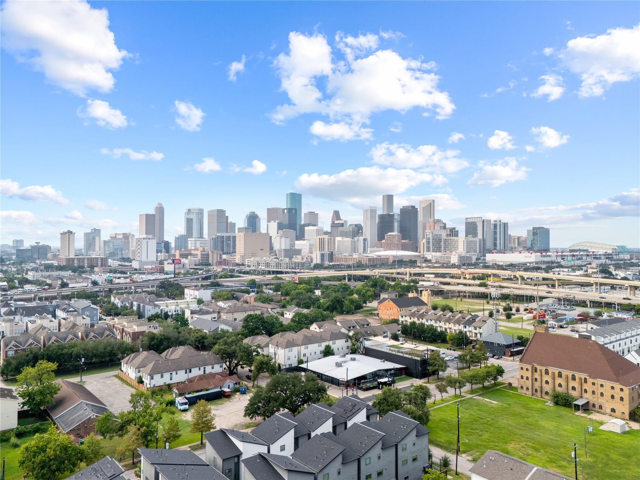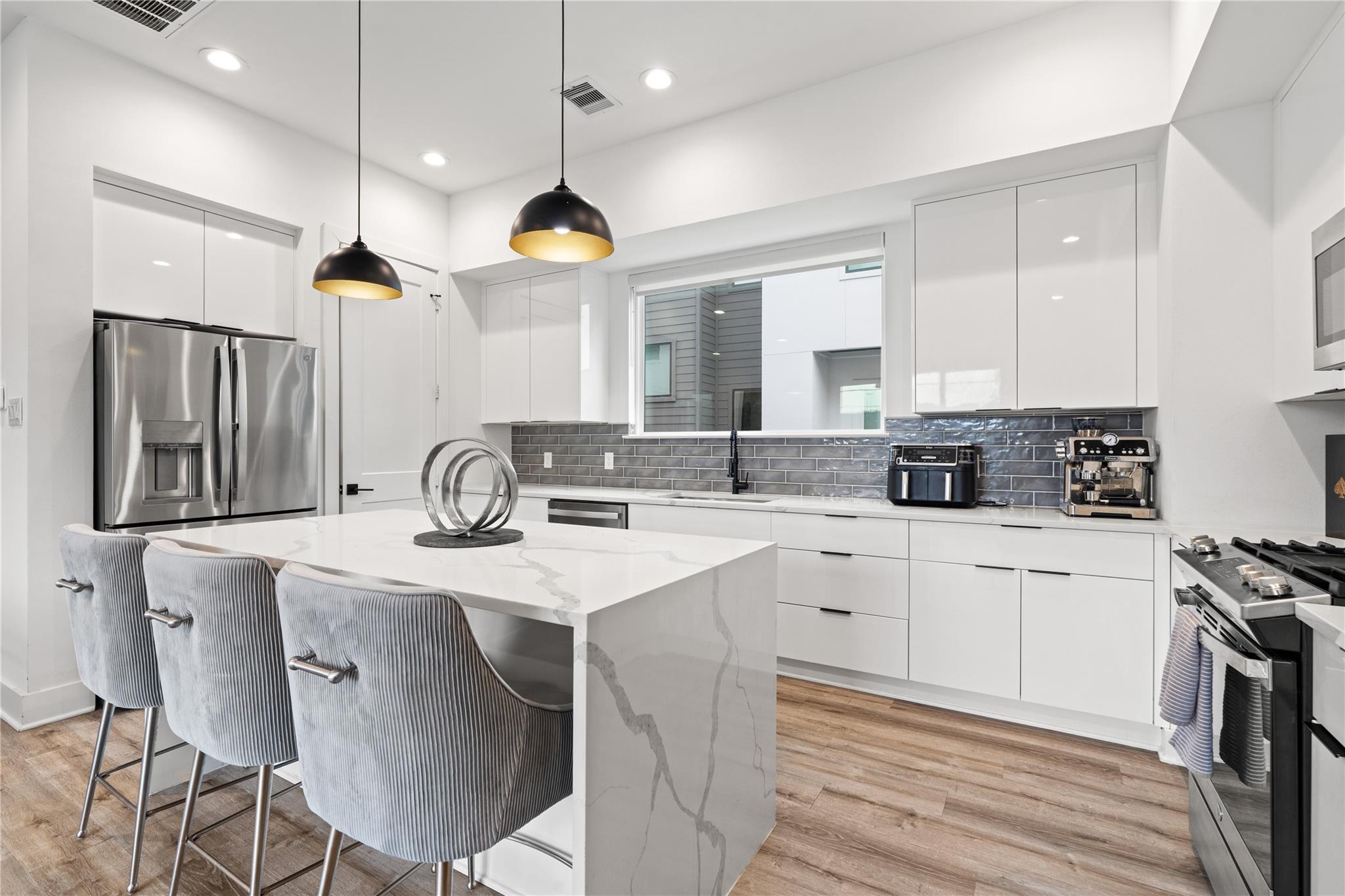 Welcome to modern living in the heart of Third Ward. Located in a gated community, this 3 bedroom, 3.5 bath residence offers 2,089 square feet of well designed space. The open concept second floor features high ceilings, oversized windows, and a bright living and dining area. The kitchen includes wood floors, a waterfall quartz island, shaker cabinets, stainless steel appliances, and a modern backsplash. A private first floor bedroom with ensuite bath is perfect for guests or a home office. The primary suite features dual vanities, a soaking tub, walk in shower, and spacious closet. Enjoy private balconies, gated entry, and a two car garage. Minutes from Downtown, the Medical Center, East River, and Emancipation Park.