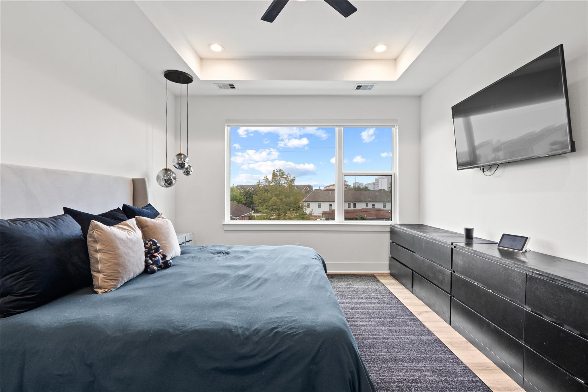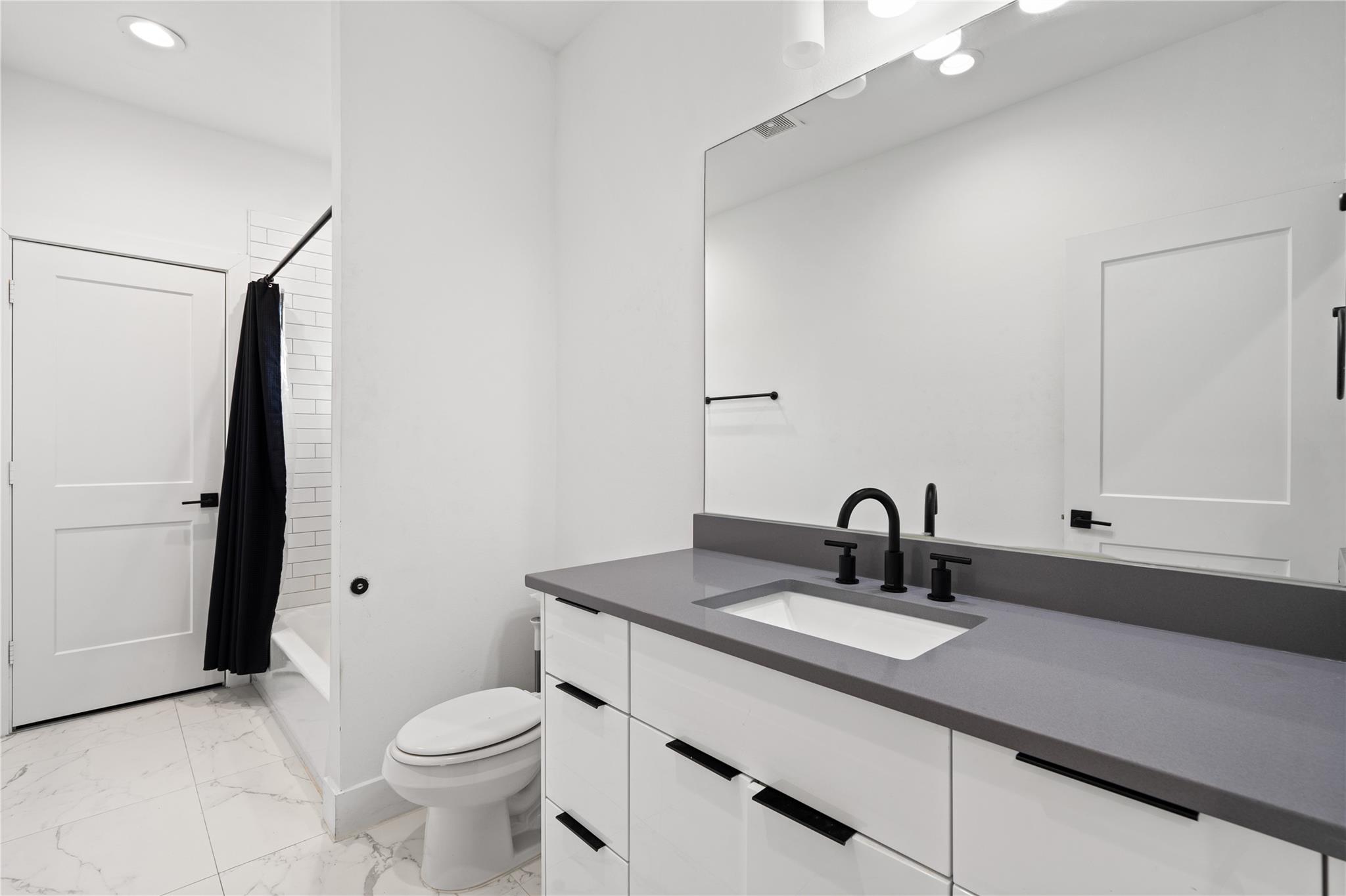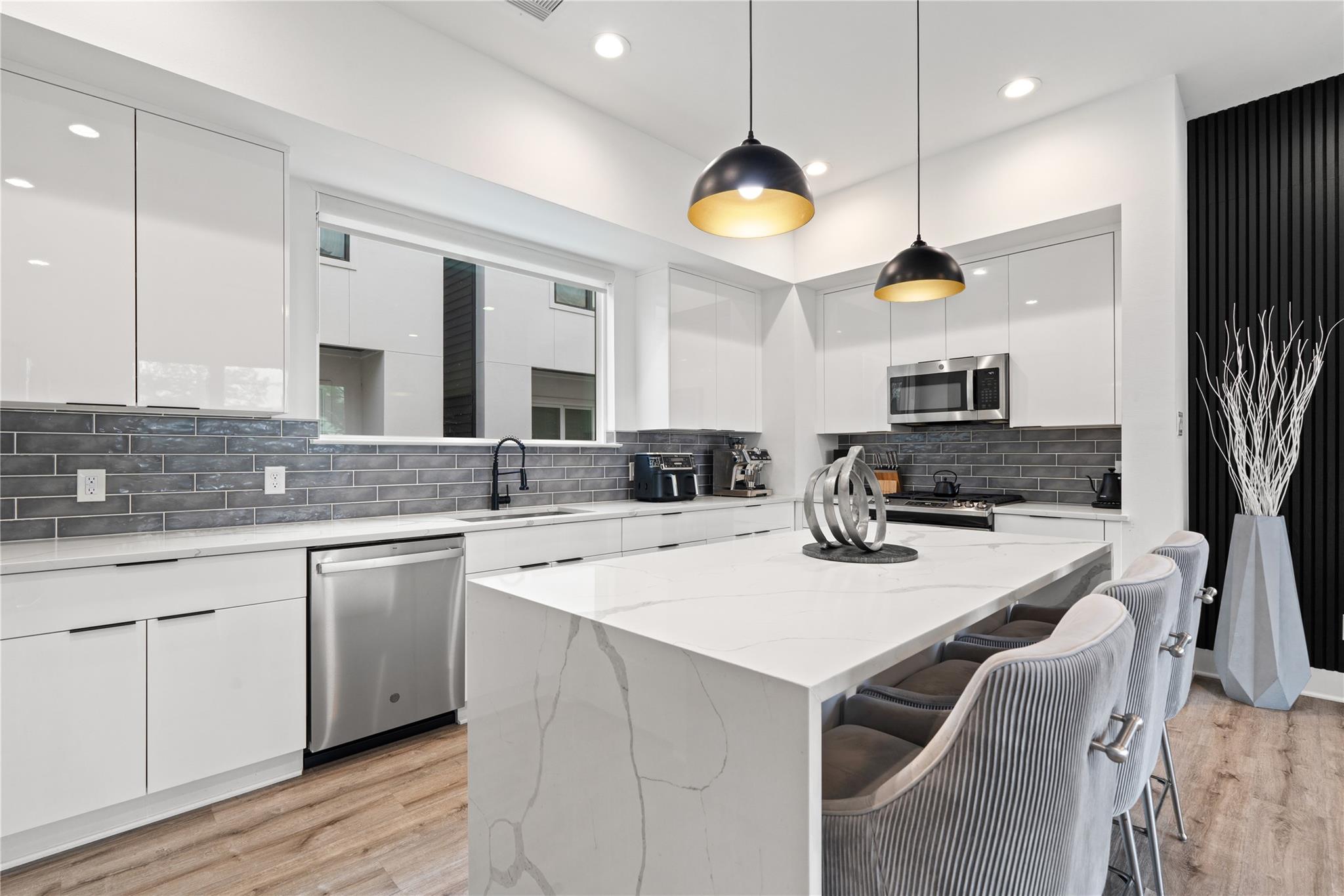 Welcome to modern living in the heart of Third Ward. Located in a gated community, this 3 bedroom, 3.5 bath residence offers 2,089 square feet of well designed space. The open concept second floor features high ceilings, oversized windows, and a bright living and dining area. The kitchen includes wood floors, a waterfall quartz island, shaker cabinets, stainless steel appliances, and a modern backsplash. A private first floor bedroom with ensuite bath is perfect for guests or a home office. The primary suite features dual vanities, a soaking tub, walk in shower, and spacious closet. Enjoy private balconies, gated entry, and a two car garage. Minutes from Downtown, the Medical Center, East River, and Emancipation Park.
