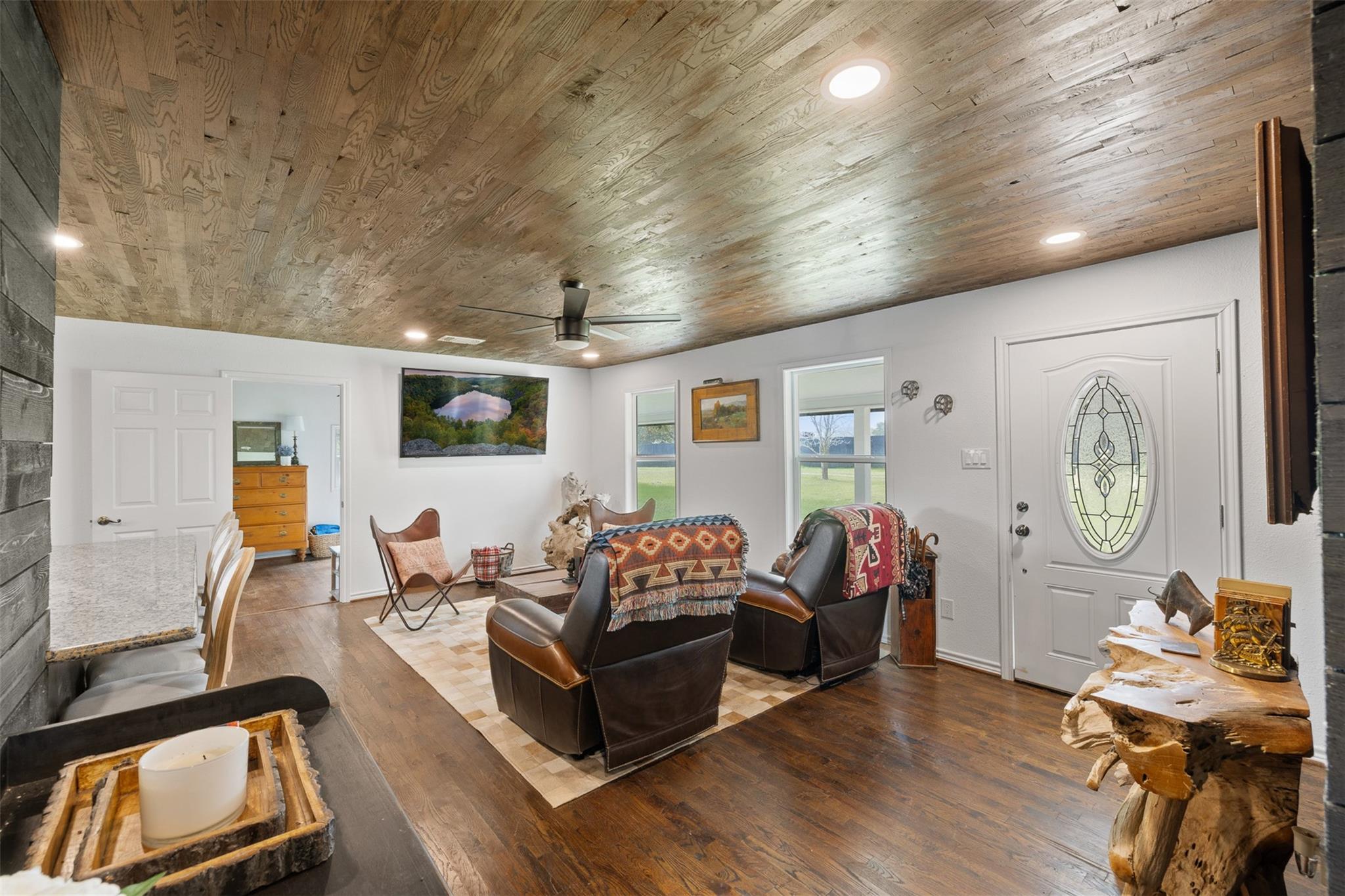 Your jewelbox in the country: easy to maintain small acreage just a few minutes drive to the charming and historically-designated town of Fayetteville and under 20 minutes to all the happenings in Round Top. Gorgeous mature trees, rolling terrain and beautiful pond make this the perfect country getaway at an attractive price point. Handsomely remodeled home features welcoming front porch, open living-kitchen, 3 bedrooms, 2 full baths, great closet space, in-house laundry. New* water heater, water lines, whole home water filtration system, new dishwasher, washer & dryer. Updated elect, plugs, switches, new secondary & master bathroom renovations, completely updated baths, new oak hardwoods throughout & oak wood ceilings, whitewashed antique brick patios - front & back, new exterior & interior paint throughout, laundry room new tile & lighting, custom paint living room, kitchen & secondary bathroom - custom cedar shiplap. Outdoor fire pit & seating area. *per seller