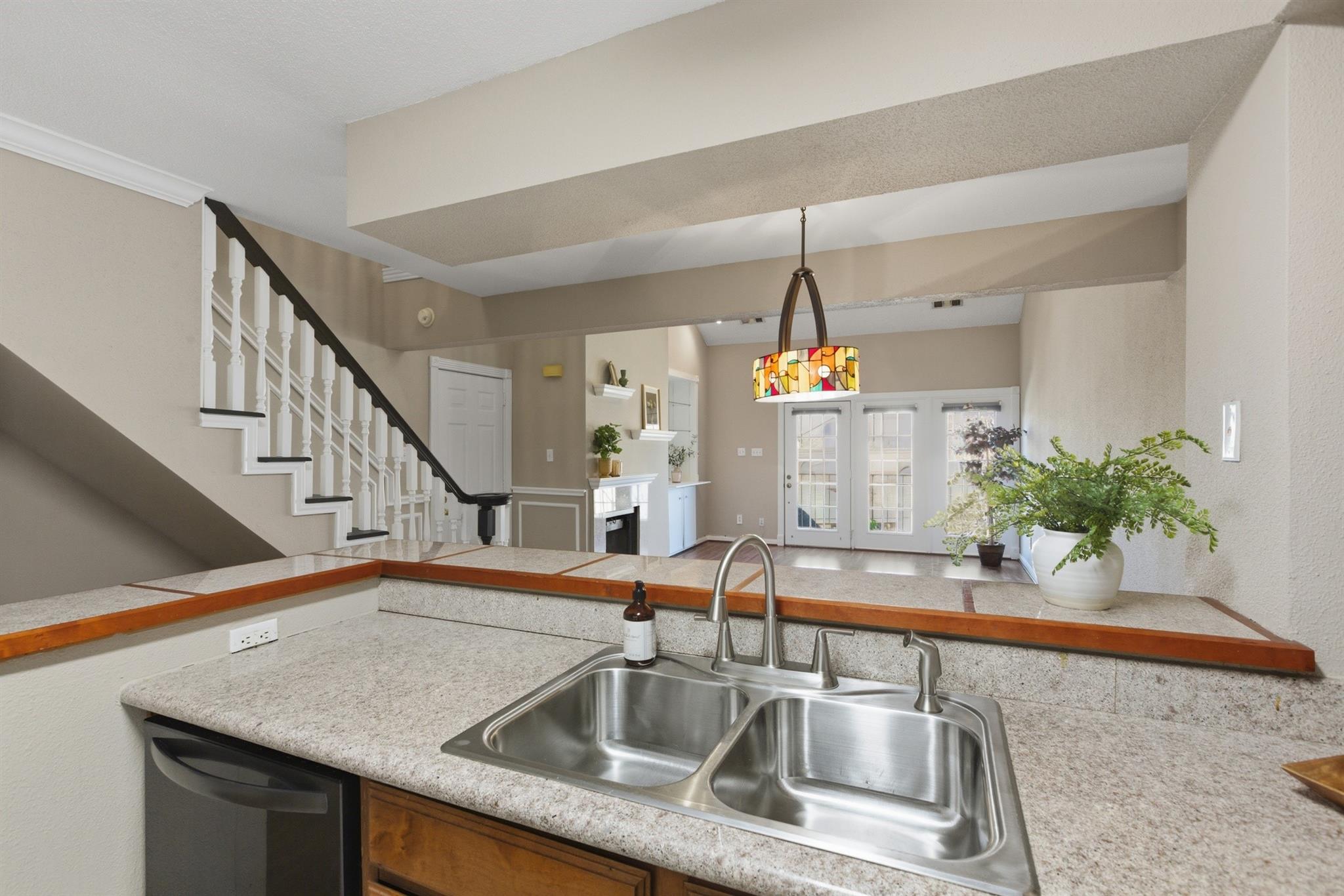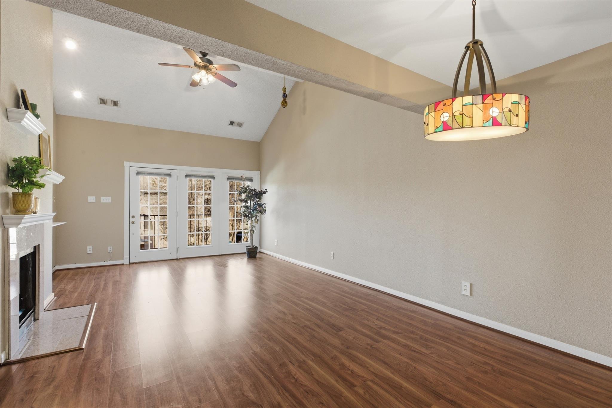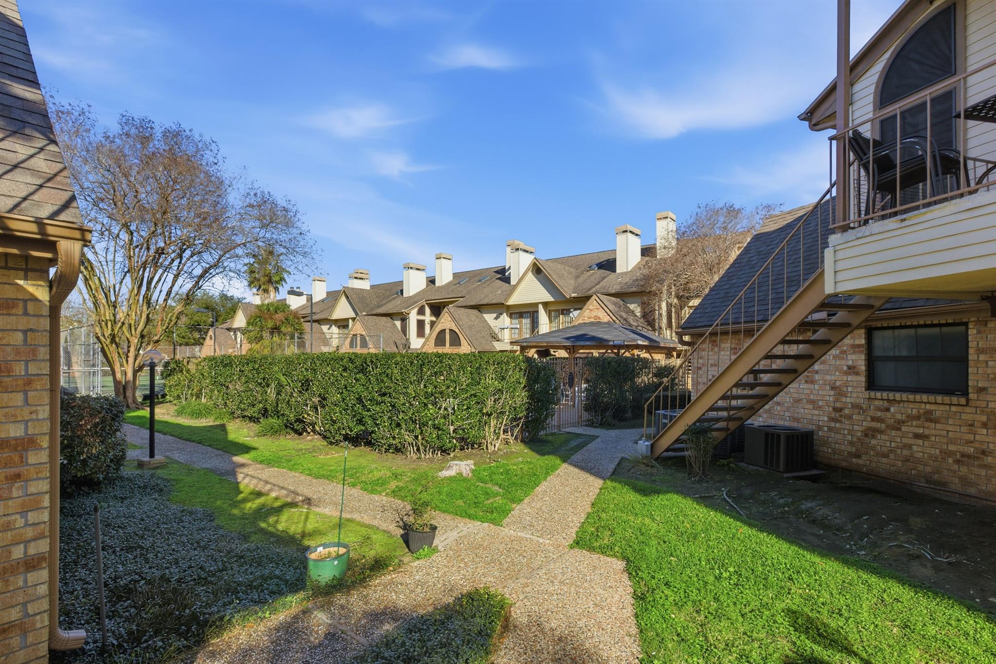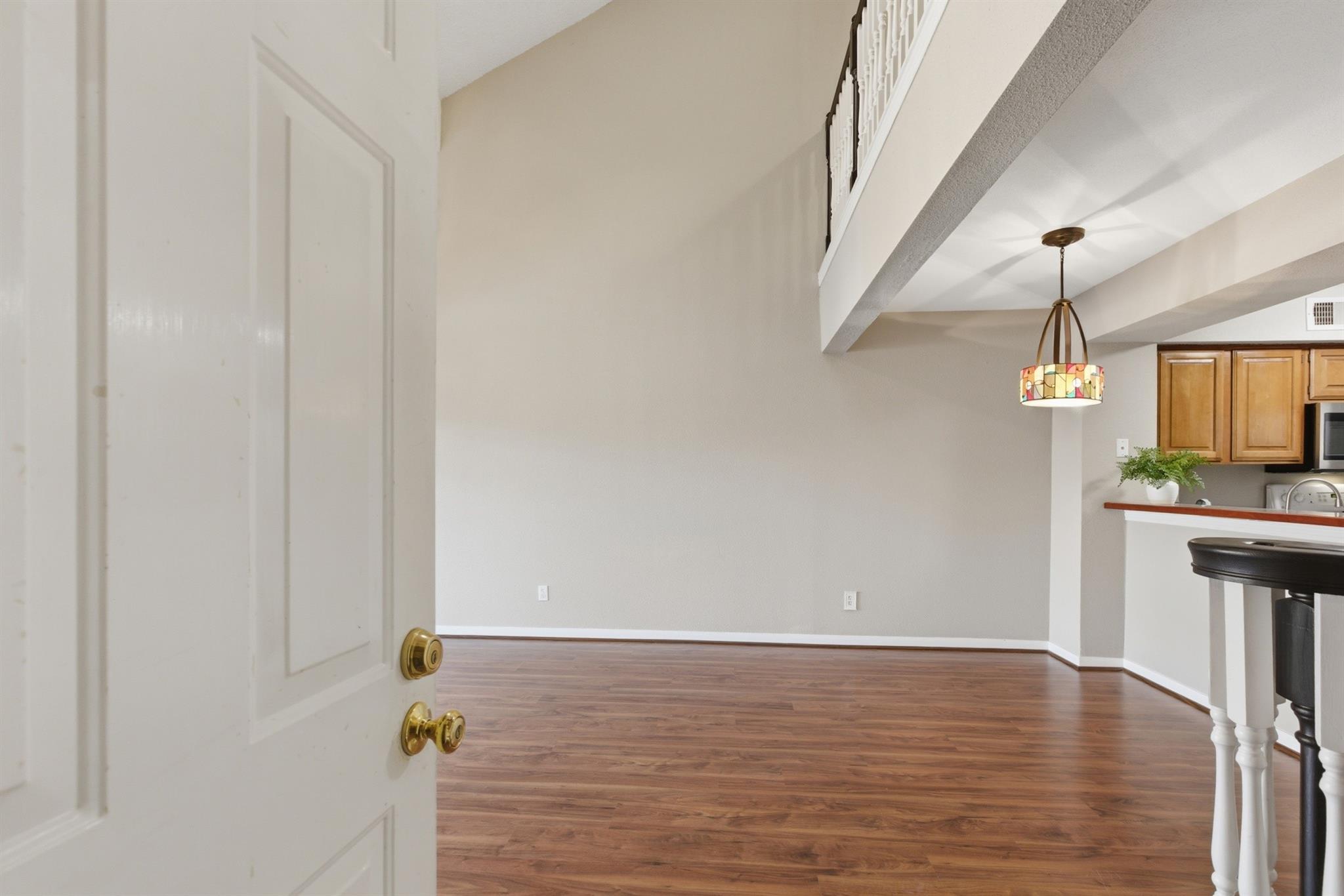 Fabulous condo unit in close proximity to Medical Center, downtown, NRG complex, museums, and Hermann Park/Brays Bayou Park! Located in the well maintained, gated complex of Plaza Place, this unit is directly across from complex pool and tennis courts, from the balcony front porch, you can step right out to the pool on those hot summer days! Spacious open floor plan with over 1000 sqft with high ceilings! Fresh neutral paint throughout the home. Wood-look vinyl plank flooring, well appointed kitchen overlooking dining and living areas, lovely wainscoting details, and gorgeous wood stained stairway. Refrigerator washer and dryer remain. Huge storage closet upstairs. Attached 1 car garage and additional unassigned parking space in complex. Super clean, well maintained, and move-in ready.