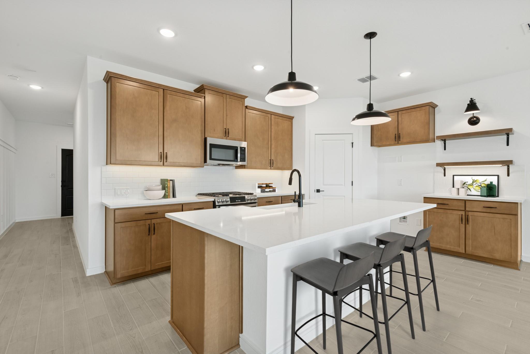 Ready to Move In! Aspire at River Ranch Trails is a master-planned community featuring Looks, a stylish collection of interiors professionally curated by our design team. This charming one-story Daffodil IV home with Farmhouse Look features 3 bedrooms, 2 baths and 2 car attached garage. Welcoming foyer with feature wall. Charming home with open-concept living space - cozy great room and dining area. Efficient island kitchen with light stained cabinets, decorative floating shelves, and Cararra Morro quartz countertops. Lavish primary suite with walk-in closet and feature wall. Relaxing primary bath with white cabinets, dual sinks, and walk-in shower. Located in Dayton off HWY 146 with easy access to I-10 and HWY 99. Close to shopping and dining in Dayton and Mont Belvieu. Resort-style living with Angel Lagoon: Crystal-clear waters, beaches, and more! Offered by: K. Hovnanian of Houston II, L.L.C.