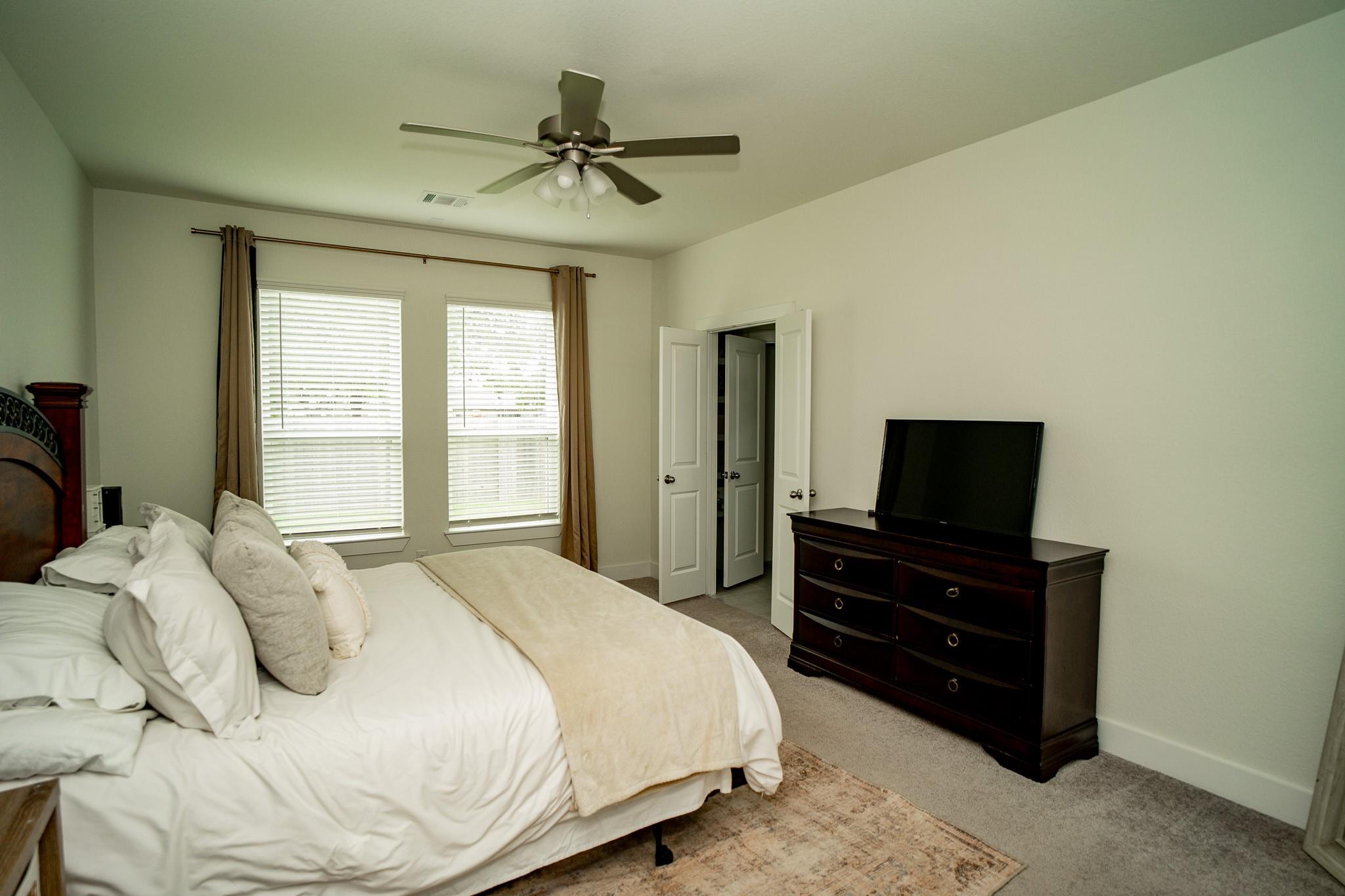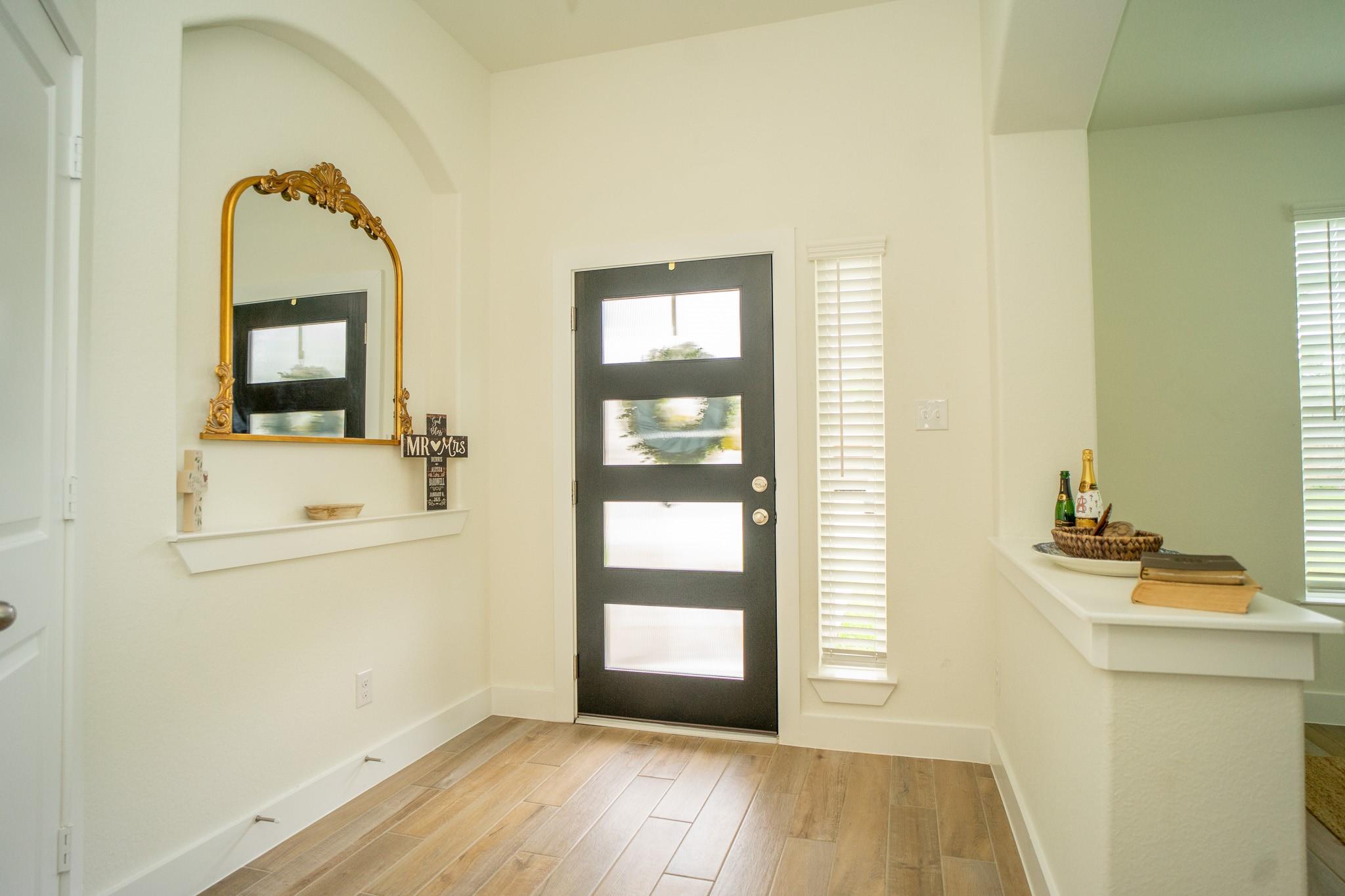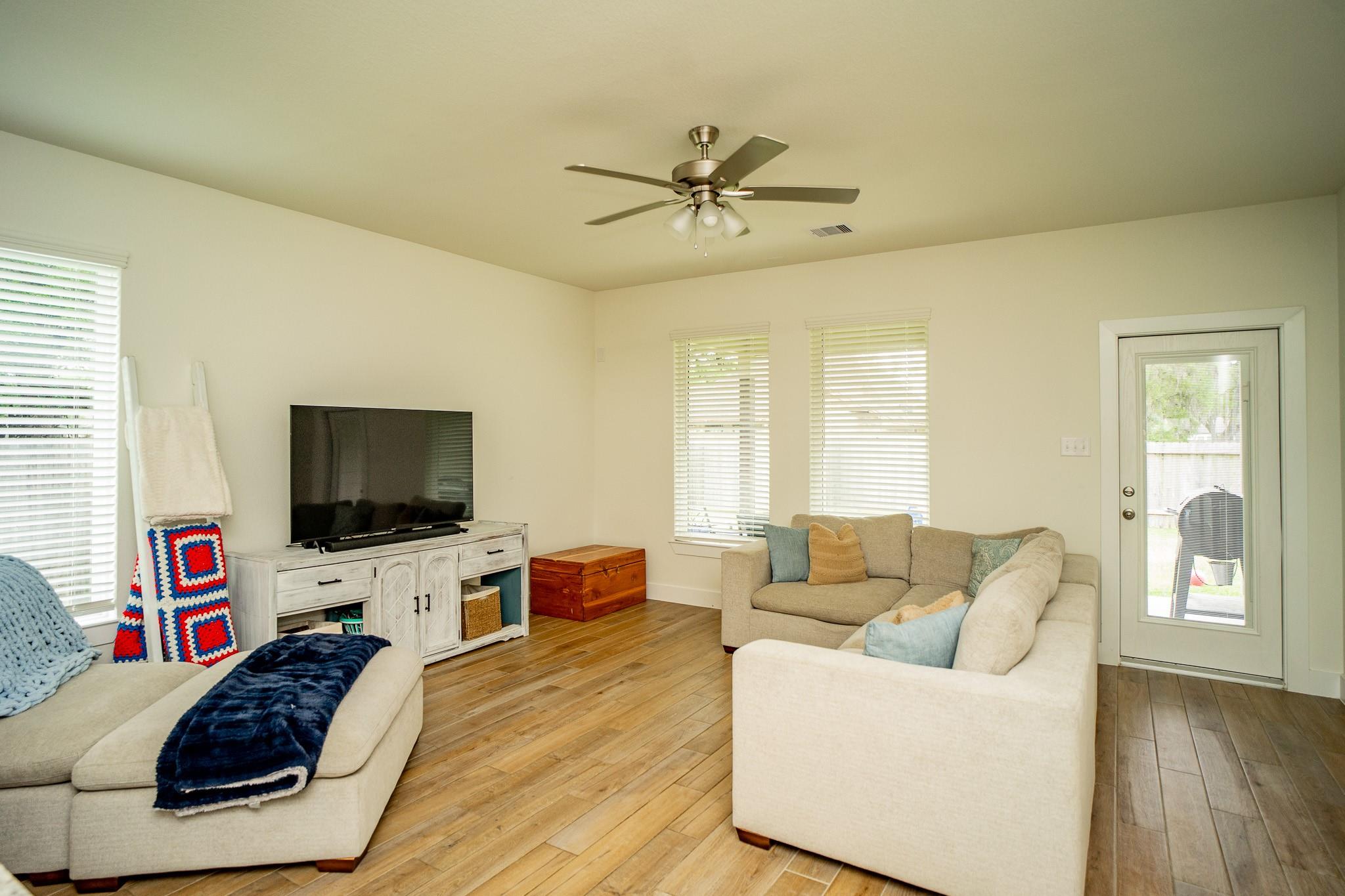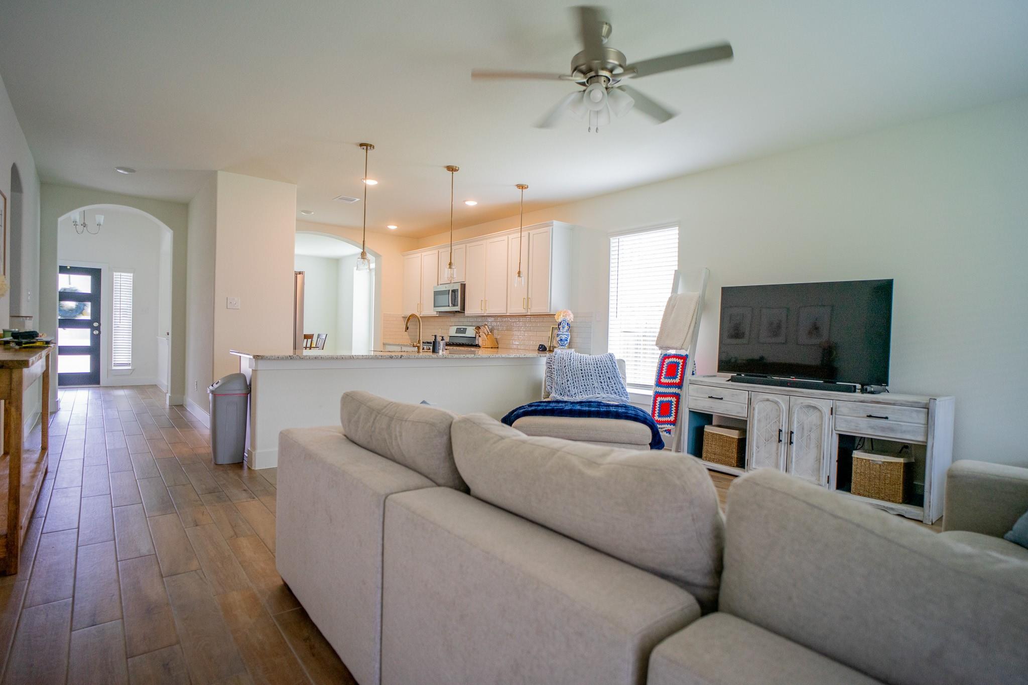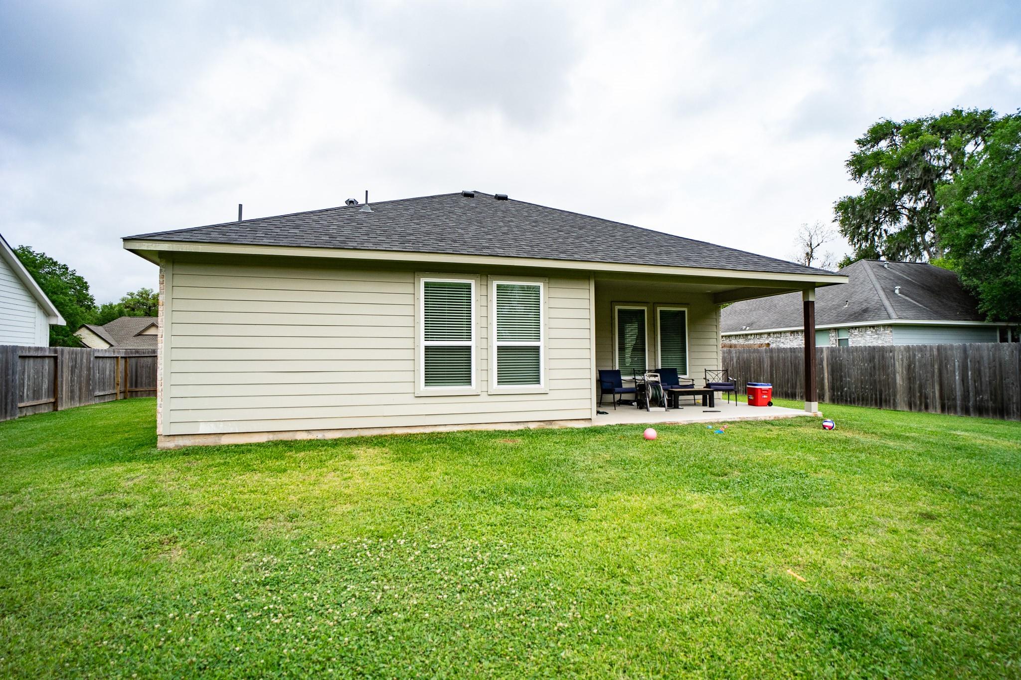 Beautiful 2024 single-story Castlerock home set on an oversized 75’ lot in a guard-gated community. Thoughtful details include high ceilings, and an open-concept design featuring a spacious family room that flows seamlessly into a bright, well-appointed kitchen. The kitchen showcases white cabinetry, quartz countertops, a stylish backsplash, stainless steel appliances and a huge breakfast bar. The primary suite features high ceilings, dual vanities, a large shower and a huge walk-in closet. Woodgrain tile flooring in the kitchen and living areas and carpeting in the bedrooms. The oversized lot provides plenty of space for outdoor entertaining. Community amenities include a golf course, swimming pool, scenic walking trails, and low taxes. Conveniently located with easy access to I-35 and Hwy 288, and just minutes from Angleton and Lake Jackson.