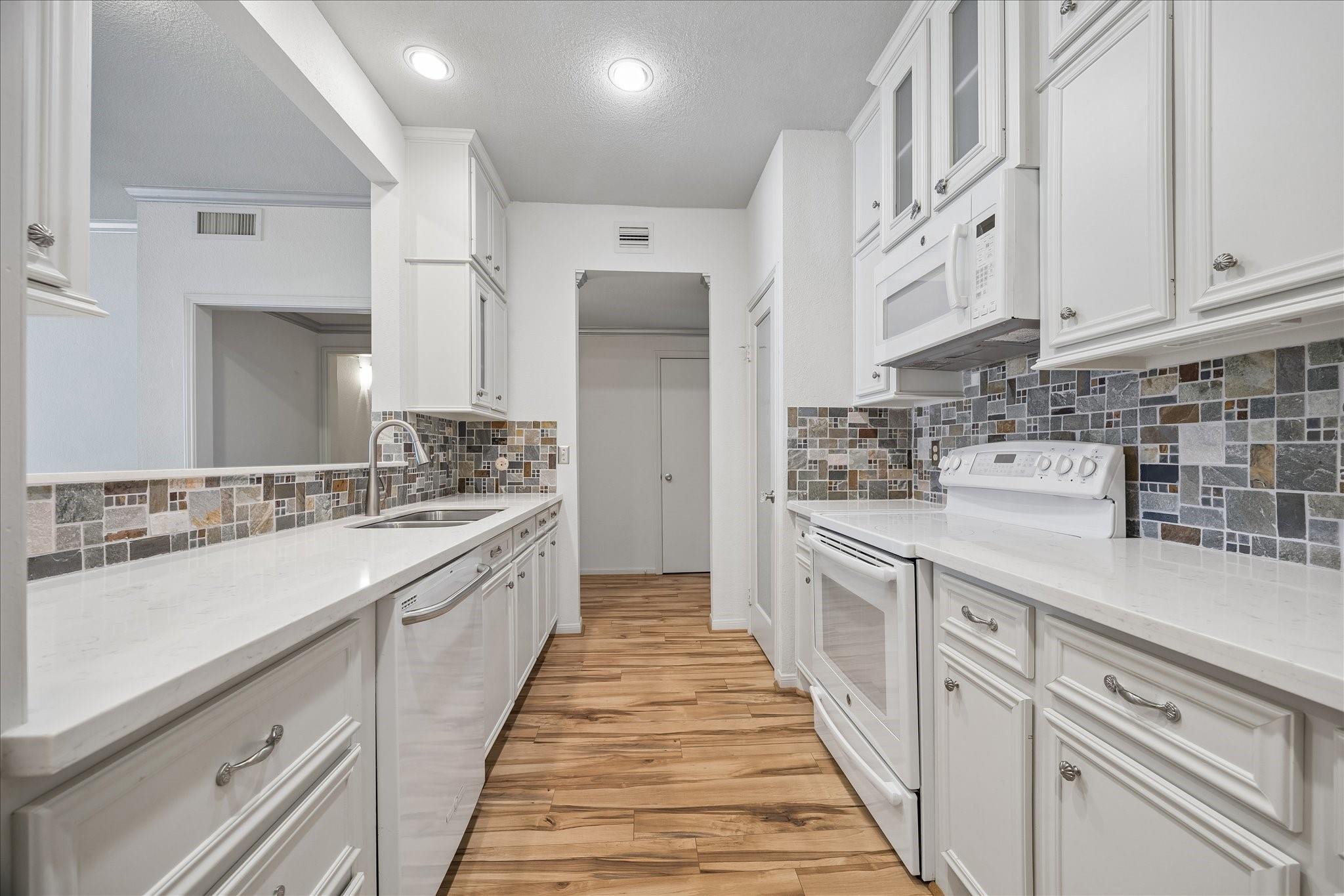 Come see this beautifully updated 2-bedroom unit on the second floor. It features a modern kitchen, updated bathrooms, and durable laminate and tile flooring throughout. The kitchen offers ample cabinet storage and opens to the dining and living areas, creating a spacious, connected feel. The living room also includes an enclosed glass balcony overlooking a charming, tree-lined neighborhood. The primary bedroom features an updated en-suite bathroom with a walk-in shower, as well as a large closet complete with built-in shelving and drawers. This condo complex is quiet and has 2 pools, a fitness room and other amenities. It is conveniently located close to the Texas Medical Center, Rice University, NRG Stadium, and shopping. YOU NEED TO PUT THIS ONE ON YOUR LIST OF PROPERTIES TO SEE!