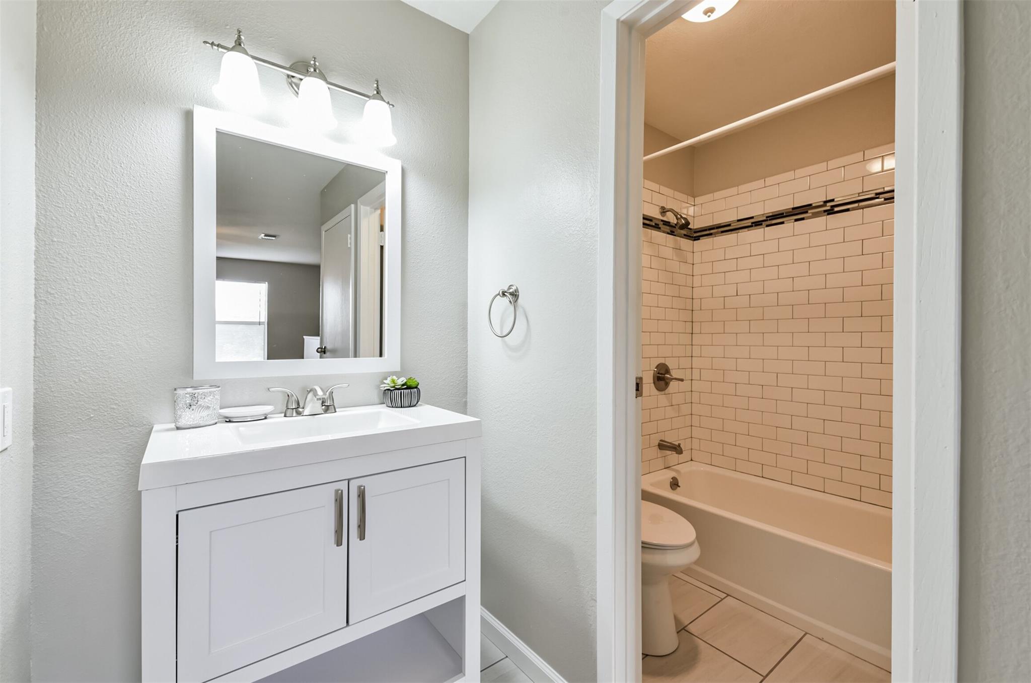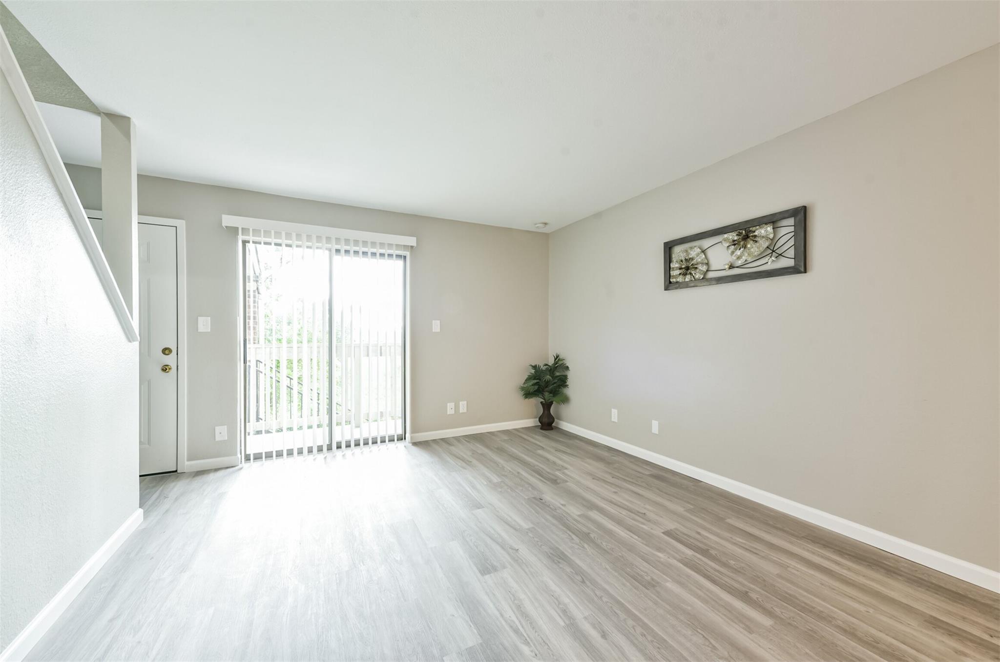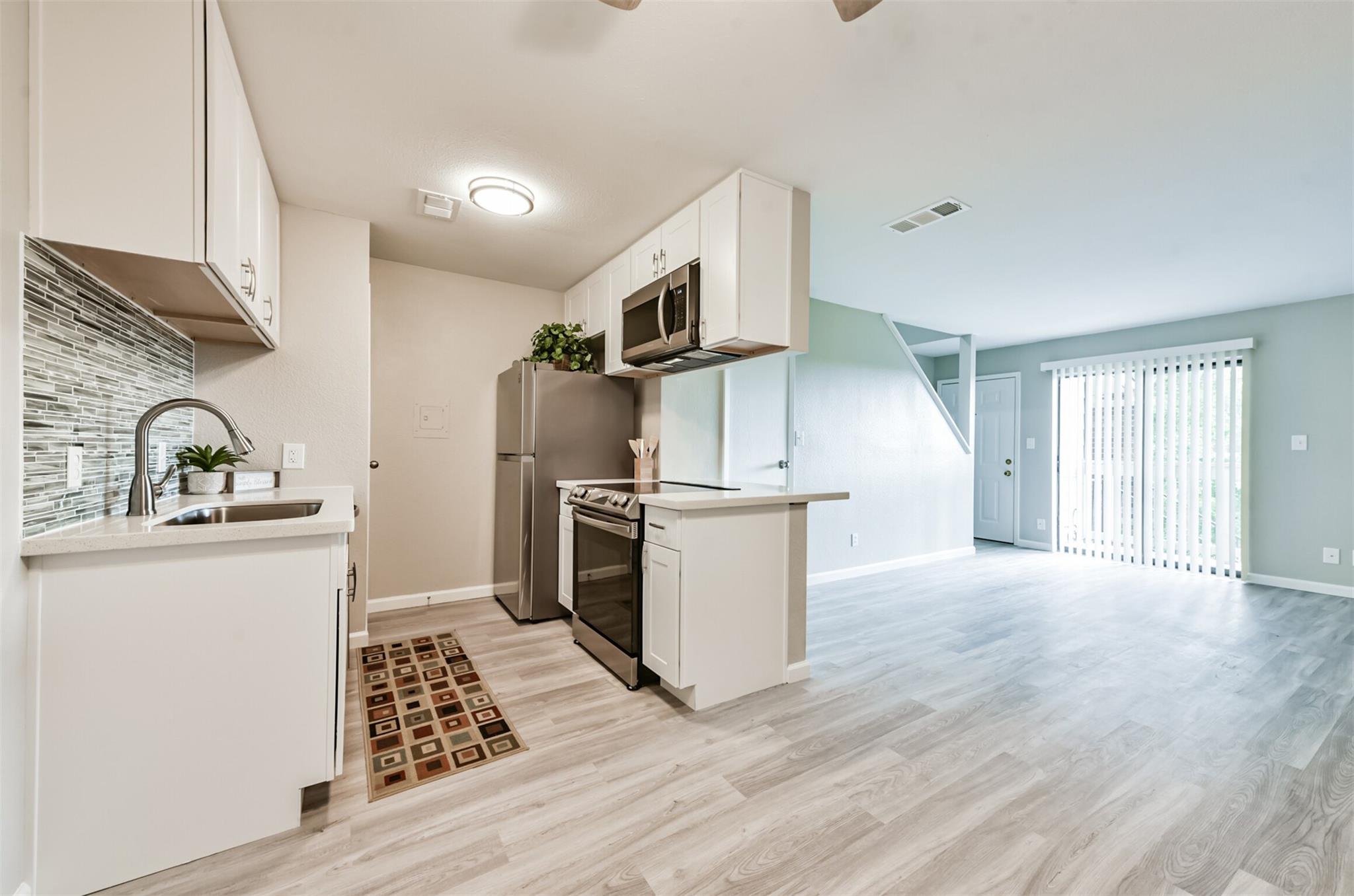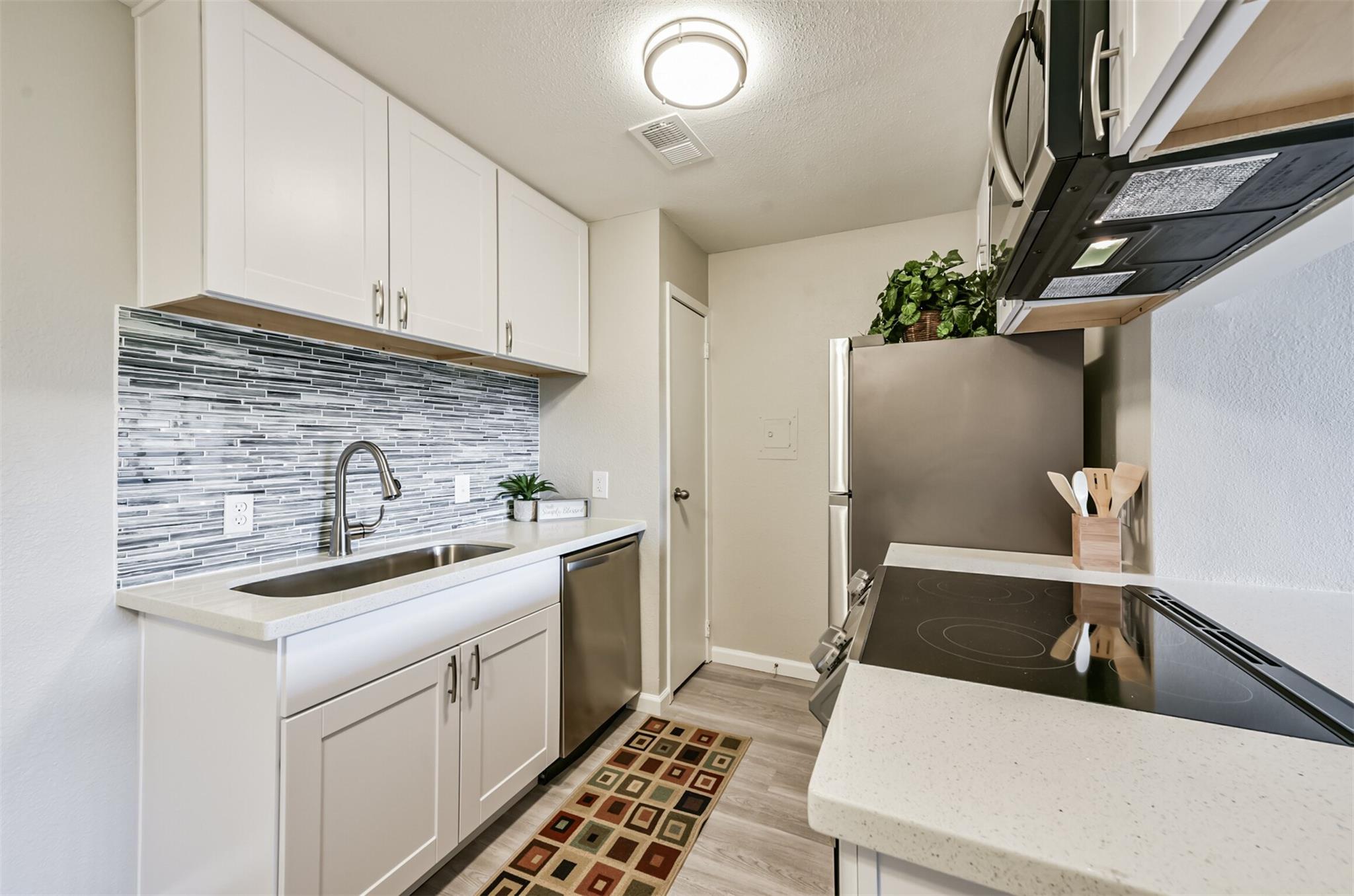 FULLY REMODELED 2 STORY CONDO IN GATED COMMUNITY!! Refrigerator, Washer, Dryer ALL INCLUDED! Vinyl plank downstairs with beautifully updated kitchen and newer appliances- slide in electric stove/oven, dishwasher, microwave, disposal. Quartz countertops, glass mosaic backsplash, shaker cabinets, undermount sink. Carpet on stairs and throughout the upstairs bedroom. Spacious closet, separate linen closest, newer vanity, and completely updated bathroom including toilet, tub, and all tile. Sherwin Williams designer color paint on all walls and closets. Blinds on all windows and sliding patio door. 2 assigned parking spaces in attached carport, directly below. Easy Access to I-45 for quick commute south to Galveston or head north to Downtown/Medical Center. This unit is great for either a owner occupant or makes an excellent rental. On the market now for sale or lease. Owner is broker.
