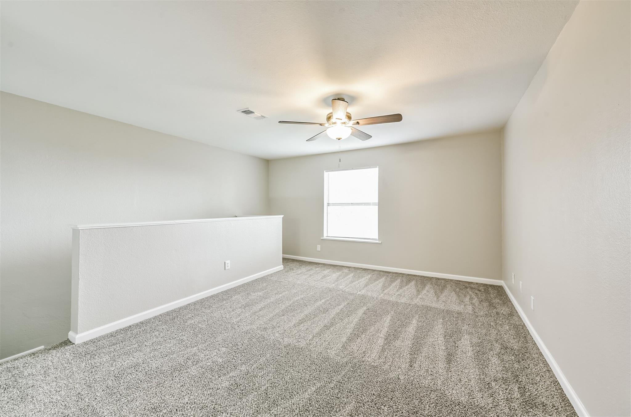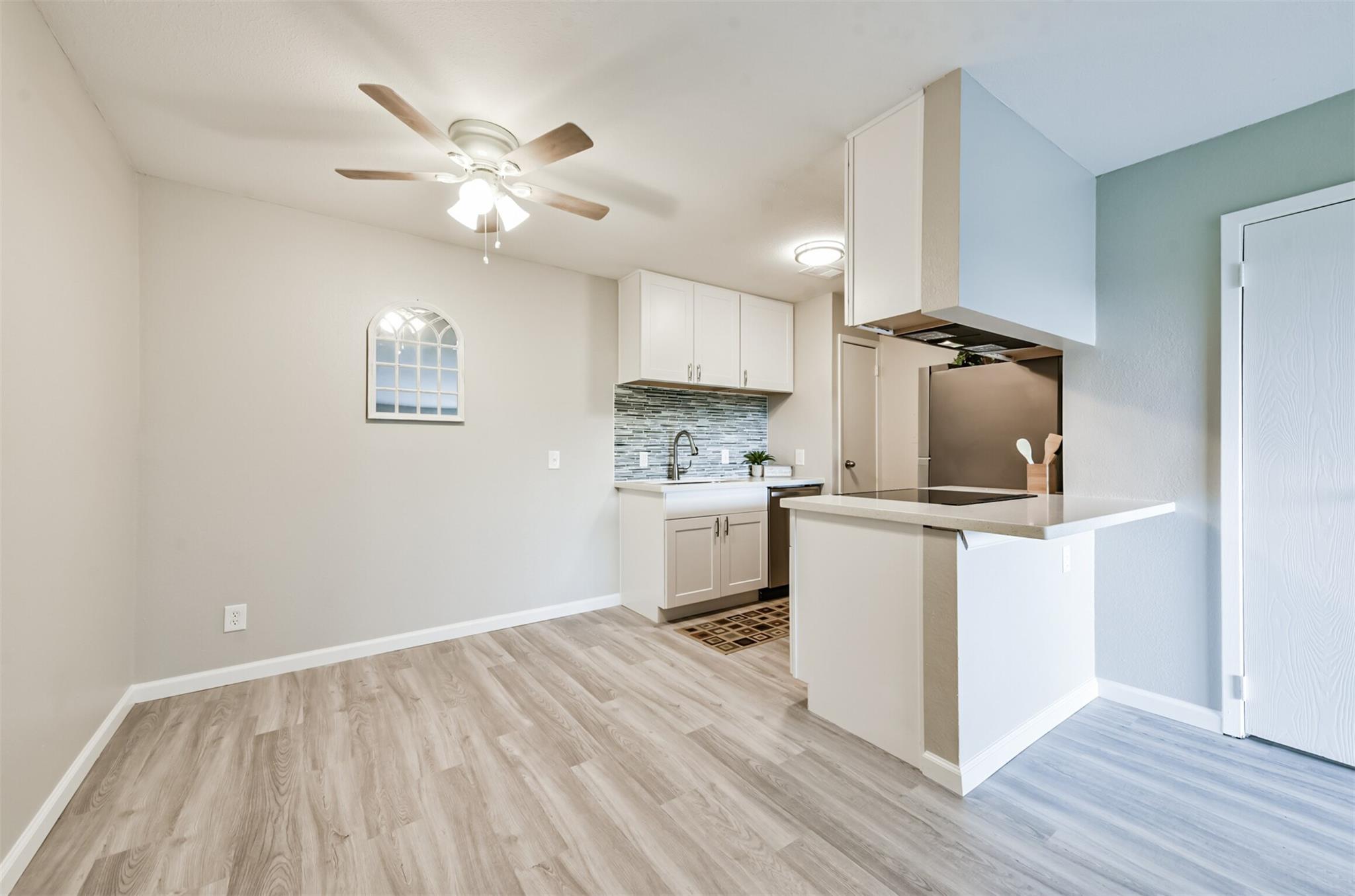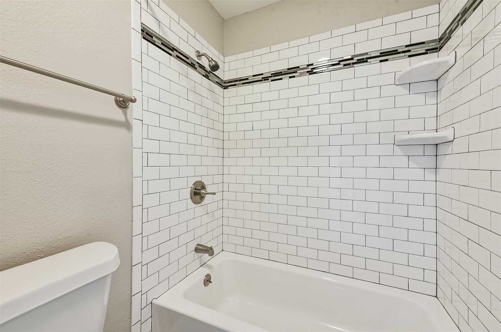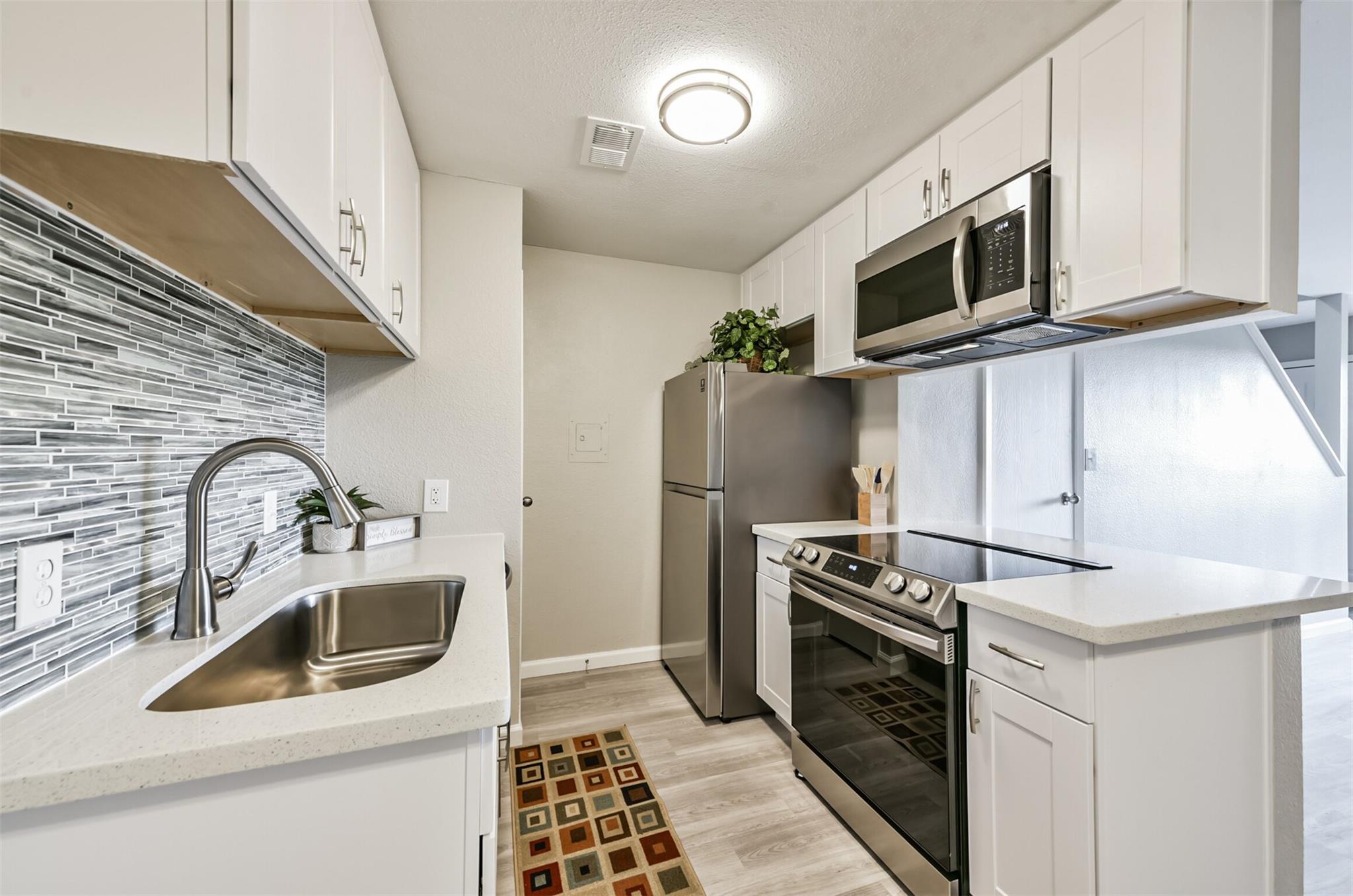 FULLY REMODELED 2 STORY CONDO IN GATED COMMUNITY!! Refrigerator, Washer, Dryer ALL INCLUDED! Vinyl plank downstairs with beautifully updated kitchen and newer appliances- slide in electric stove/oven, dishwasher, microwave, disposal. Quartz countertops, glass mosaic backsplash, shaker cabinets, undermount sink. Carpet on stairs and throughout the upstairs bedroom. Spacious closet, separate linen closest, newer vanity, and completely updated bathroom including toilet, tub, and all tile. Sherwin Williams designer color paint on all walls and closets. Blinds on all windows and sliding patio door. 2 assigned parking spaces in attached carport, directly below. Easy Access to I-45 for quick commute south to Galveston or head north to Downtown/Medical Center. This unit is great for either a owner occupant or makes an excellent rental. On the market now for sale or lease. Owner is broker.