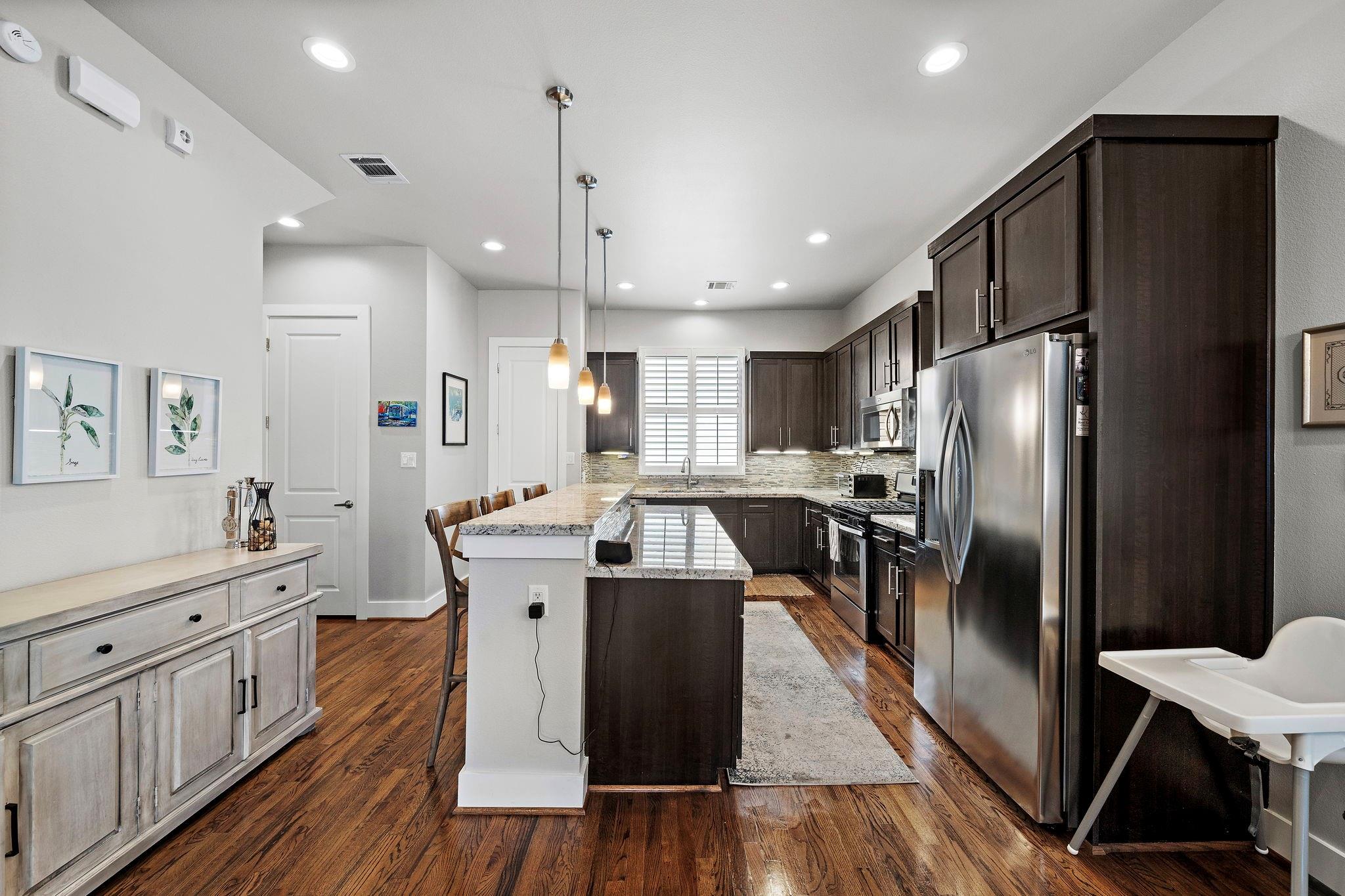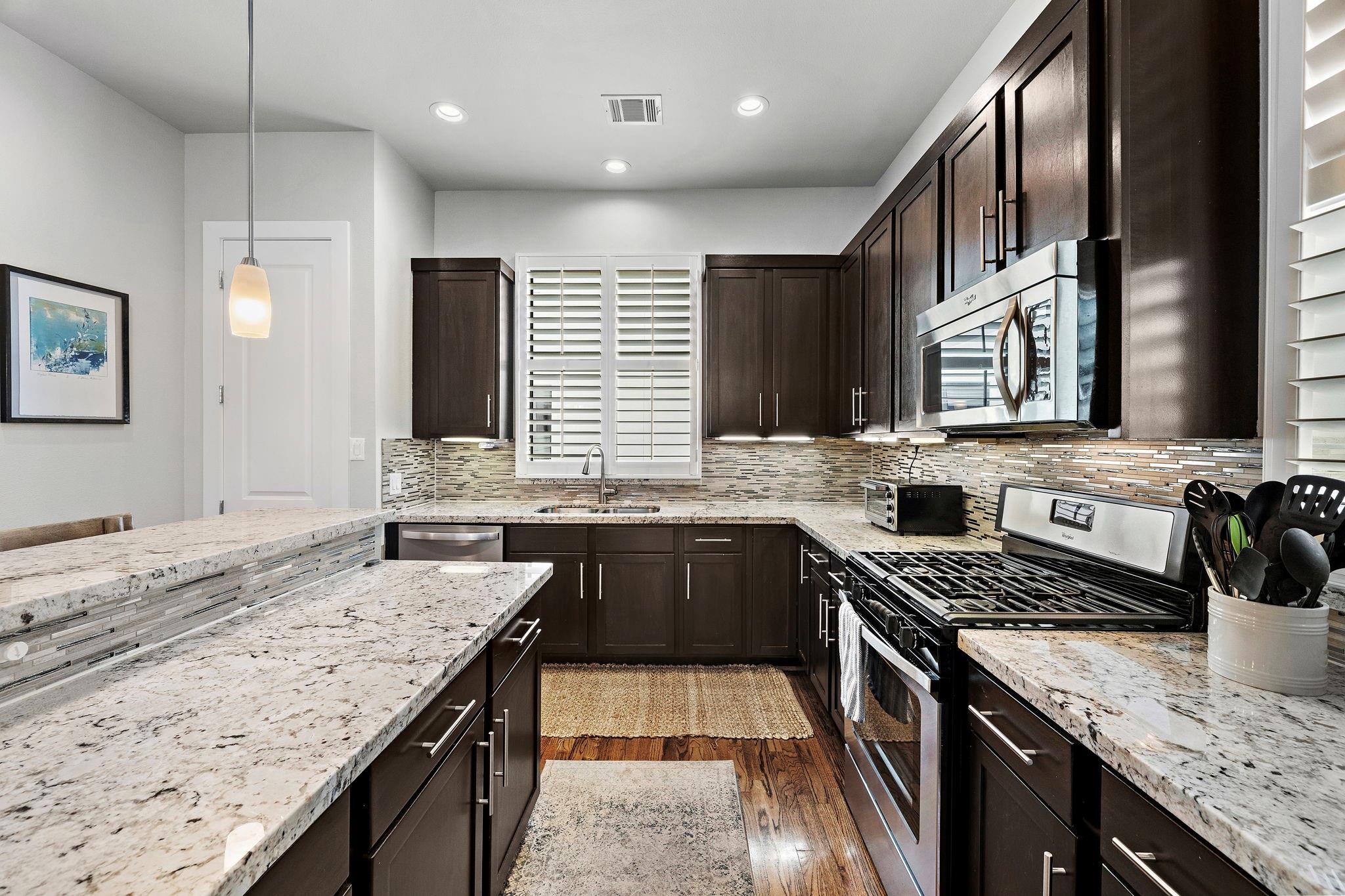 InteriorFloors:Tile,Travertine,WoodCountertop:GraniteBathroom Description:Half Bath,Primary Bath: Double Sinks,Primary Bath: Jetted Tub,Primary Bath: Separate Shower,Secondary Bath(s): Tub/Shower ComboBedroom Desc:1 Bedroom Down - Not Primary BR,En-Suite Bath,Primary Bed - 3rd Floor,Walk-In ClosetKitchen Desc:Breakfast Bar,Kitchen open to Family Room,Pantry,Soft Closing Cabinets,Soft Closing Drawers,Under Cabinet LightingRoom Description:1 Living Area,Home Office/Study,Kitchen/Dining Combo,Living Area - 2nd Floor,Living/Dining Combo,Utility Room in HouseHeating:Central GasCooling:Central ElectricDishwasher:YesDisposal:YesCompactor:NoMicrowave:YesRange:Gas Cooktop,Gas RangeOven:Freestanding Oven,Gas OvenIce Maker:YesAppliances:Dryer Included,Electric Dryer Connection,Gas Dryer Connections,Refrigerator,Washer IncludedEnergy Feature:Ceiling Fans,Digital Program Thermostat,Energy Star Appliances,High-Efficiency HVAC,HVAC>13 SEER,Insulation - Blown CelluloseInterior:Balcony,Fire/Smoke Alarm,Formal Entry/Foyer,High Ceiling,Prewired for Alarm System,Refrigerator Included,Window Coverings,Wired for Sound