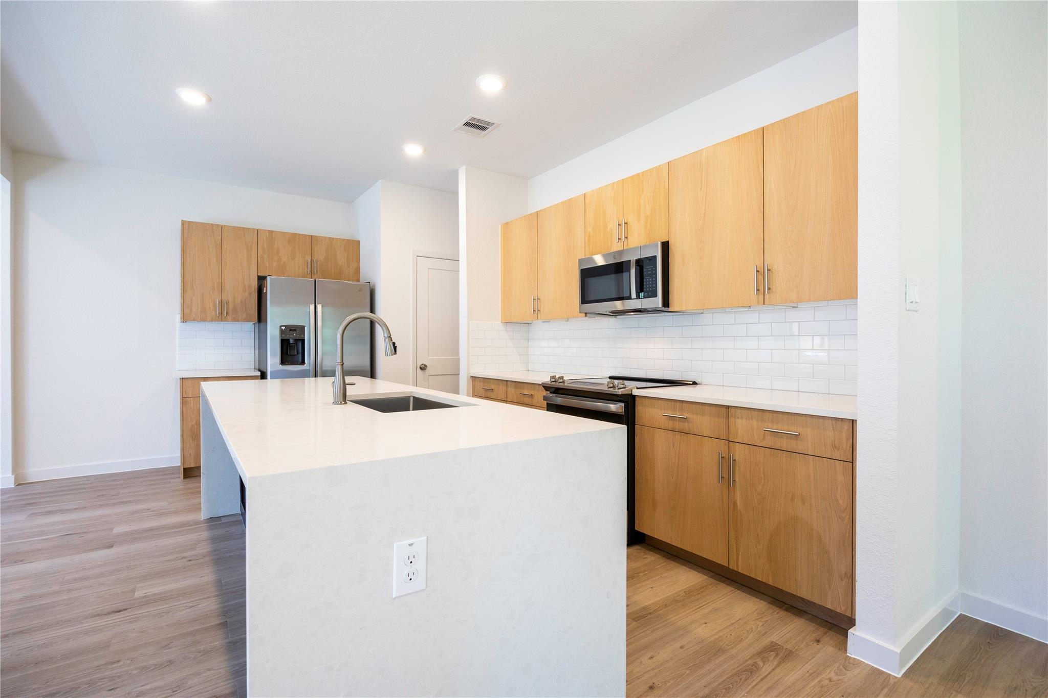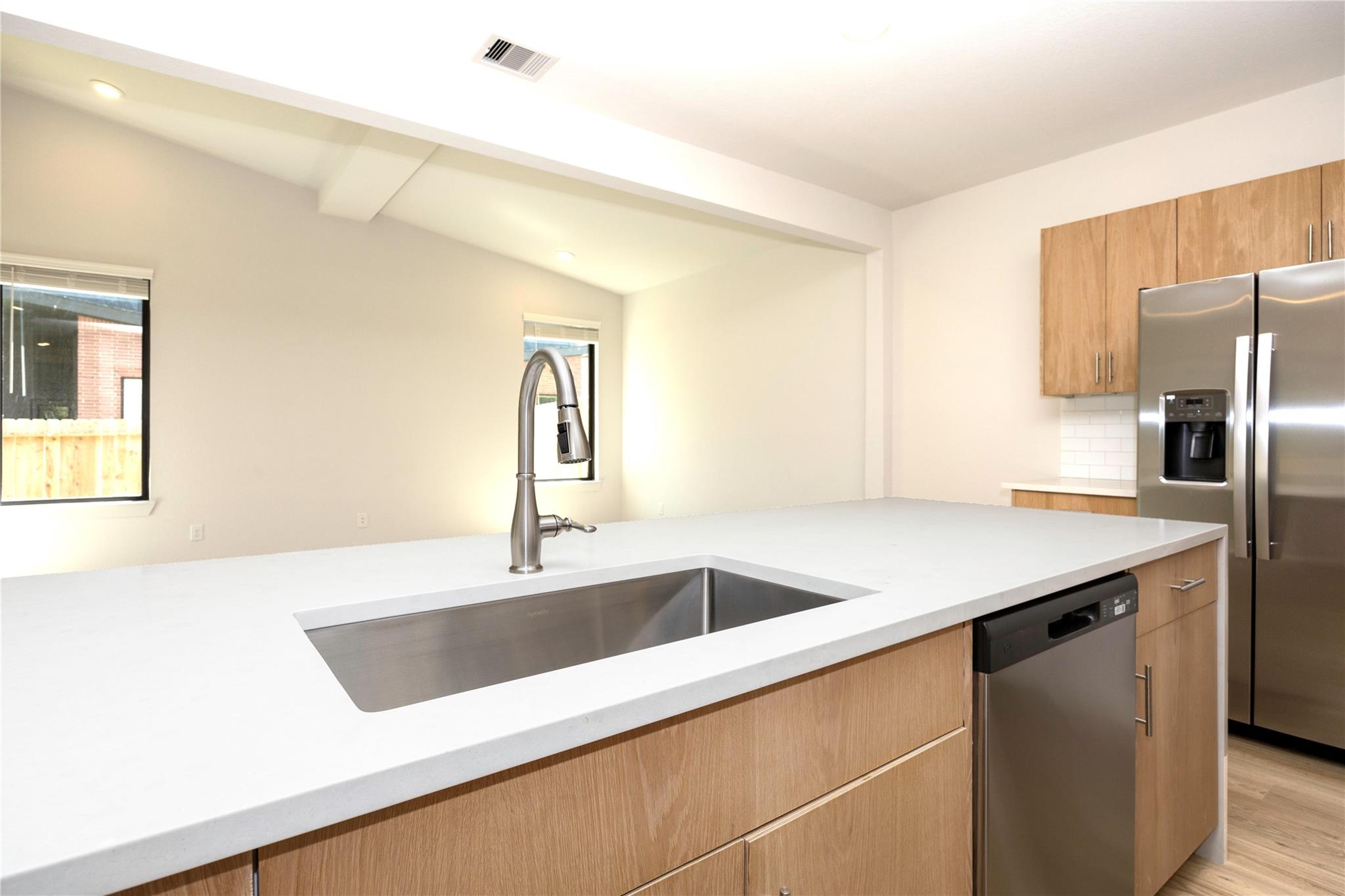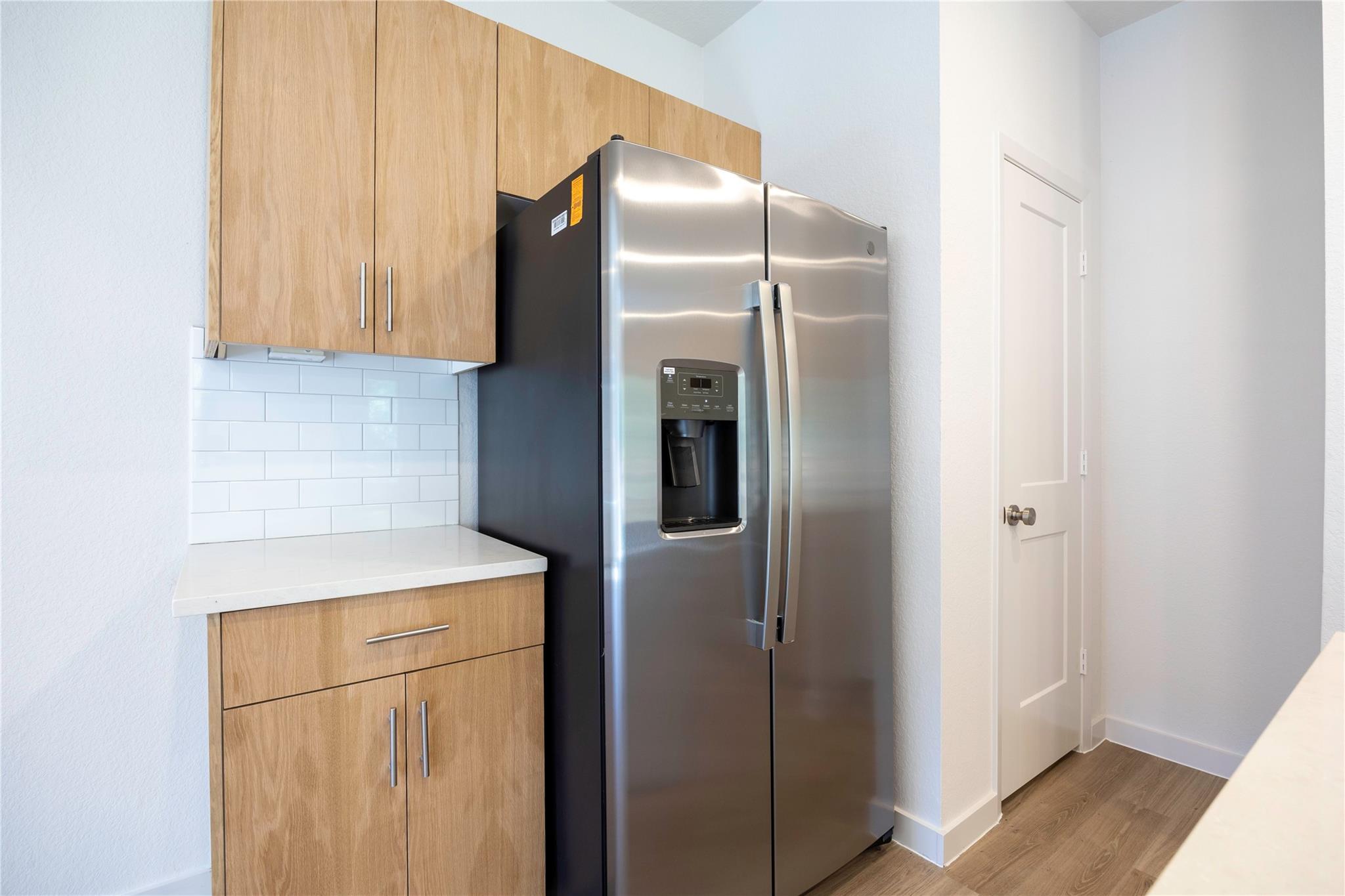 Modern Architecture Townhome! Both Units have 3 bedrooms and 2.5 bathrooms. First floor boasts bright open concept floor plan with high ceilings, gourmet style kitchen with quartz waterfall island, featuring GE stainless appliances/fridge included, soft close cabinets and walk in pantry that overlooks the living room. Large utility room and half bath downstairs. All bedrooms High Ceilings! Primary bedroom has crazy high ceiling! primary bath has 5ft walk in shower, two separate vanities and a walk-in closet. Luxury vinyl plank flooring throughout. Back yard is fenced has a patio and full yard sprinkler system. Check out the Matterport Tour For A Better Look Inside (Illustrates interior layout/Exterior features may vary)!