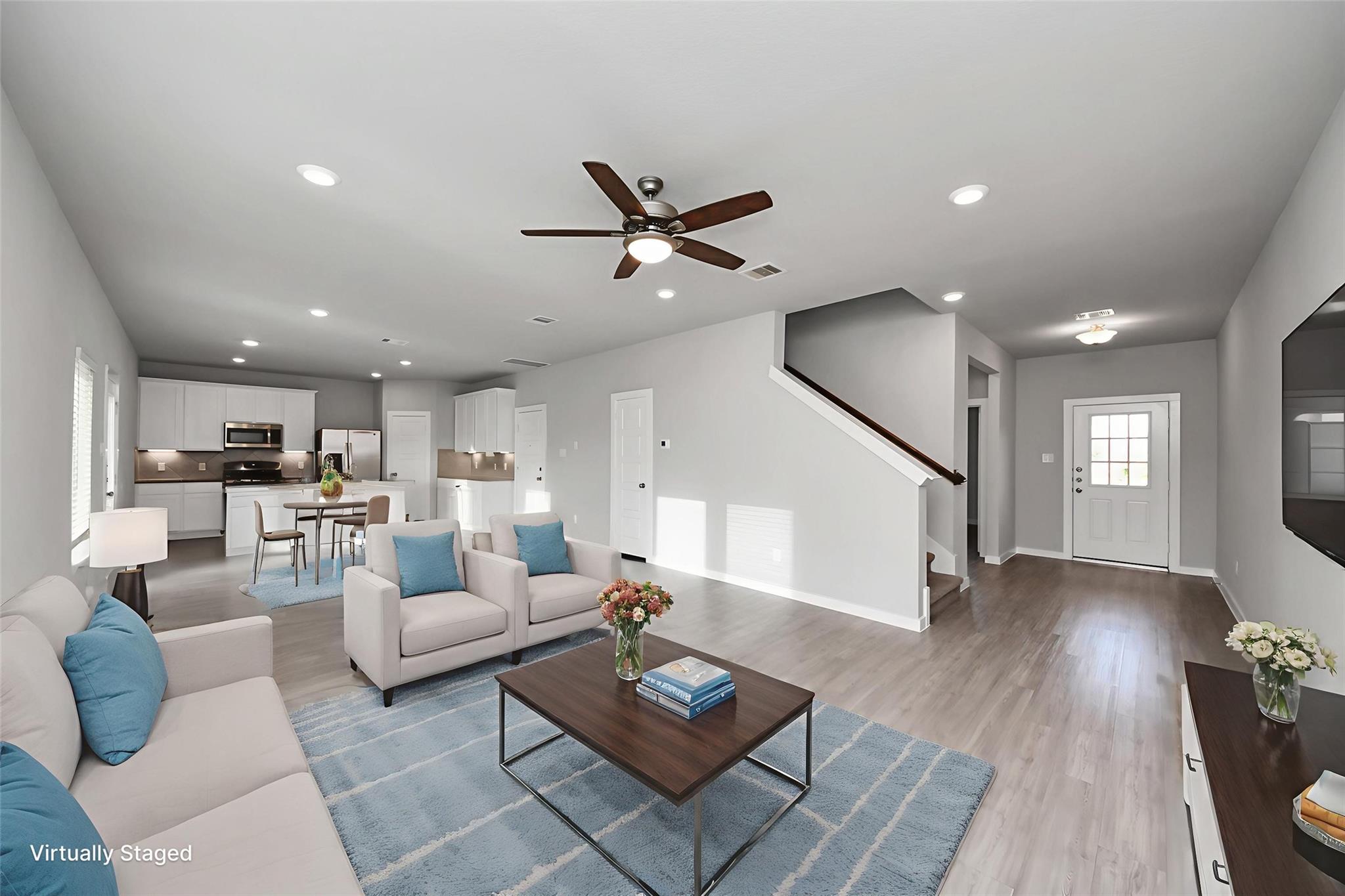 Beautiful two-story home featuring a modern open-concept layout and neutral finishes throughout. The spacious kitchen offers white cabinetry, granite countertops, stainless steel appliances, a large island, and ample storage, opening seamlessly to the living and dining areas—ideal for everyday living and entertaining. The home includes generously sized bedrooms, a private primary suite, and an upstairs game room/flex space. Additional highlights include recessed lighting, durable flooring in main living areas, plush carpet in bedrooms, and well-appointed bathrooms. Enjoy a covered entry, attractive brick and siding exterior, and a manageable backyard. Conveniently located with easy access to major highways, shopping, dining, and schools.