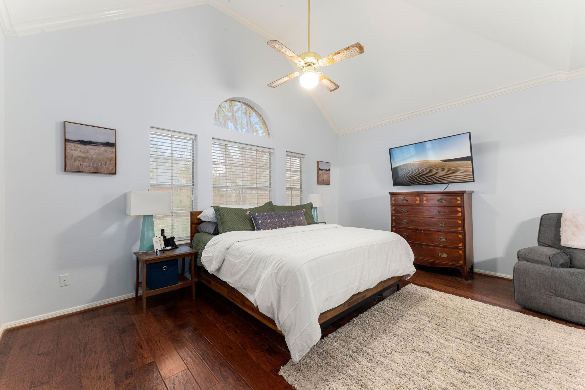 Located in the sought-after Pecan Grove golf course community, this Richmond gem blends comfort, style, and thoughtful updates. Set on a huge corner cul-de-sac lot, the two-story residence features 4 bedrooms, 3.5 baths, a dedicated office, and inviting formal living and dining spaces. Vaulted ceilings, engineered hardwood floors, and a striking fireplace create an elegant yet welcoming atmosphere. The island kitchen—with its walk-in pantry—is perfect for avid cooks. The main-level primary suite offers a comfortable retreat, with a complete bathroom renovation including new soaking tub, shower, tile and cabinetry. Three upstairs bedrooms, two full baths, and a spacious game room provide room to spread out. Outside, a flagstone-accented deck and pergola form an ideal backyard retreat. Additional highlights include a new hot water heater, a newer HVAC unit (1 of 2), and an oversized 2.5-car detached garage. This is the home you’ve been waiting for!
