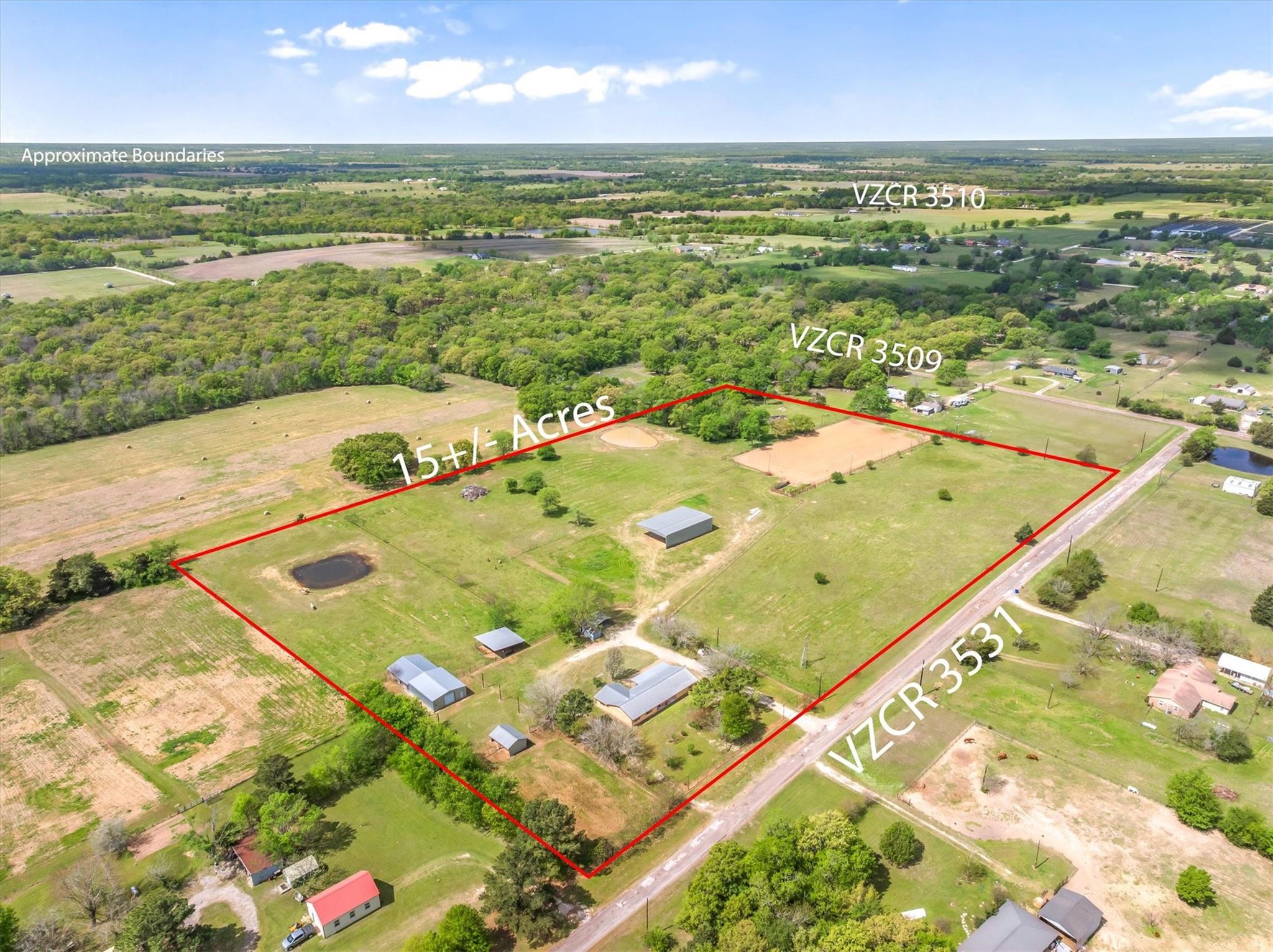 Country life with the convenience of modern updates on this 15 acre horse ranch in Ag, has updated ranch home, with well equipped horse barn, 2500 SF shop, arena, 2 ponds located just three miles from Highway 80 and within the desirable Edgewood ISD. Beautifully updated, ranch style 2,348 sq. ft. home offers all the country charm with warm wood plank walls, LED lighting, and a spacious galley kitchen with granite counter, a gas cooktop. Enjoy two living areas & a large master suite, luxurious bath, patio door overlooking open pasture views, & adjoining space could serve as a third bedroom or oversized closet. Equestrians will love the well-designed 3,750 sq. ft. horse barn featuring six partitioned stalls, tack room w saddle holders, a vet room, and guest or ranch-hand quarters complete with a half bath & kitchen. Property also includes a 50x50 shop building w elec, water connections, & 25x50 overhang. Nearly 1,000 feet of rd frontage. Ag exemption in place- out of city limits- No HOA.