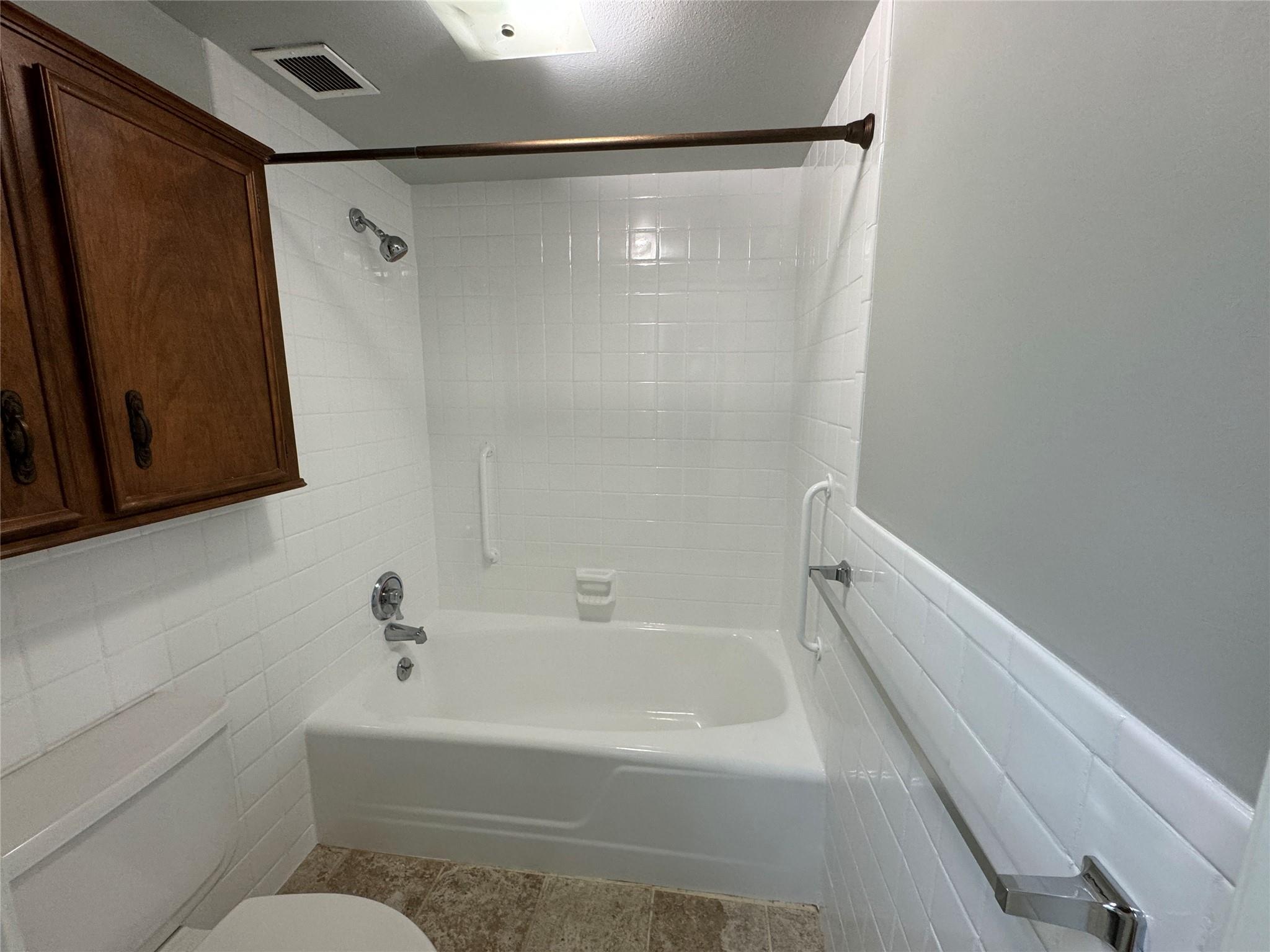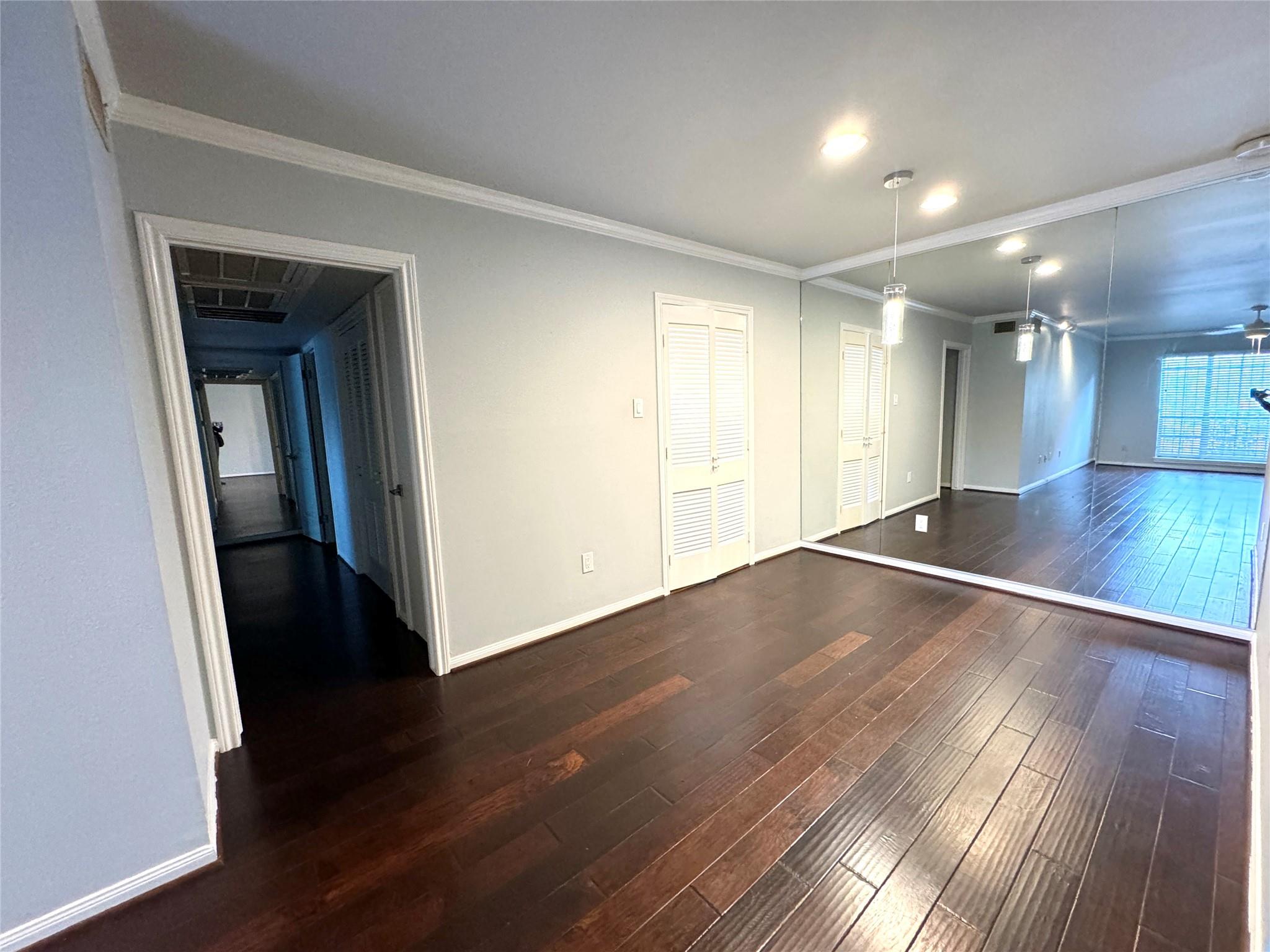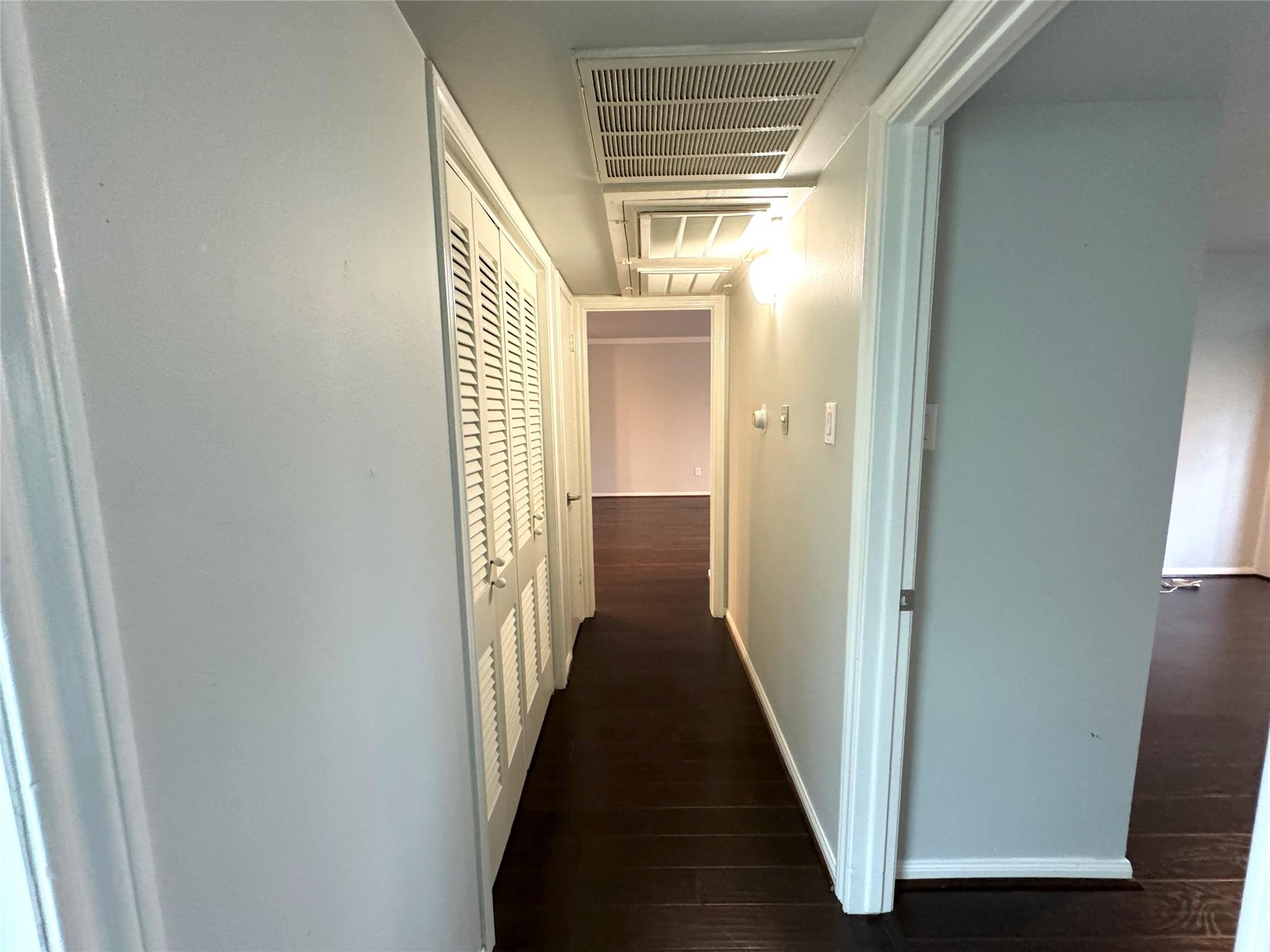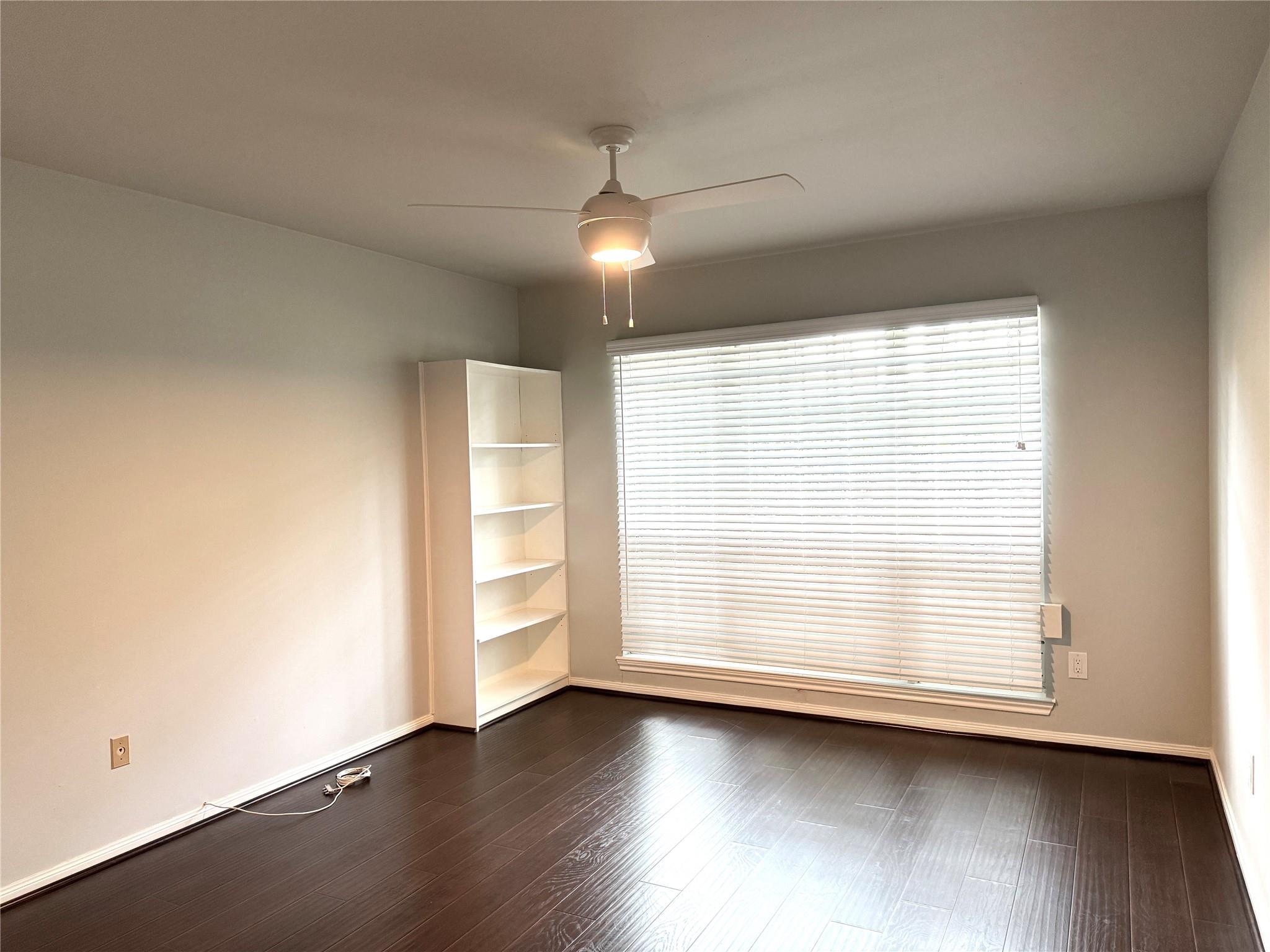 This is a beautifully updated 2B/2B condo with wood flooring and paneled doors. Remodeled kitchen has quartz counters and subway tile backsplash, electric range, built in microwave, dishwasher, disposal, 2 compartment ss sink with gooseneck faucet and plenty of storage. Kitchen cabinets have shaker style cabinet doors in pebble grey. One bath has a bathtub shower combination with tiled surround and a separate room for the lavatory. The primary bath has a tiled walk in shower. So many closets, you won't believe the storage capacity! Two covered parking spaces are included within a secured parking area and a dedicated exterior storage space as well. Central laundry located just steps away in the rear of the building. The location is optimal with Rice Village and the Med Center so nearby. Click on the link to enjoy the slide show. Make your appointment to see it today!