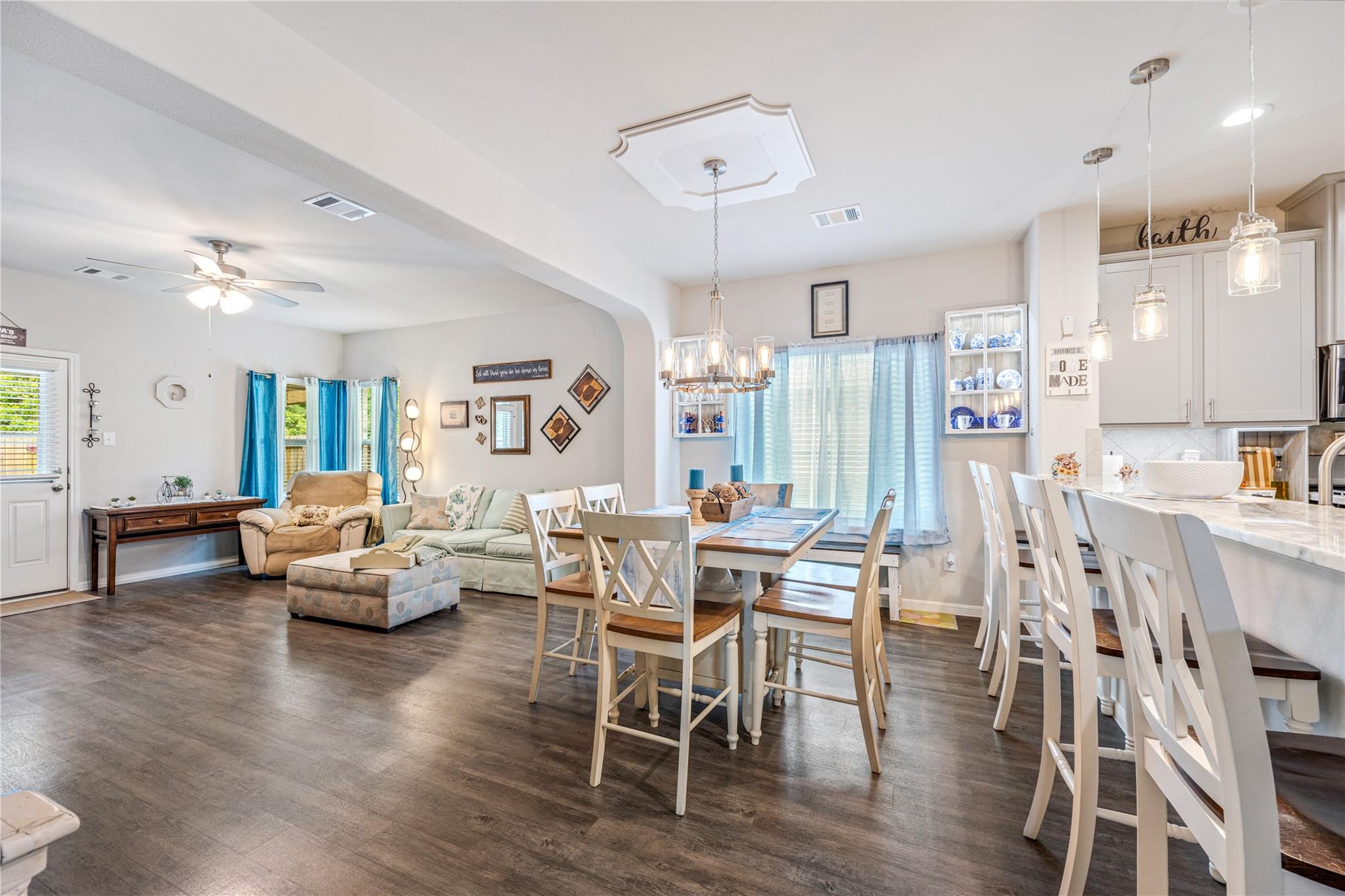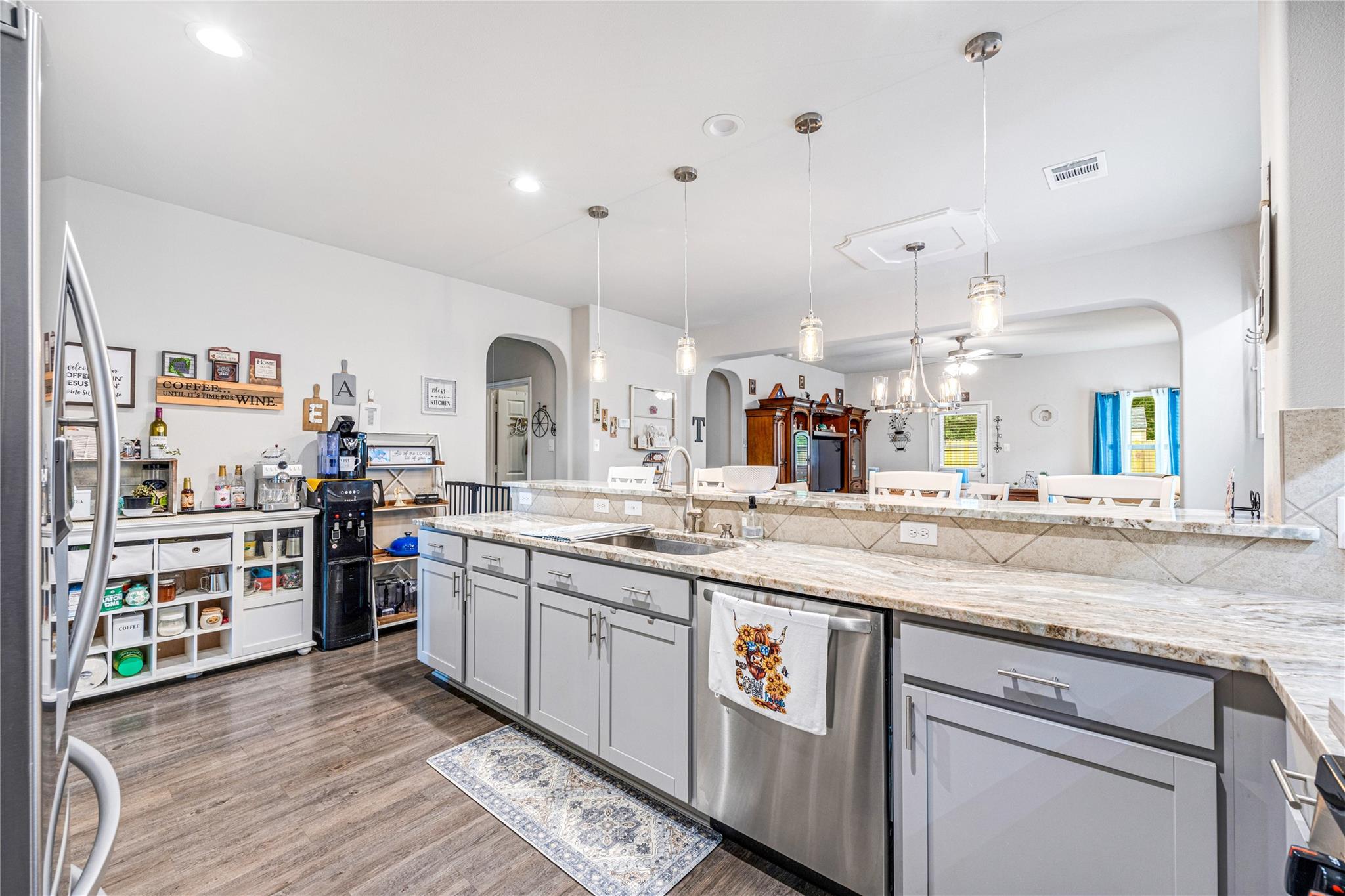 Welcome to this beautifully maintained one-story brick and stone home, built in 2021! This 3-bedroom, 2-bath home offers a functional and inviting layout, including a dedicated home office—perfect for working from home. The spacious living room flows seamlessly into the breakfast area and kitchen, creating an ideal space for everyday living and entertaining. The kitchen features 42” stone grey cabinets, granite countertops, LED lighting, and an undermount stainless steel sink. Step outside to a huge backyard with additional space beyond the fence—perfect for outdoor activities, gardening, or future expansion. A storage shed is also included for added convenience. This home combines modern finishes with plenty of space, inside and out!