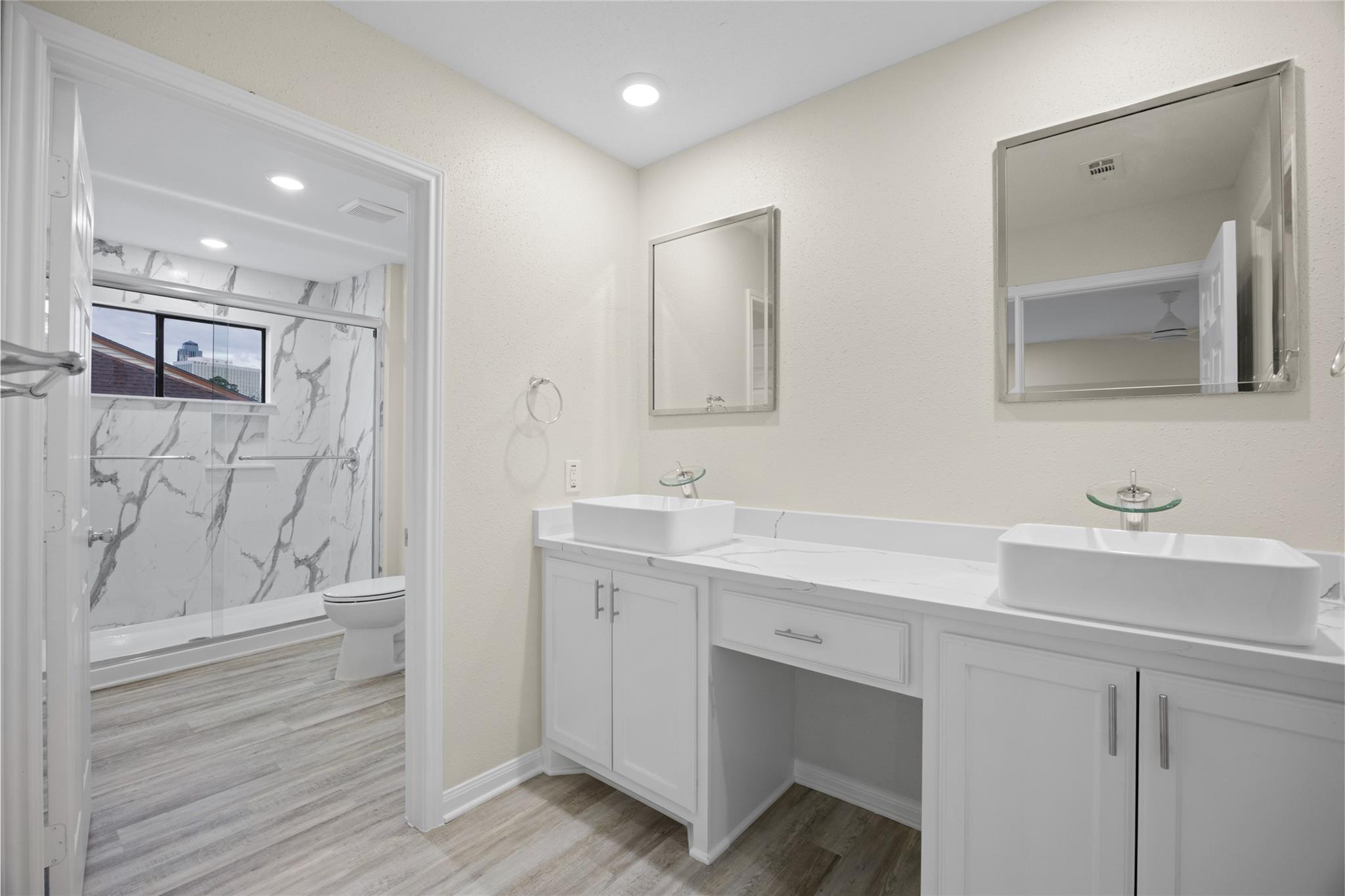 NEW KITCHEN & BREAKFAST AREA; SELF CLEANING RANGE; LG MASTER; NO CARPET; NEW BATH W/LARGE SHOWER; MARBLE WET BAR; 2 AREA POOLS W/SPAS; 1 FIREPLACE; OPEN DINING, LIVING & GAME RM; AMPLE CLST SPACE; 2 BALCONIES W/NEW TREX DECK & 1 PATIO; HIGH-END ;DEN W/SKYLIGHT-CONVERTIBLE TO BEDROOM; NEW AC & RENOVATED DUCT WORK; CABLE, WATER, SEWER, TRASH, INSURANCE PAID BY HOA; ATTCHD 2 CAR GARAGE; QUIET STREET even though it is located in Uptown/Galleria area. All Bedrooms Up,1 Living Area, Breakfast Room, Formal Dining, Gameroom Down/Den/Study, Kitchen/Dining Combo. 5 min drive to all major freeways 59/610/I-10. Galleria mall, RiverOaks district 5-10 min drive, all upscale restaurants, movie theatres, memorial park, 15 min drive to downtown and heights. Hard to find this price per/sq ft in this area for fully renovated house.