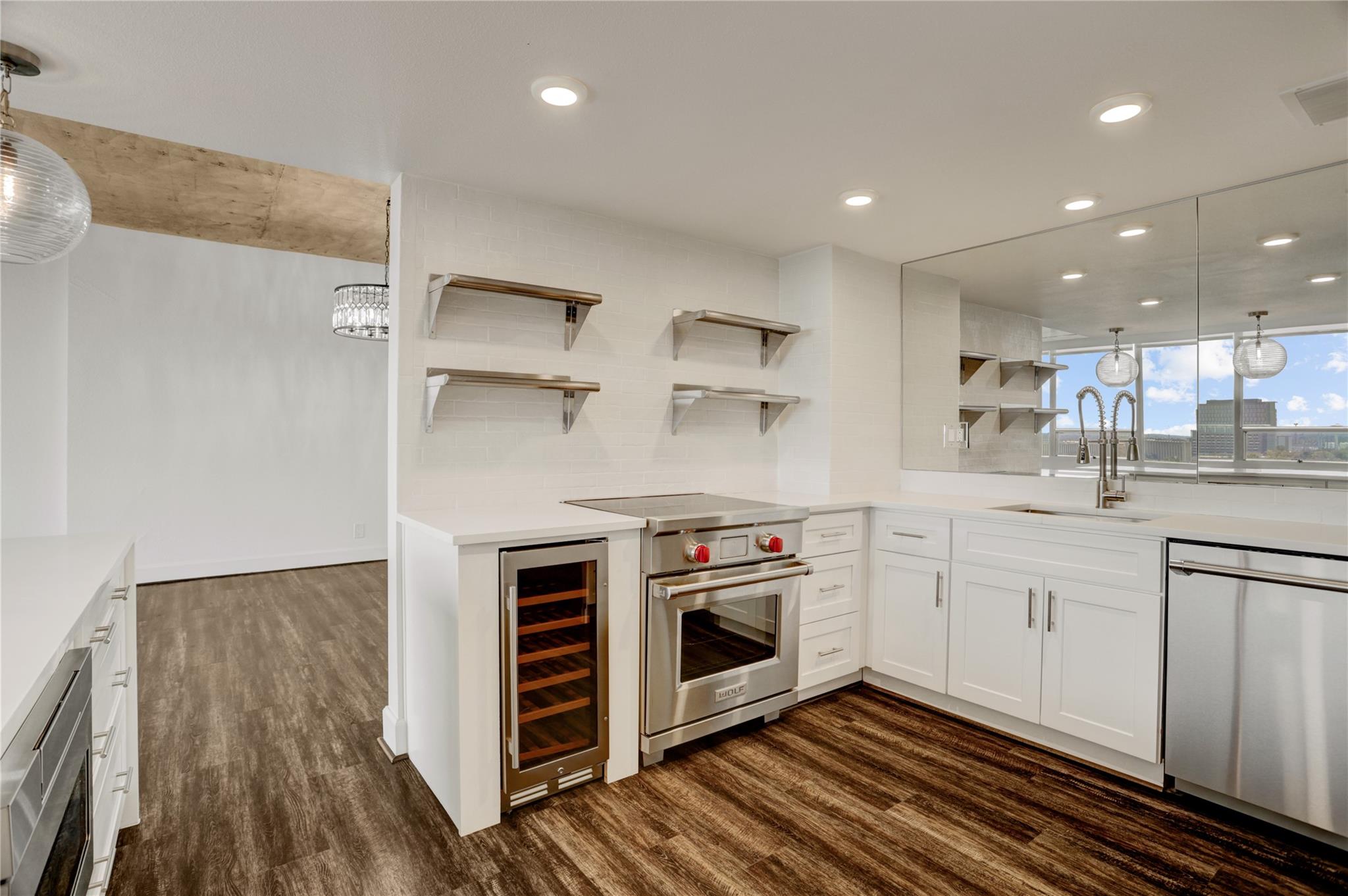 Experience elevated lock and leave living in this beautifully renovated 12th floor residence at The Regency House, an intimate boutique high rise set on three acres of lush, private grounds. This stylish home features an open concept living area with a modern kitchen, stainless appliances, beverage chiller, and a spacious utility closet with stacked washer/dryer and custom storage, plus a storage locker in basement. The refreshed bath impresses with a spa style walk in shower and elegant marble topped vanity. Easy care designer flooring flows throughout. Monthly HOA includes all utilities, basic cable, and internet—an exceptional value. Enjoy a recently upgraded fitness center and a tranquil pool with outdoor kitchen, perfect for relaxing or entertaining. Ideally located minutes from premier shopping, dining, Downtown, the Medical Center, and the Galleria. With a walk score of 92, enjoy Whole Foods, Armando's, Giacomo's, Relish, Tootie's and Kuhl-Linscomb just to name a few favorites.