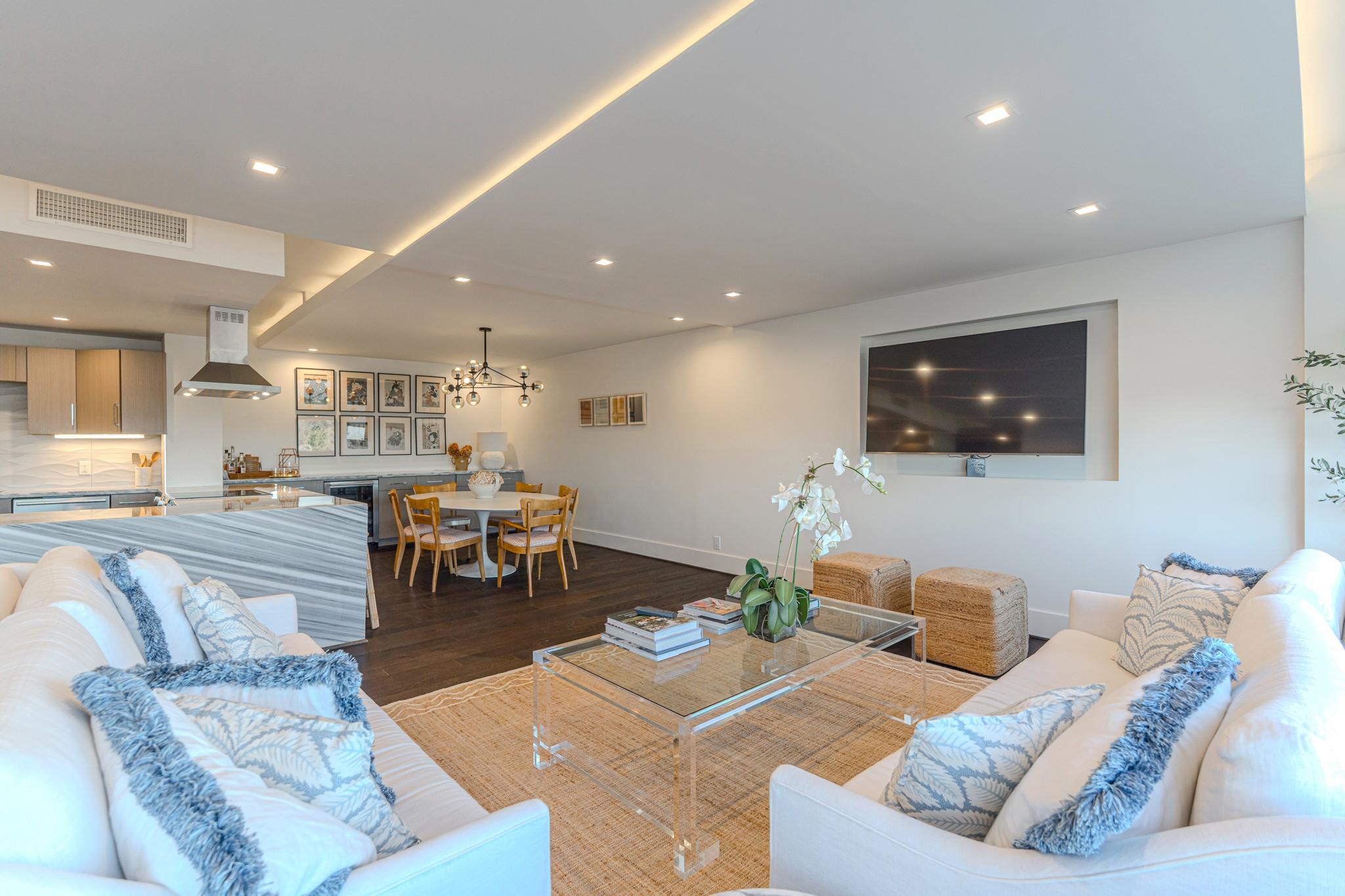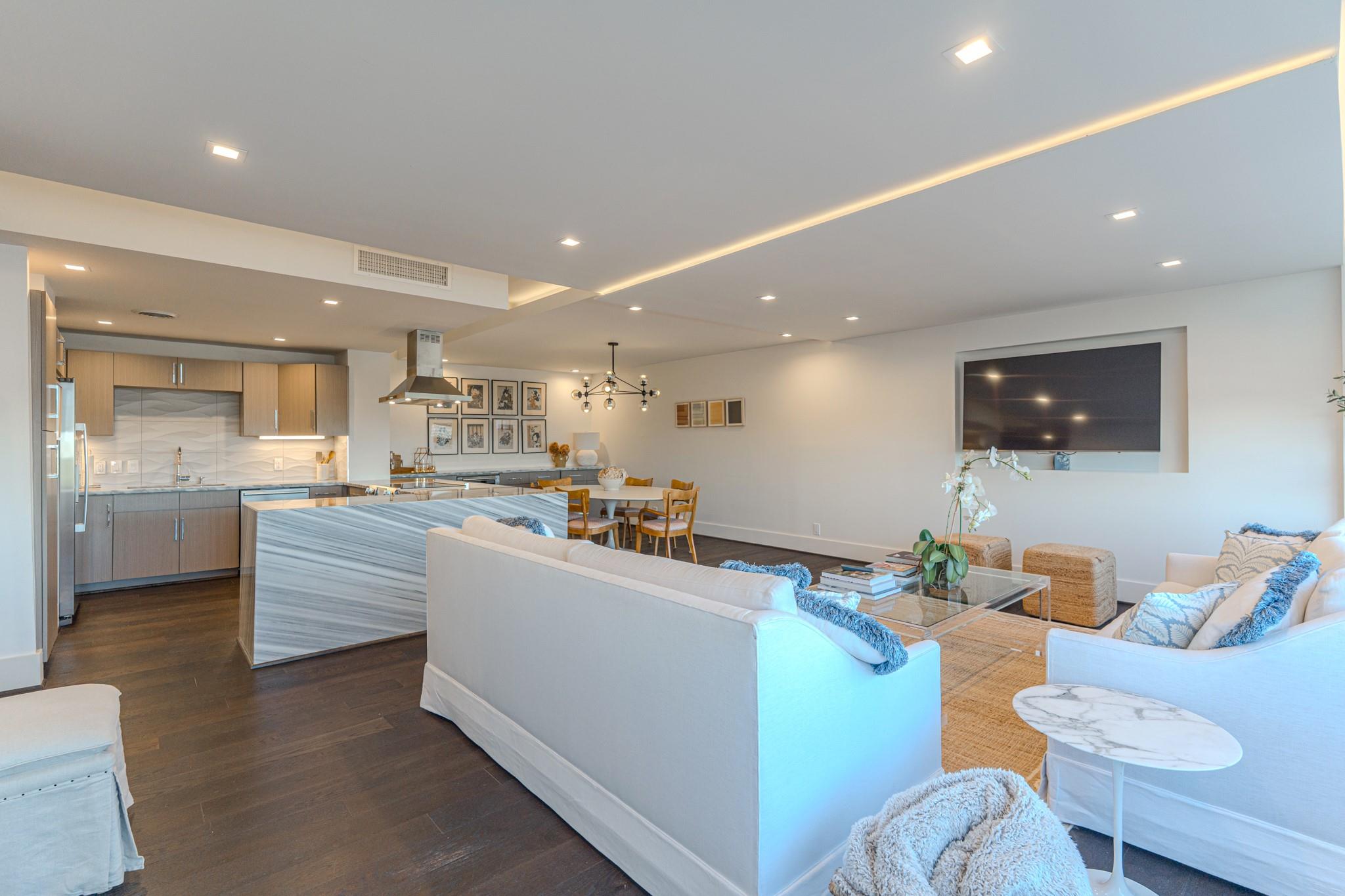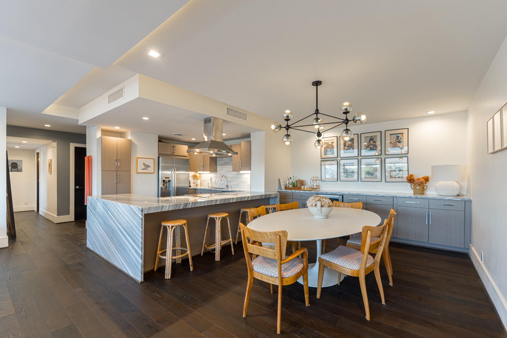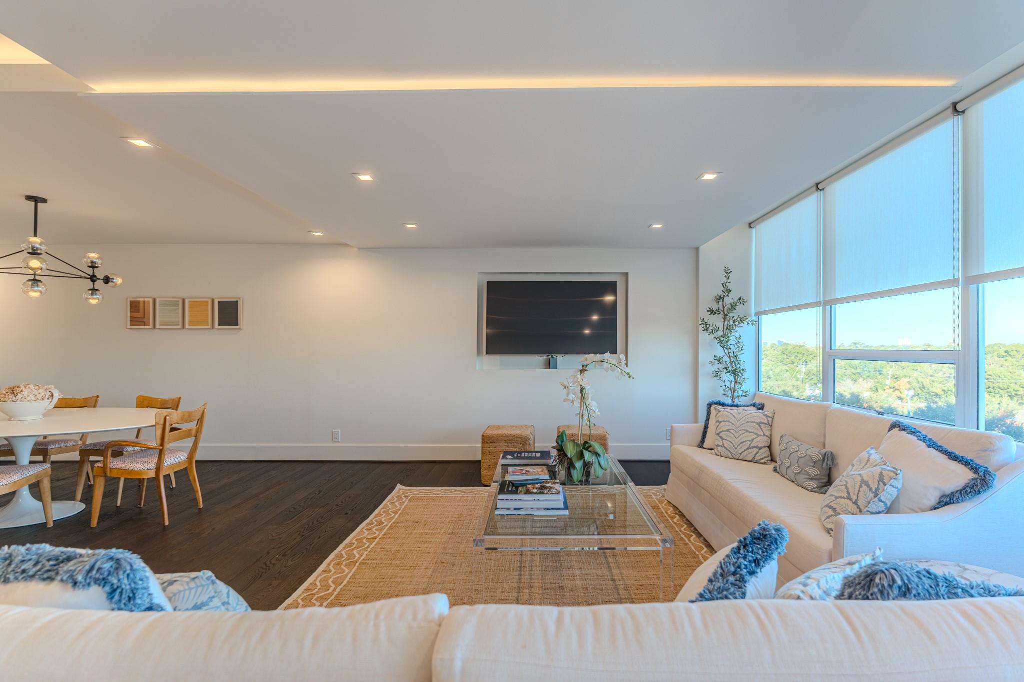 The Regency House is a full-service building with a 2-acre park-like backyard and concierge. All bills, including basic cable and internet, are covered by the monthly HOA fee. This stunning remodeled 2-bedroom, 2-bath unit faces north, offering abundant natural light and views of River Oaks. The open concept layout features a large waterfall island with Italian marble, Bosch appliances, and a 3D architectural floating ceiling with LED lighting. The primary bedroom boasts an en-suite bath with double sink and walk-in shower. Engineered wood floors, GROHE fixtures, and custom California Closets complete the space. Located in the desirable Upper Kirby area, close to shopping, dining, and Whole Foods. Welcome home!