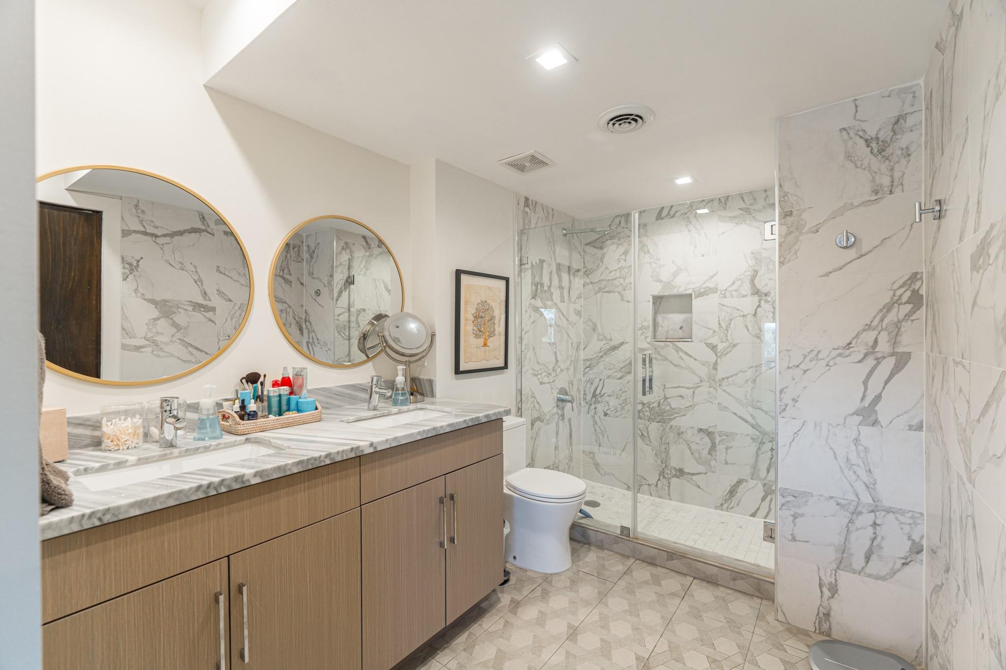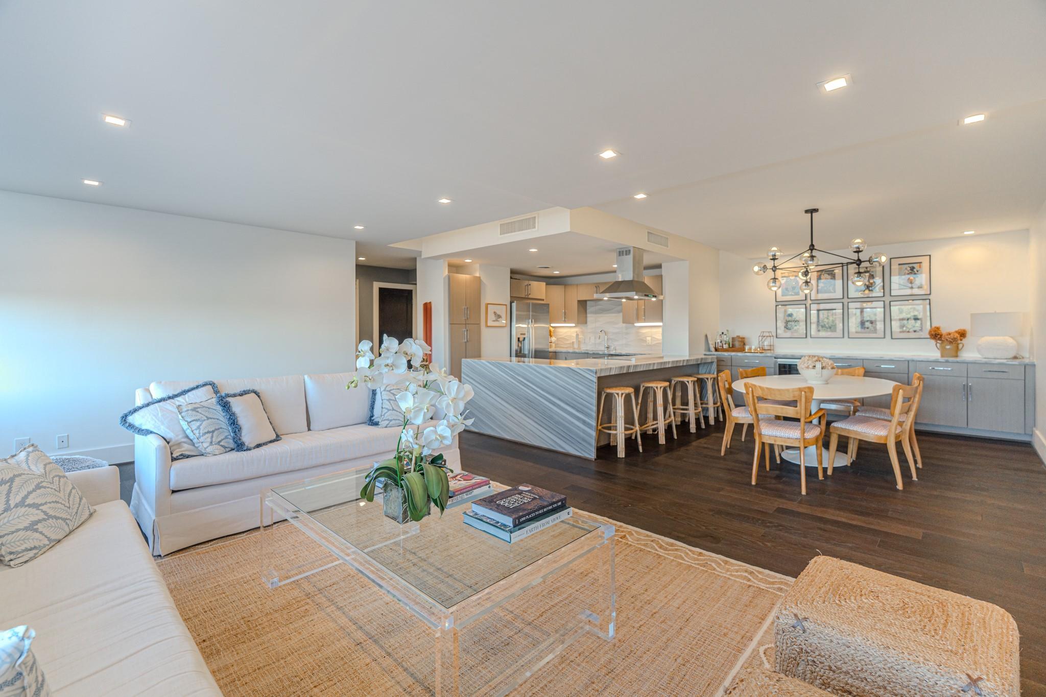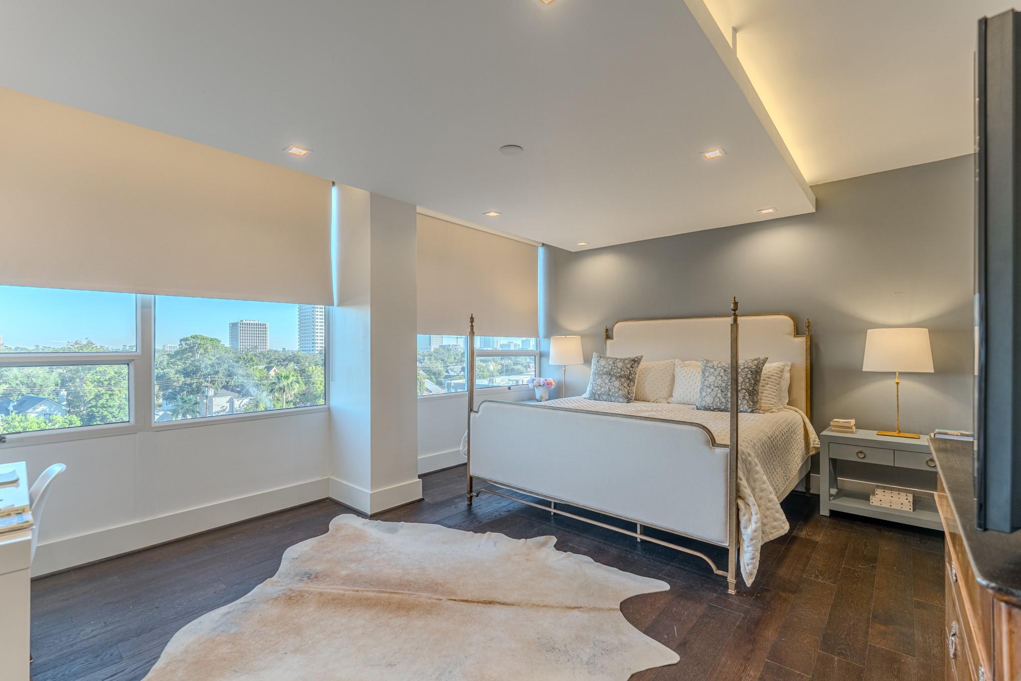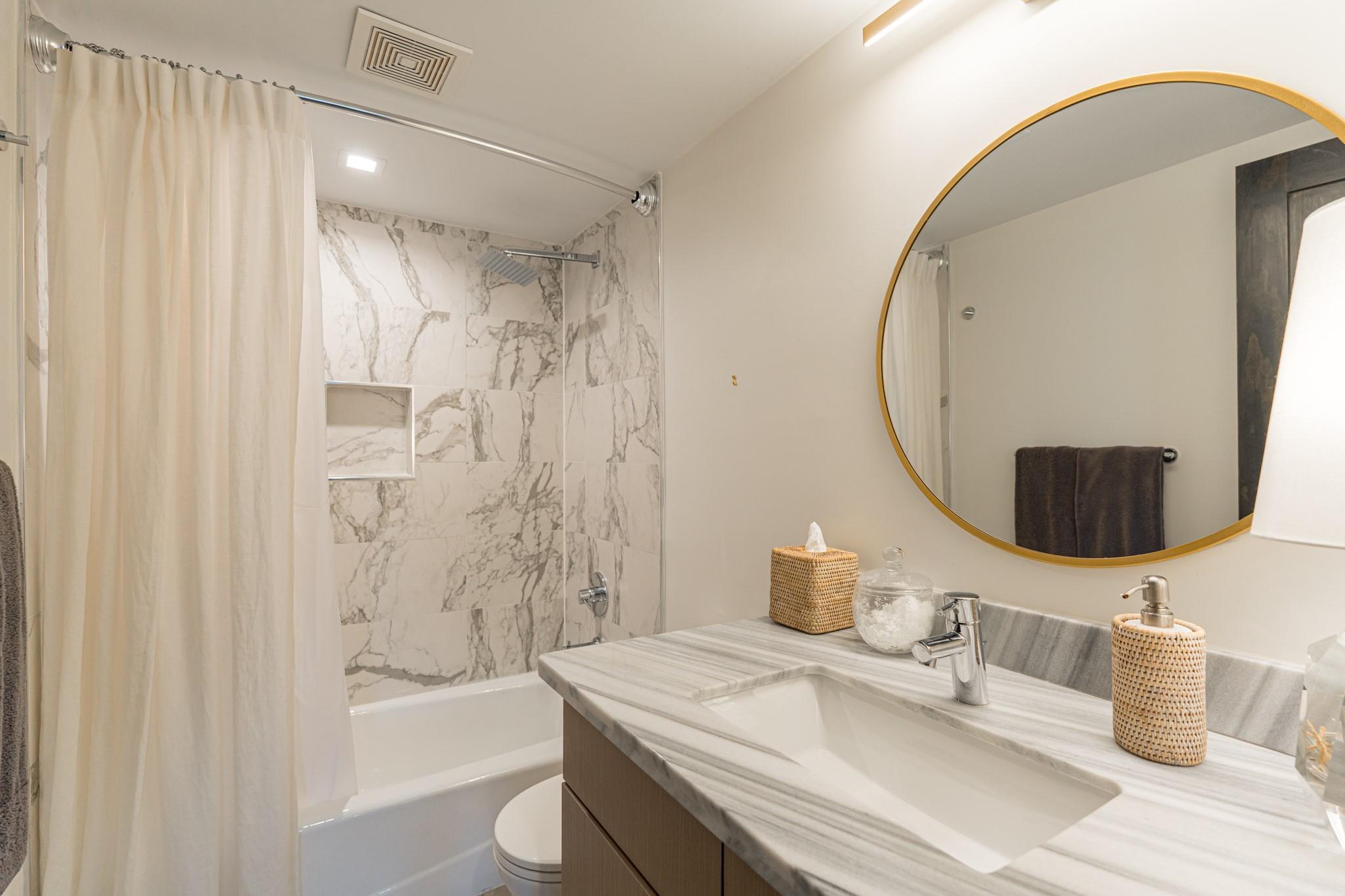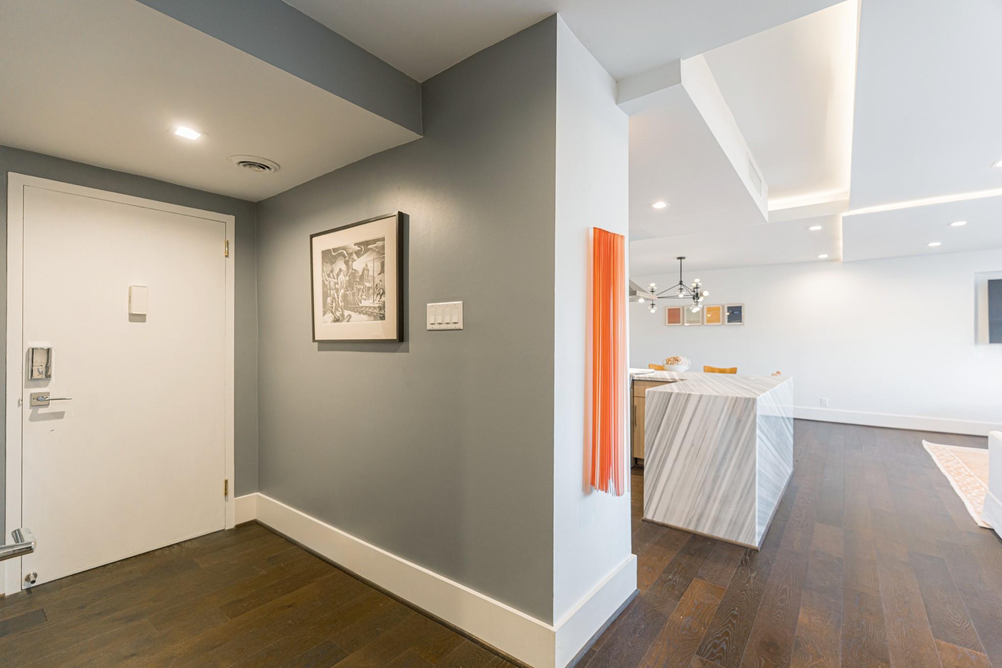 The Regency House is a full-service building with a 2-acre park-like backyard and concierge. All bills, including basic cable and internet, are covered by the monthly HOA fee. This stunning remodeled 2-bedroom, 2-bath unit faces north, offering abundant natural light and views of River Oaks. The open concept layout features a large waterfall island with Italian marble, Bosch appliances, and a 3D architectural floating ceiling with LED lighting. The primary bedroom boasts an en-suite bath with double sink and walk-in shower. Engineered wood floors, GROHE fixtures, and custom California Closets complete the space. Located in the desirable Upper Kirby area, close to shopping, dining, and Whole Foods. Welcome home!