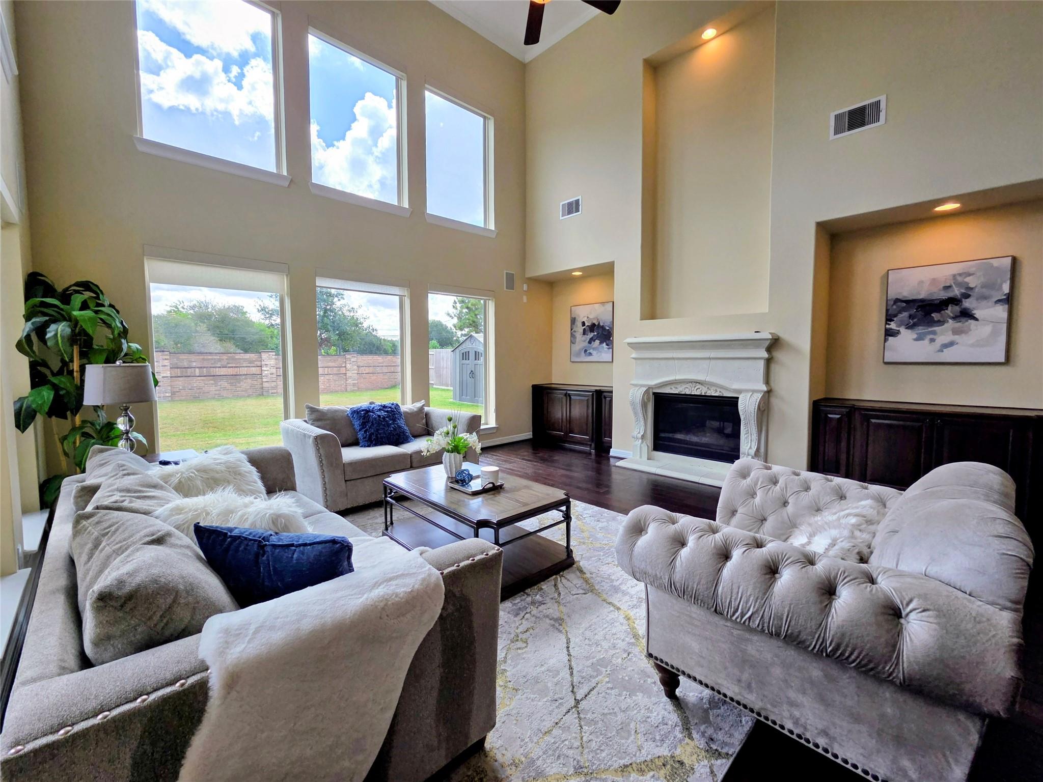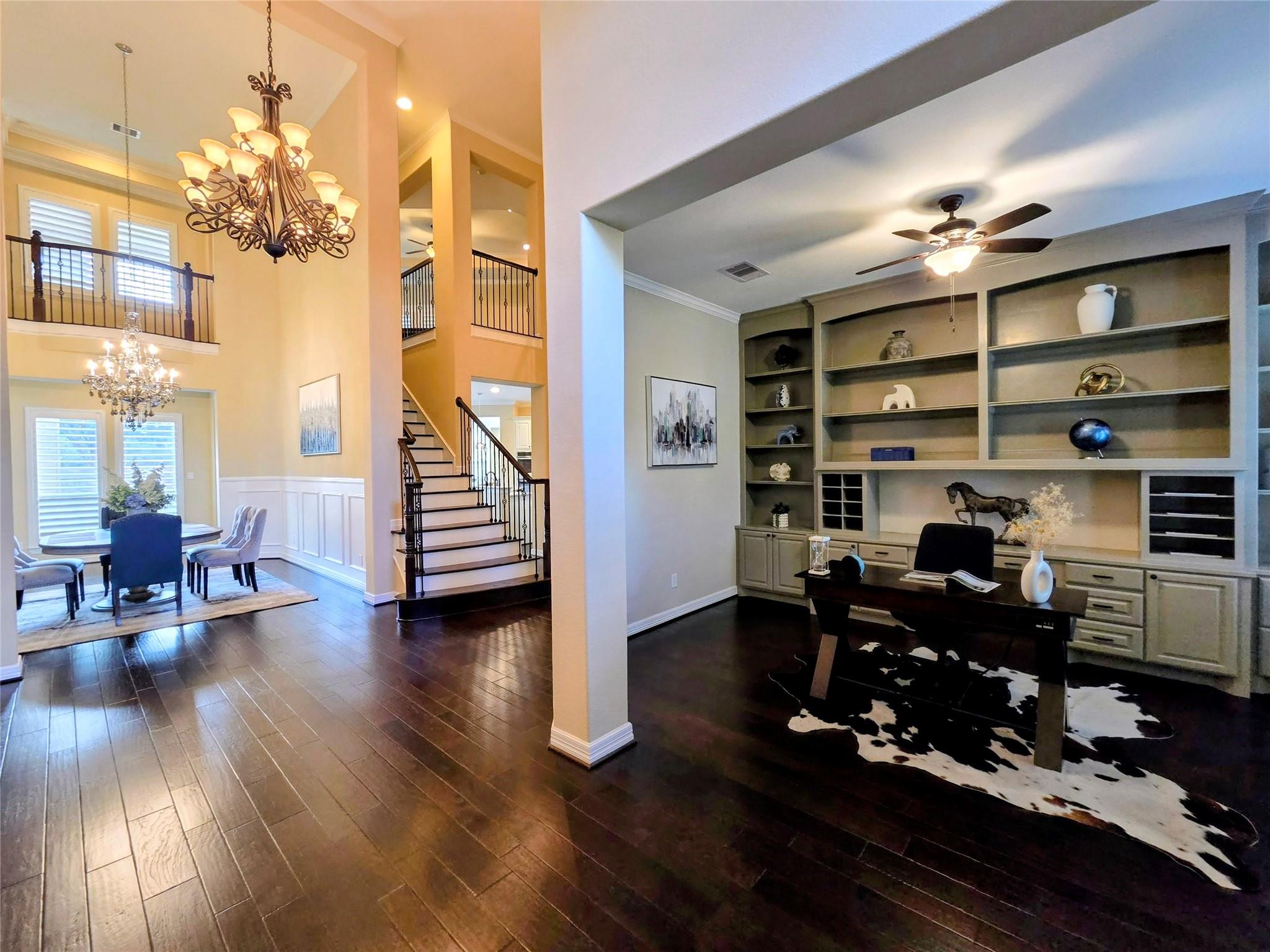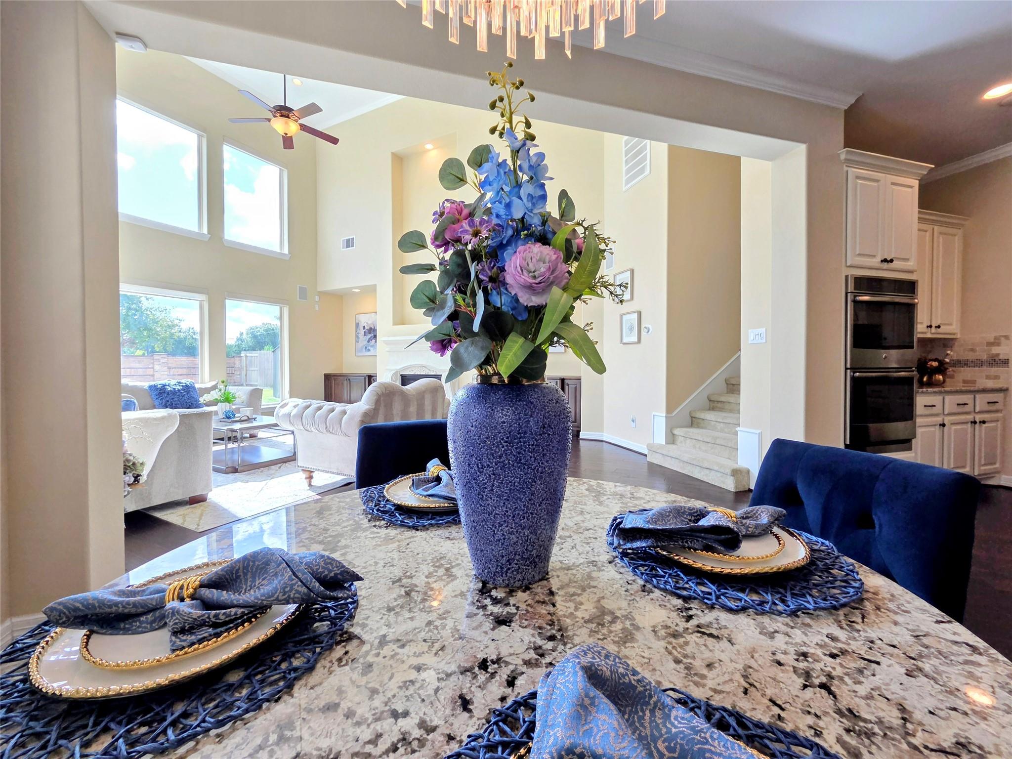 InteriorFireplace:2/Gas ConnectionsFloors:Carpet,Tile,WoodBedroom Desc:2 Bedrooms Down,Primary Bed - 1st Floor,Walk-In ClosetKitchen Desc:Island w/o Cooktop,Kitchen open to Family Room,Walk-in PantryRoom Description:Den,Family Room,Formal Dining,Formal Living,Gameroom Up,Home Office/Study,Living Area - 1st Floor,Media,Utility Room in HouseHeating:Central GasCooling:Central ElectricConnections:Electric Dryer Connections,Gas Dryer Connections,Washer ConnectionsDishwasher:YesDisposal:YesMicrowave:YesRange:Gas Cooktop,Gas Range,GrillOven:Double OvenEnergy Feature:Ceiling Fans,Digital Program ThermostatInterior:2 Staircases,Alarm System - Owned,Fire/Smoke Alarm,Formal Entry/Foyer,High Ceiling,Intercom System,Prewired for Alarm System,Water Softener - Owned