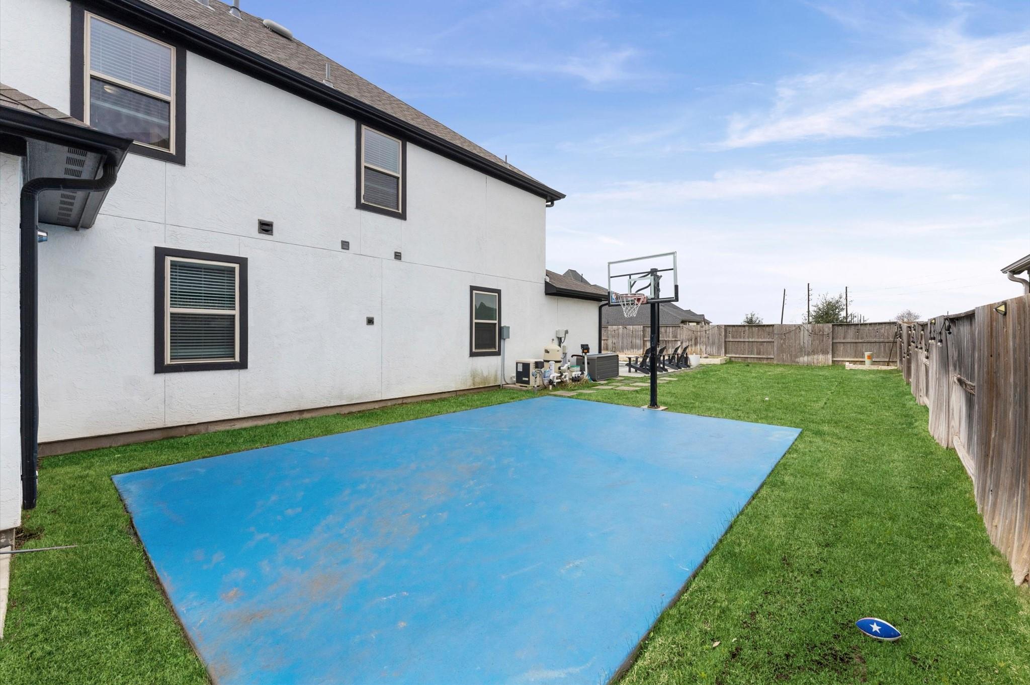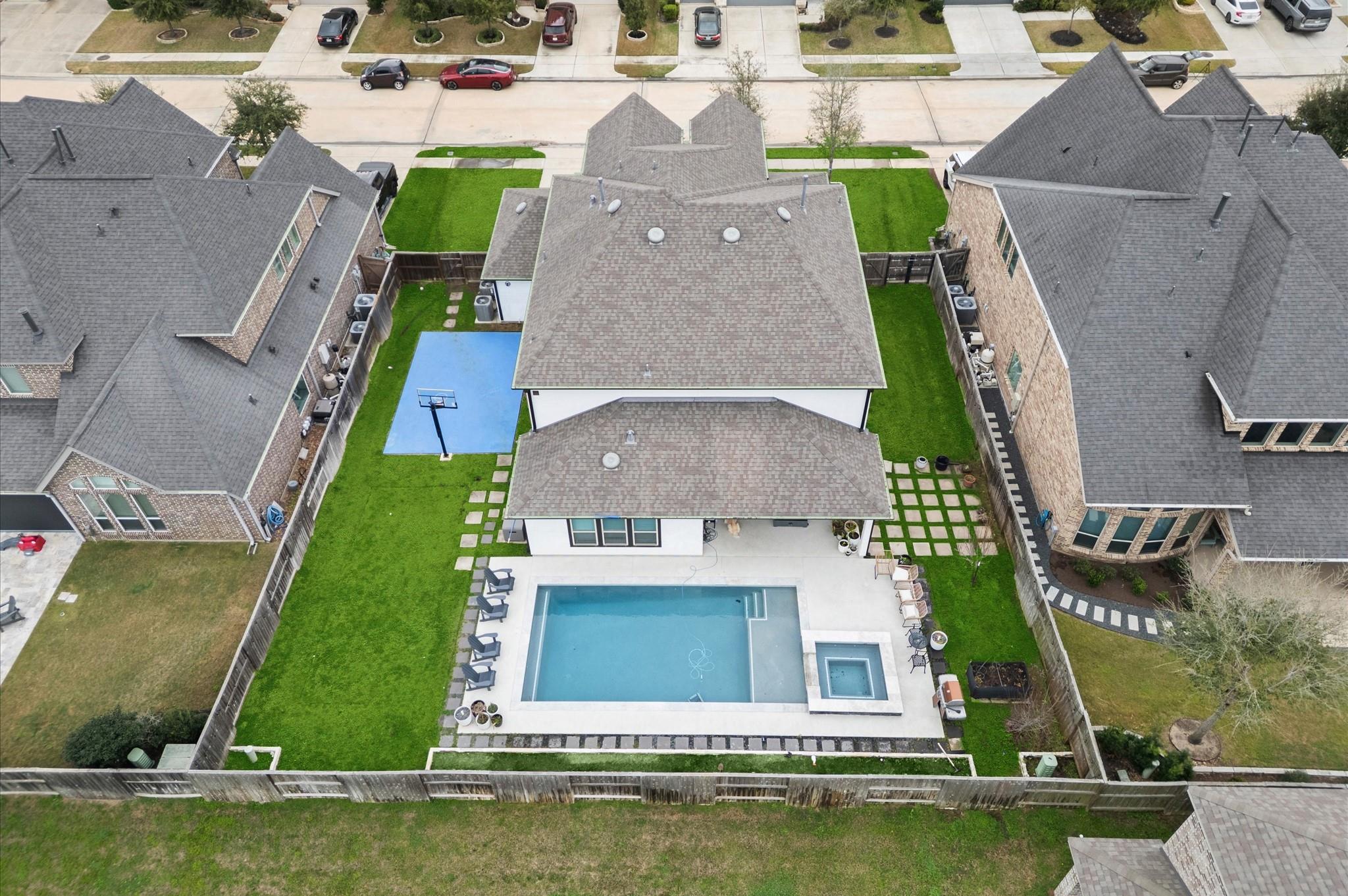 Stunning Taylor Morrison home built in 2019 in the highly desirable Cane Island community with no back neighbors! This open-concept two-story features a dramatic family room flowing into the dining area and gourmet kitchen with oversized island, stainless steel appliances, and ample cabinetry. A private first-floor guest suite offers flexibility for multigenerational living or a home office. The spacious primary suite includes a sitting area for added comfort. Upstairs boasts a large game room, media room, three secondary bedrooms, and two full baths. Enjoy your private backyard oasis with a sparkling pool and small basketball court area, plus a covered patio, oversized lot, 3-car garage, and large driveway.