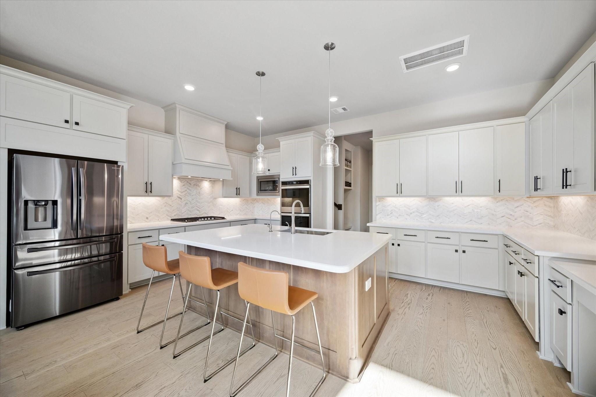 Gracefully situated within the inspiring natural surroundings of Woodson’s Reserve, this stately home exudes sophistication. The Maltese Classic plan offers modern convenience and effortless flow through its open floorplan and neutral finishes. Featuring 4 generously sized bedrooms, with two bedrooms located on the main level, this home is crafted for both comfortable living and elevated entertaining. The rooms are generously sized, featuring soaring ceilings and abundant windows that provide abundant natural light. The chef’s kitchen is open to the casual dining space and living room with a large central island, ample cabinet and counter space and a convenient chef’s desk. A laundry, mud area and walk-in pantry provide clutter containment, located near the bonus second staircase. Upstairs, oversized game and media rooms afford endless entertainment options. Outdoors, dine alfresco under the covered patio complete with a summer kitchen designed for year-round enjoyment.