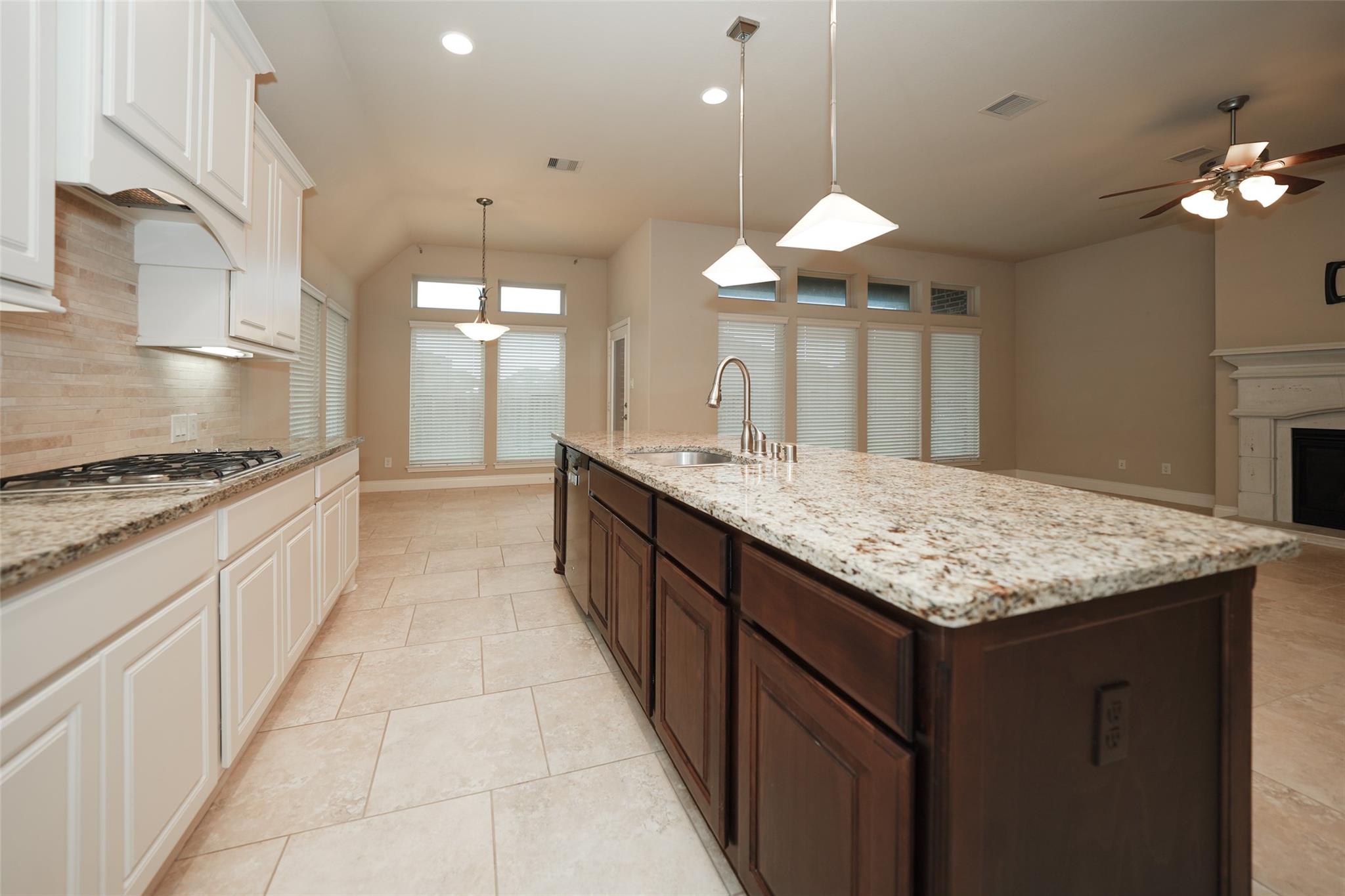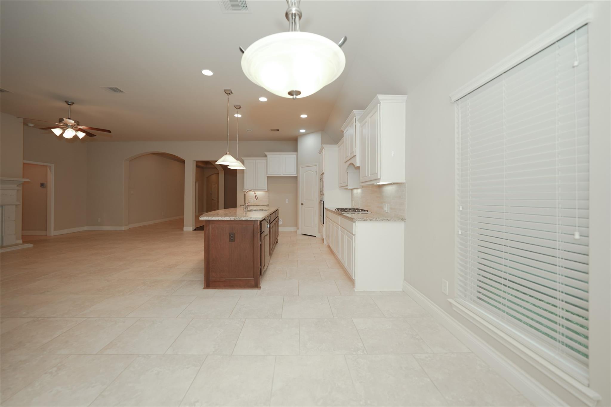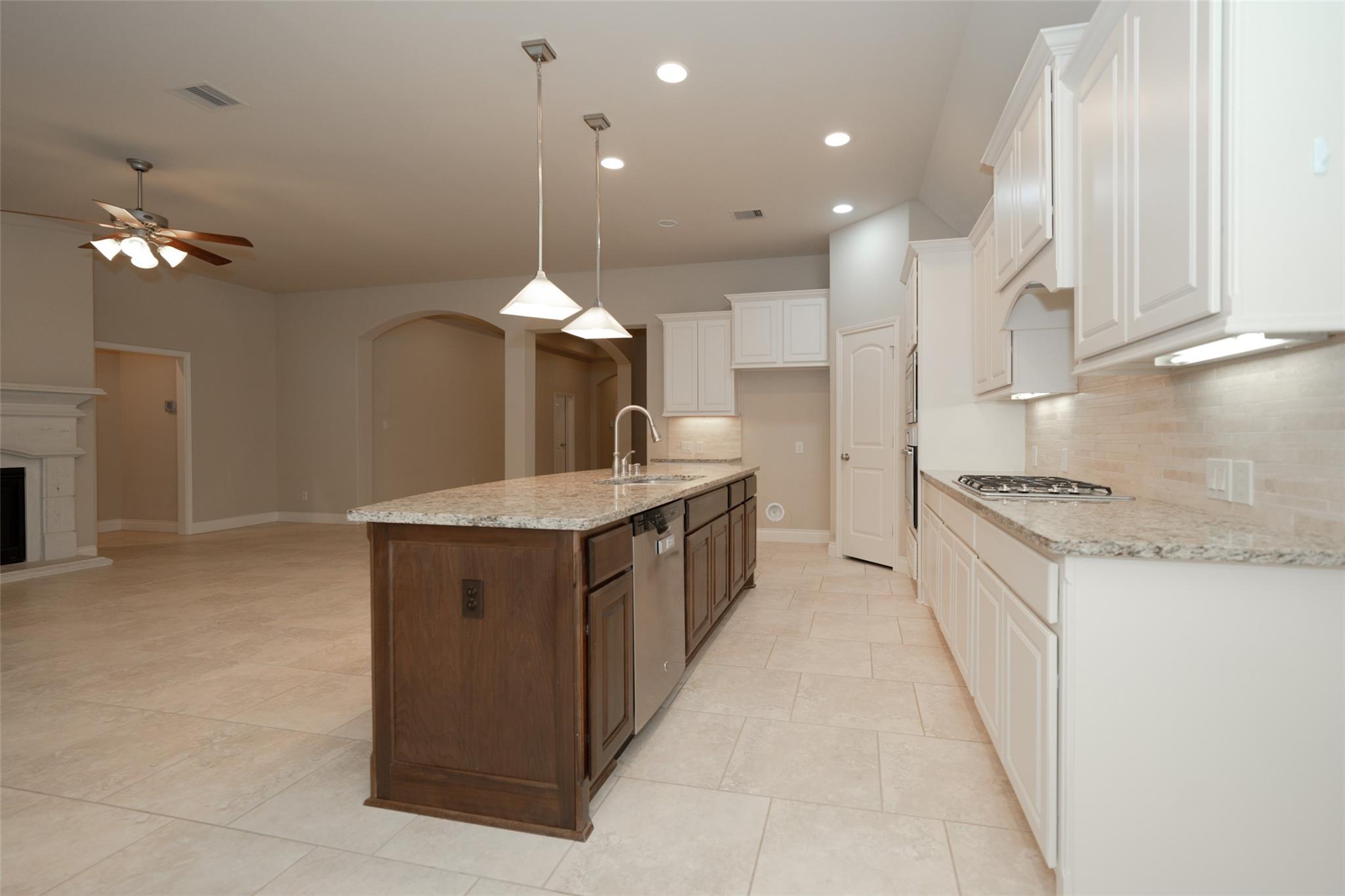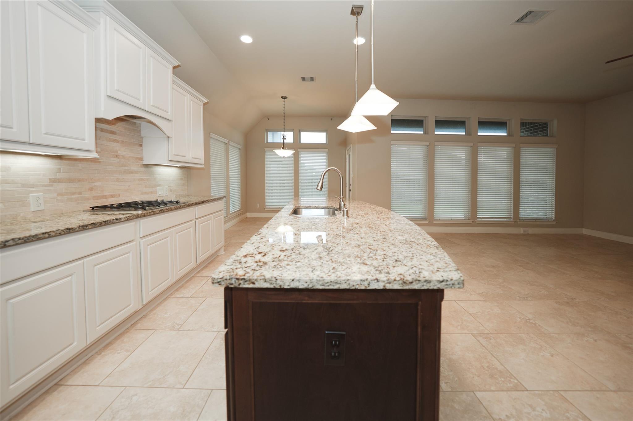 MOVE IN READY-one-story Perry Homes design offering 4 bedrooms, 3 full bathrooms, and 2,922 sq. ft. of well-designed living space. A wide entry hallway and tall ceilings create a welcoming first impression, opening to an airy, light-filled layout with large rear-facing windows. The kitchen features white cabinetry, granite countertops, stainless steel appliances, tile backsplash, and a spacious center island with contrasting dark wood—ideal for everyday living and entertaining. Adjacent spaces include a dining area and a versatile gameroom with double glass doors. The private primary suite includes dual sinks, granite counters, a separate shower, garden tub, and walk-in closet. Tile flooring extends through the main living areas with carpeted bedrooms. The brick-and-stone exterior, covered front entry, and fenced backyard enhance curb appeal. Located just a short walk from the Tamarron clubhouse with access to the community pool, splash pad, fitness room, and outdoor recreation area