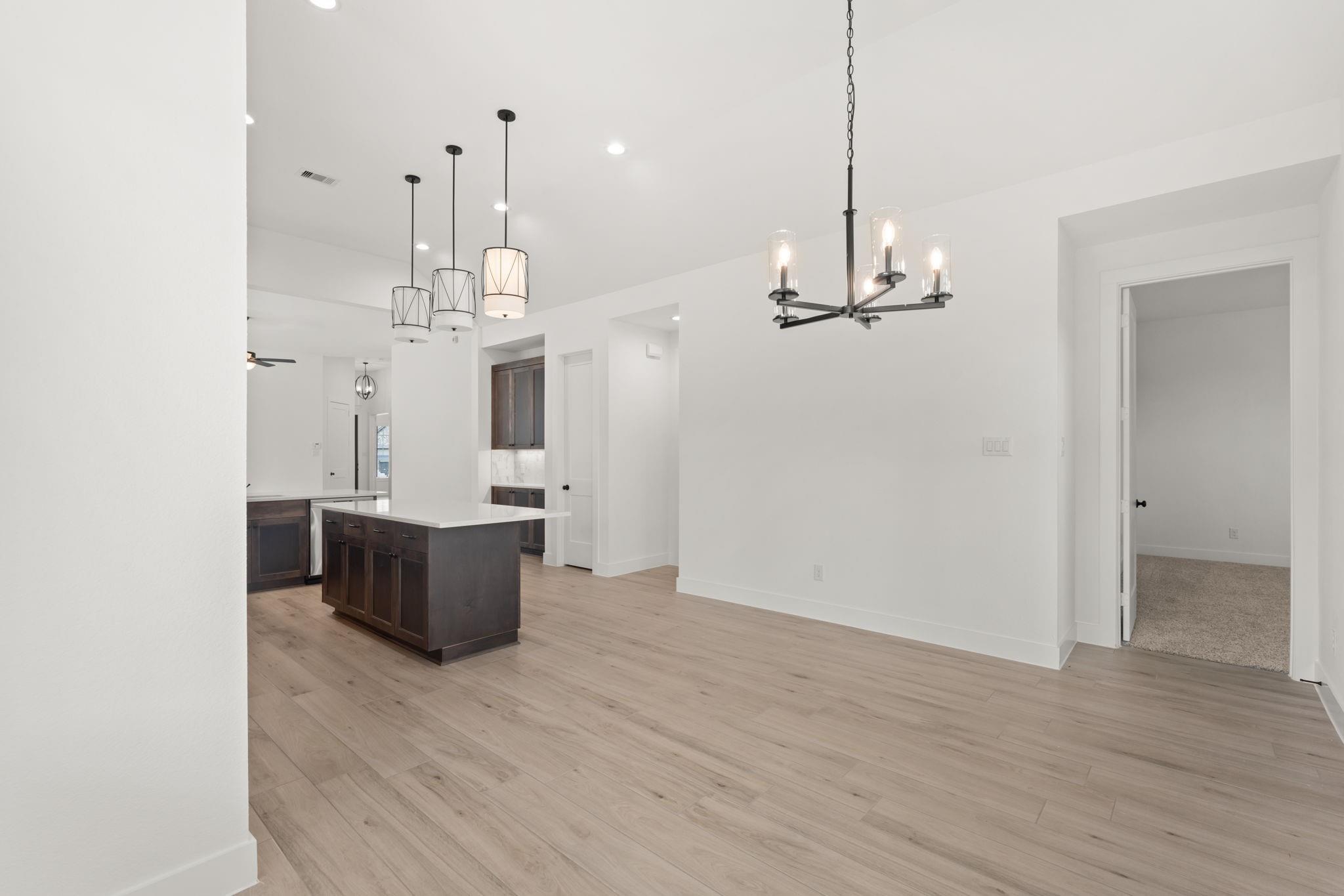 New Construction by Chesmar Homes – Beautiful Oakley Plan in The Trails! This thoughtfully designed one-story, energy-efficient home is nestled on a desirable cul-de-sac lot with no back neighbors and offers 3 bedrooms, a private study, 2.5 baths, and a spacious 2.5-car garage. Inside, enjoy an extended foyer, elegant 8’ interior doors, and an open-concept layout featuring soaring 10’–12’ ceilings throughout. The chef’s kitchen is appointed with 42” designer cabinetry with crown molding and under-cabinet lighting, 3CM granite countertops, an oversized island with pendant lighting, and GE stainless steel appliances including a 5-burner gas range, vent hood, microwave, dishwasher, and refrigerator. The luxurious owner’s retreat includes dual vanities, a soaking tub, floor-to-ceiling tiled walk-in shower, double closets, and convenient direct laundry room access from one closet—offering comfort, style, and smart functionality in every detail.