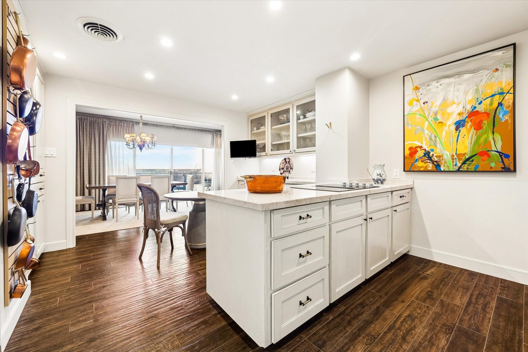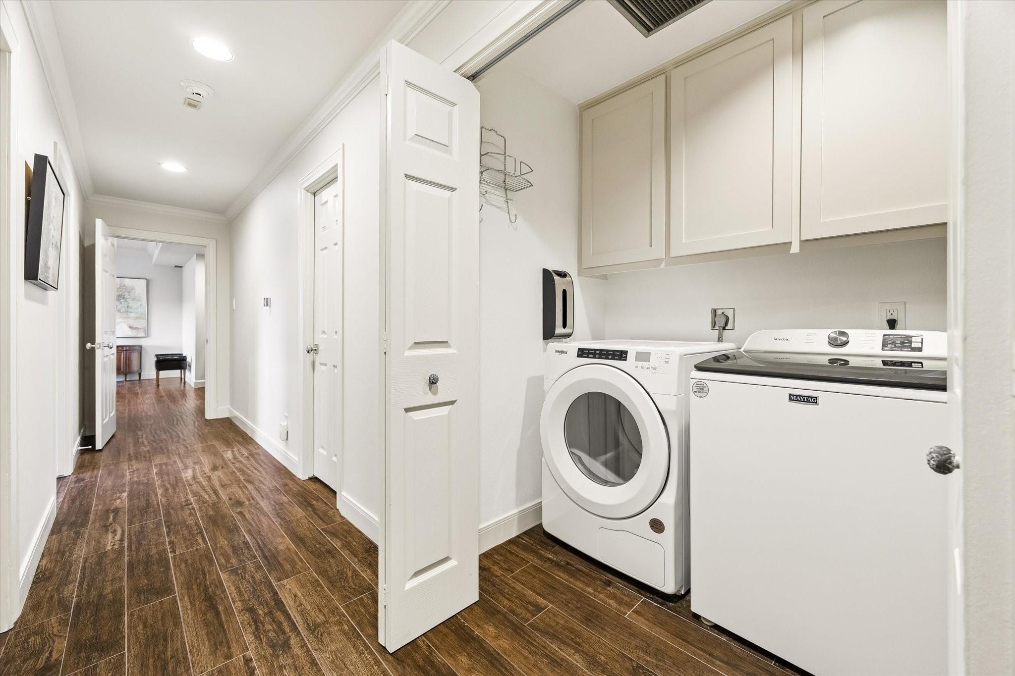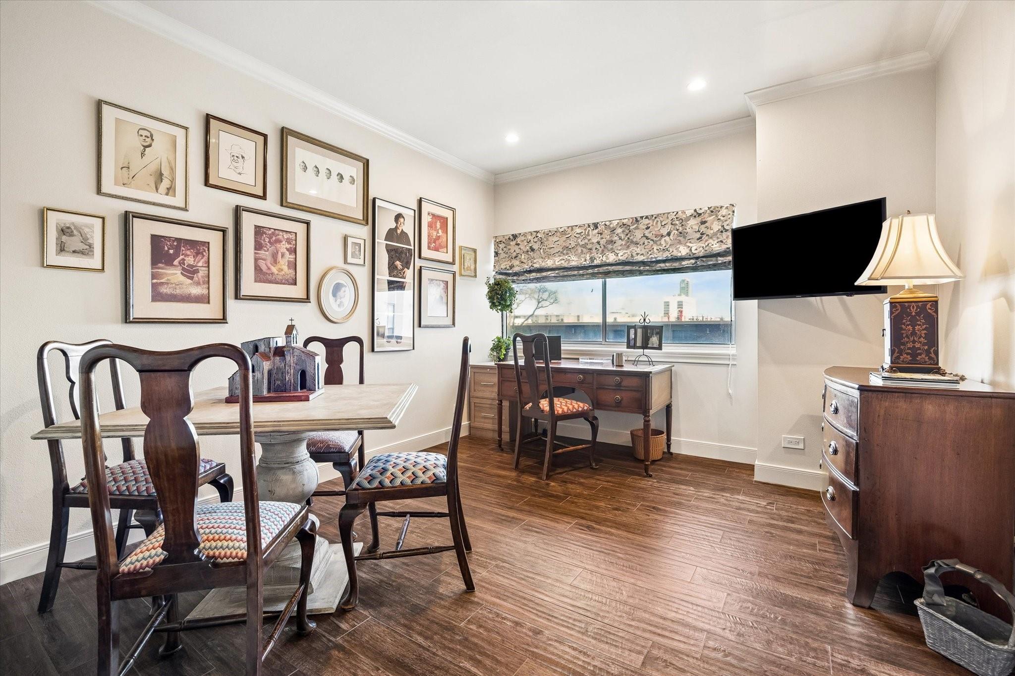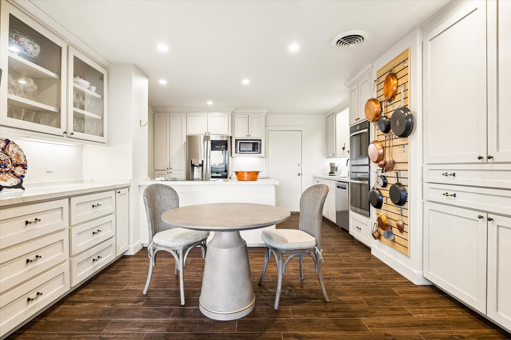 Beautifully redesigned and renovated, this rare three-bedroom residence offers two full baths and a guest half bath in a highly desirable full-service highrise near River Oaks and Upper Kirby. A gracious entry with custom Segreto wall finish welcomes you to elegant interiors with engineered wood floors throughout the living areas and bedrooms. The spacious primary suite features a sitting area, a large walk-in closet, and spa-inspired bath. East-facing views overlook the pool from a generous private balcony. The thoughtfully designed kitchen offers incredible built-in storage and attention to detail throughout. A large storage closet plus an in-unit full size washer and dryer adds convenience. Residents enjoy full-service amenities including on-site management, concierge, valet/porter services, pool, fitness center, party room, and dog park. Maintenance fee includes all utilities. Convenient to premier dining and shopping. An exceptional opportunity for a large turn-key unit.