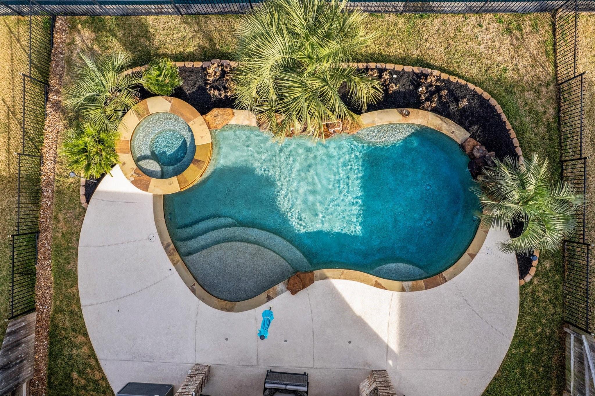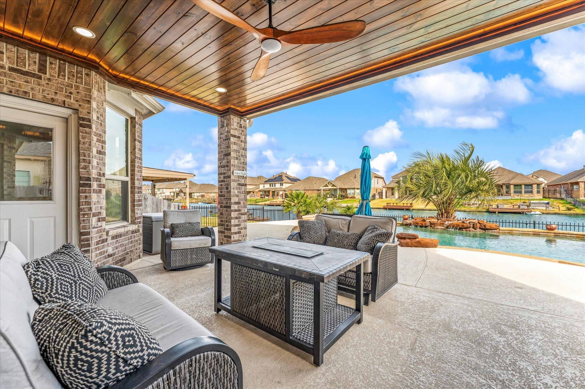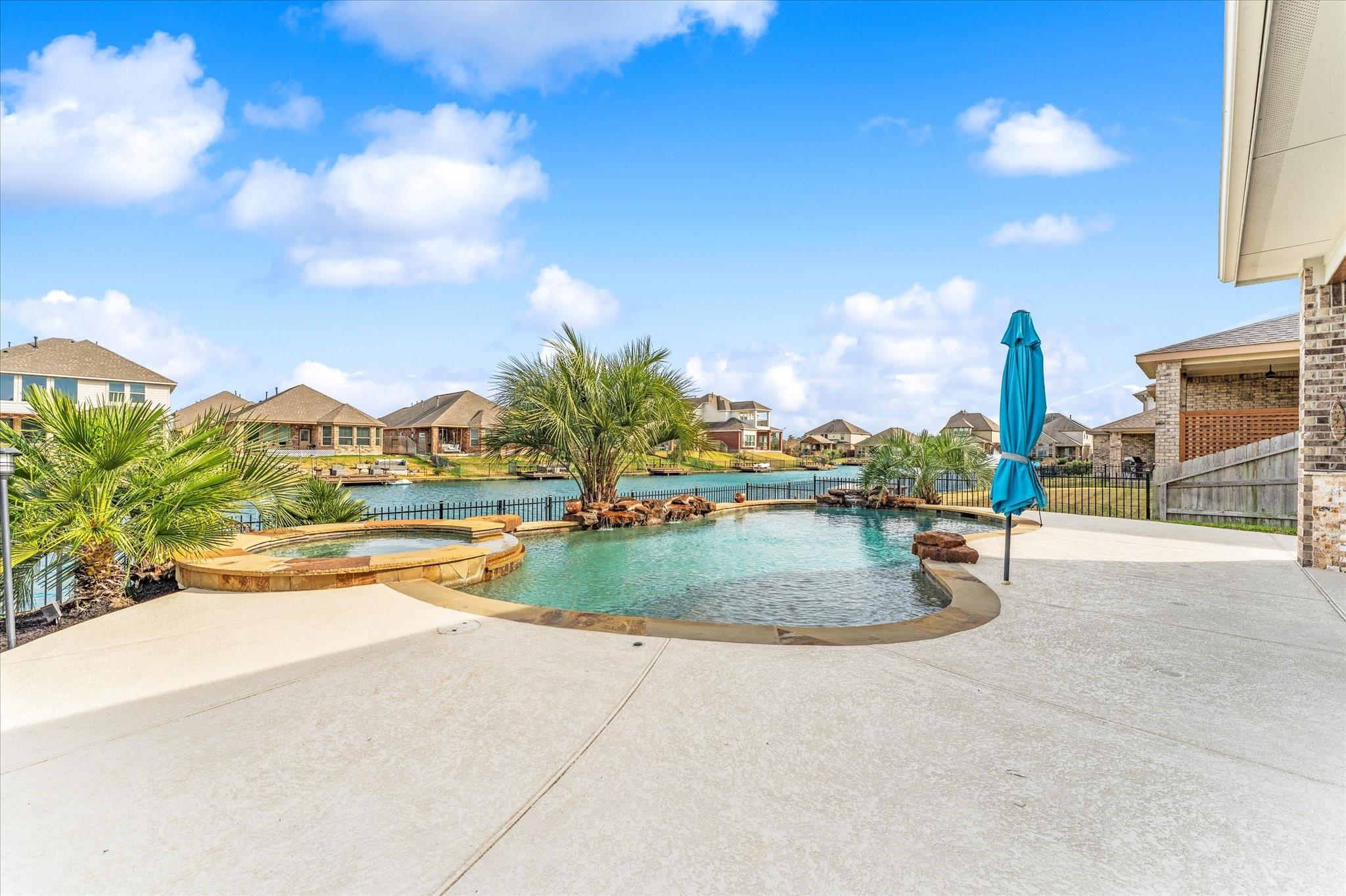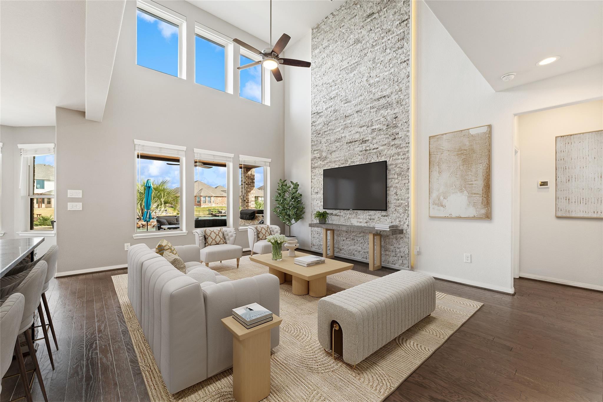 Welcome to lakeview living where every detail feels intentional & it’s truly move in ready. This two story, 4 bedroom, 3.5 bath home is filled with natural light, thanks to a living room lined with walls of windows that frame the backyard, pool & water beyond. The dramatic ledger stone two story feature wall is elevated with vertical indirect accent lighting. The kitchen continues the statement with a ledger stone island, sleek black cabinet pulls. Pocket office doors create a private workspace. The primary suite is a true retreat with an updated bath & a spa level walk in footless shower featuring body sprayers, rain head & wand. A Murphy bookcase leads to the attic. Outside feels like a resort, custom lagoon style pool overlooking the lake, tropical winter hardy landscaping, slatted covered patio with indirect lighting & an outdoor kitchen with a 41 inch gas griddle. Finished with a garage leathered granite wall storage system for tools & organization.