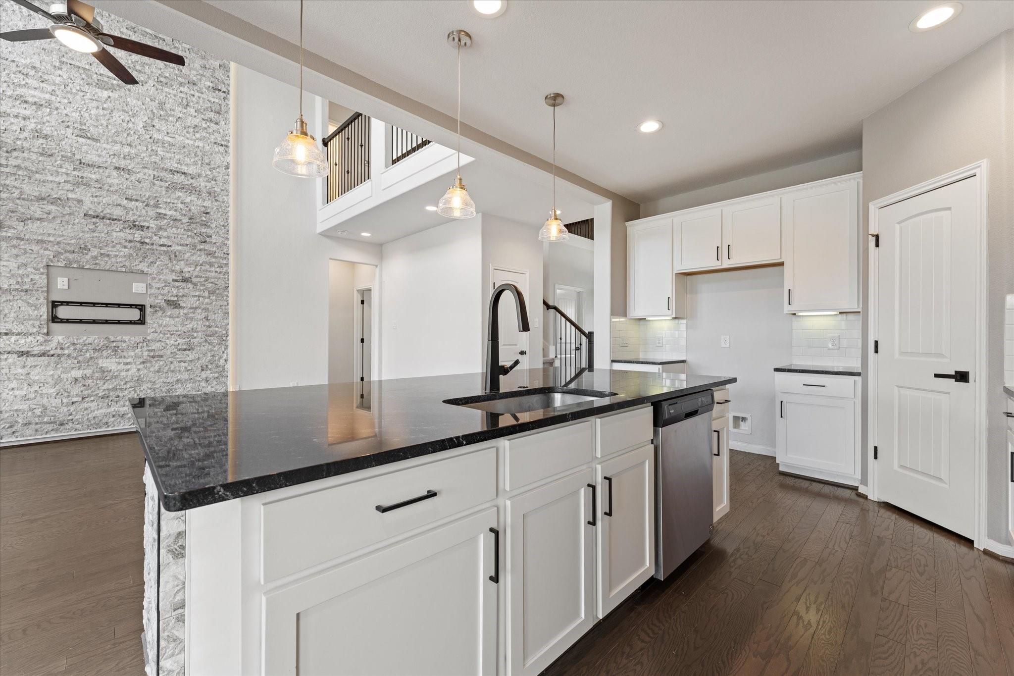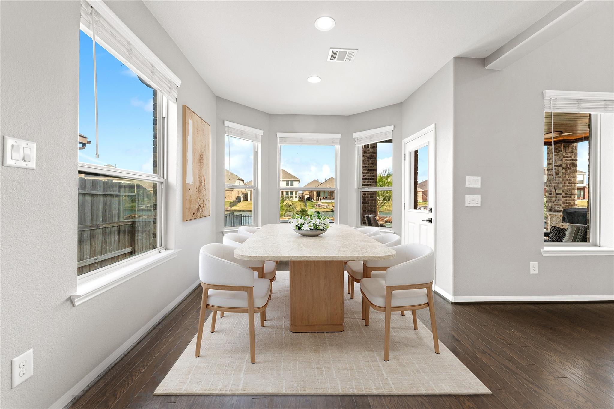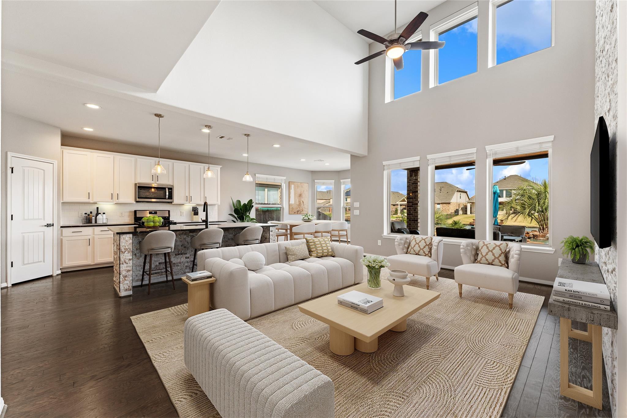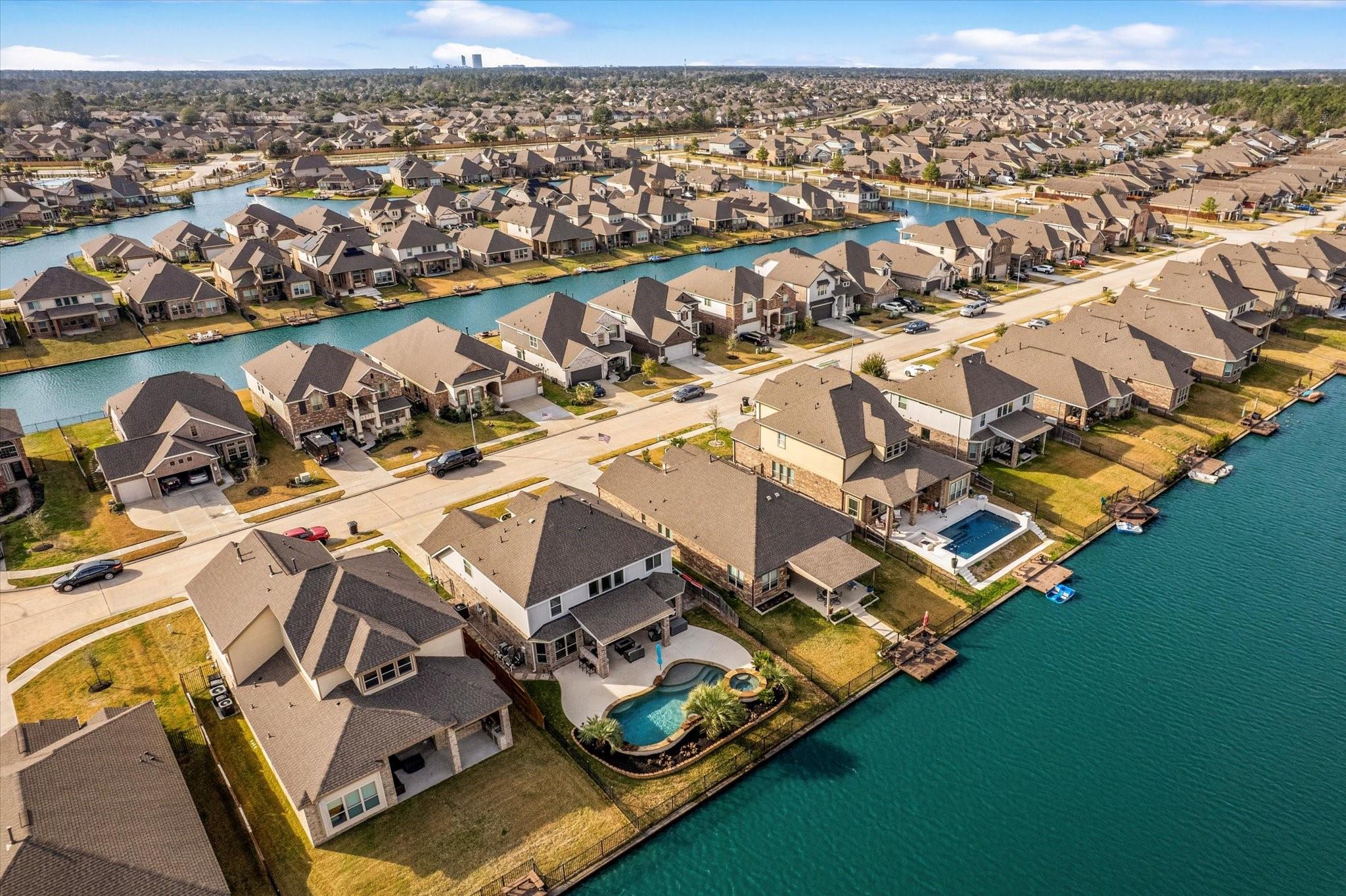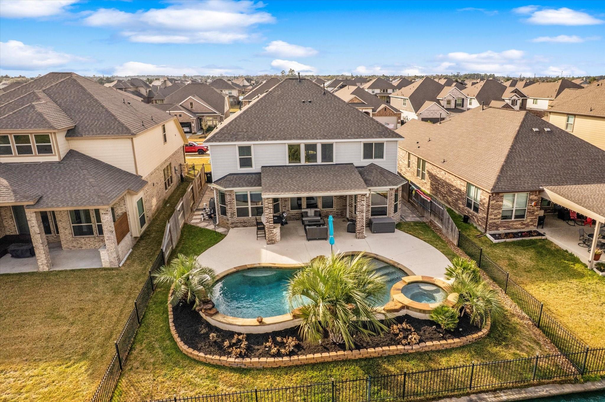 Welcome to lakeview living where every detail feels intentional & it’s truly move in ready. This two story, 4 bedroom, 3.5 bath home is filled with natural light, thanks to a living room lined with walls of windows that frame the backyard, pool & water beyond. The dramatic ledger stone two story feature wall is elevated with vertical indirect accent lighting. The kitchen continues the statement with a ledger stone island, sleek black cabinet pulls. Pocket office doors create a private workspace. The primary suite is a true retreat with an updated bath & a spa level walk in footless shower featuring body sprayers, rain head & wand. A Murphy bookcase leads to the attic. Outside feels like a resort, custom lagoon style pool overlooking the lake, tropical winter hardy landscaping, slatted covered patio with indirect lighting & an outdoor kitchen with a 41 inch gas griddle. Finished with a garage leathered granite wall storage system for tools & organization.