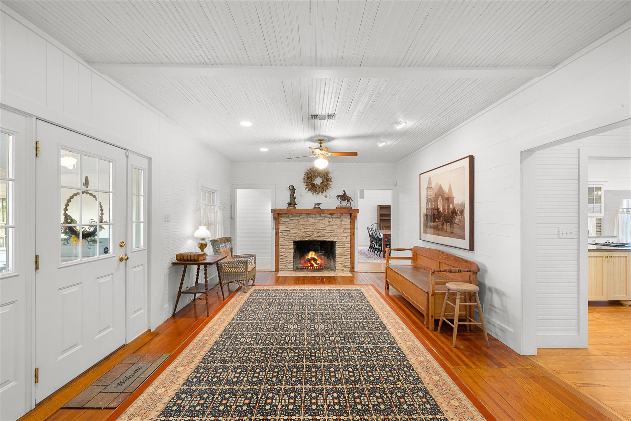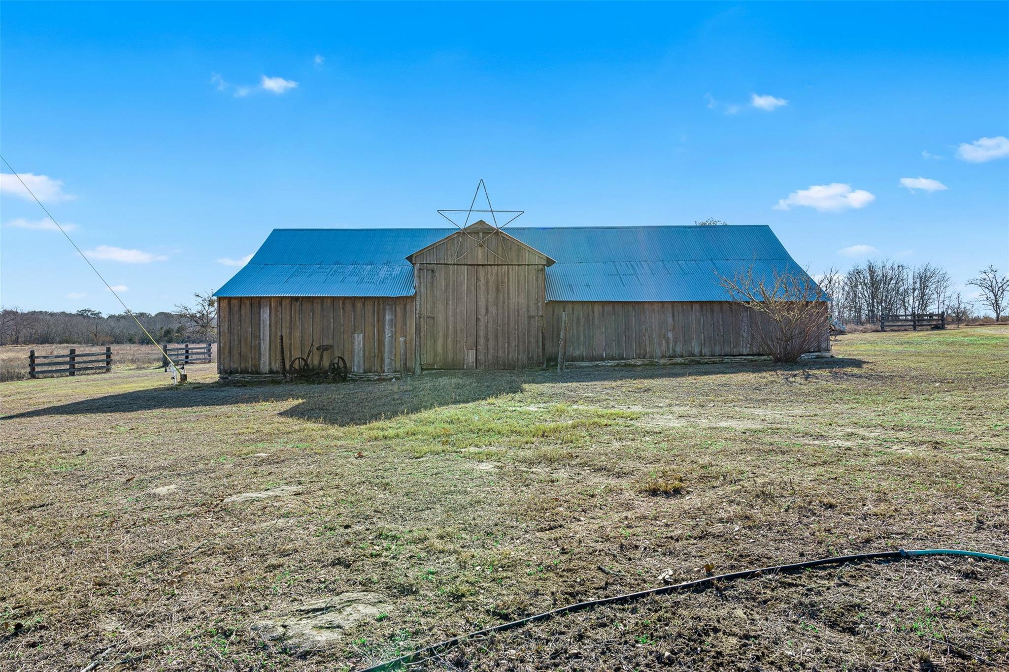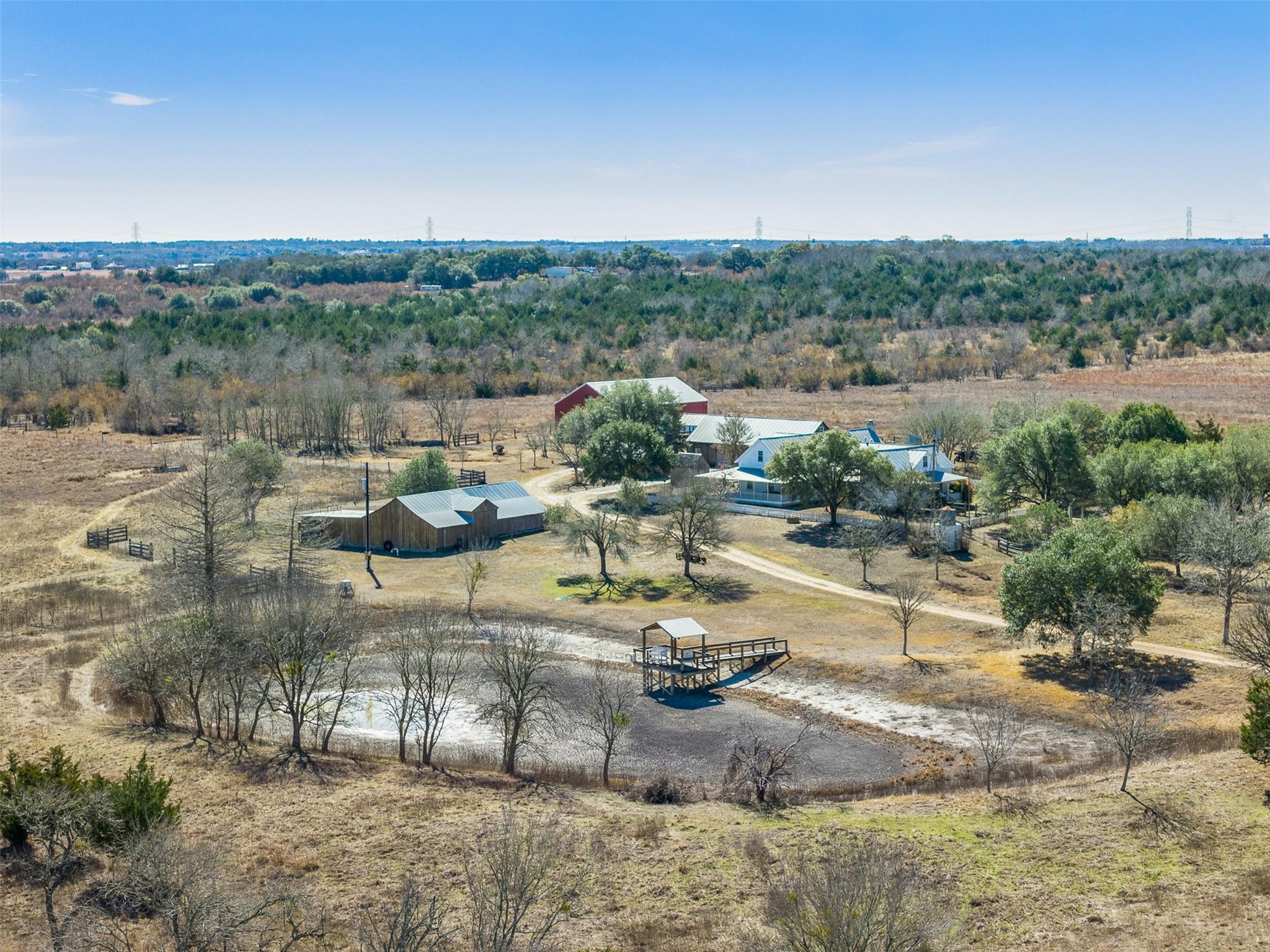 Just minutes from Round Top and Fayetteville, this 107-acre ranch blends history and thoughtful updates. The farmhouse, built circa 1905 and remodeled/expanded in 2003, features high ceilings and exposed native stone. The addition was designed around the original stone fireplace, showcasing it beautifully inside. The kitchen offers a large island in its own space while remaining open to the living room with a second fireplace. Improvements include a large garage with living quarters, a metal barn, and multiple barns and outbuildings. Rolling hills, woods, open pasture, wet-weather creek, bridge, and three ponds provide space for cattle, hunting, recreation, or future homesites. An additional 27 contiguous acres is available, MLS #24465329.