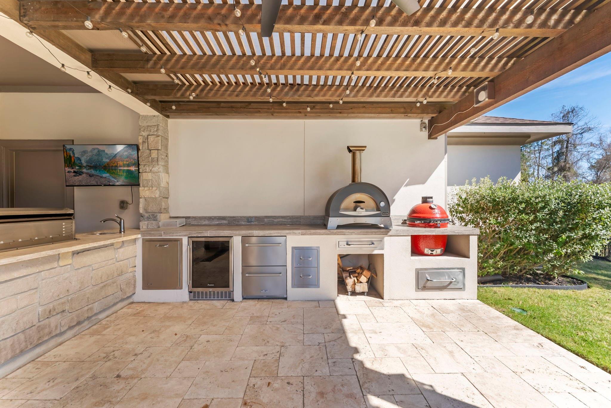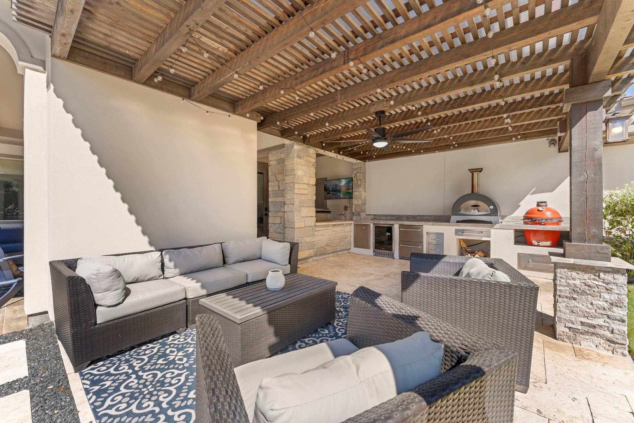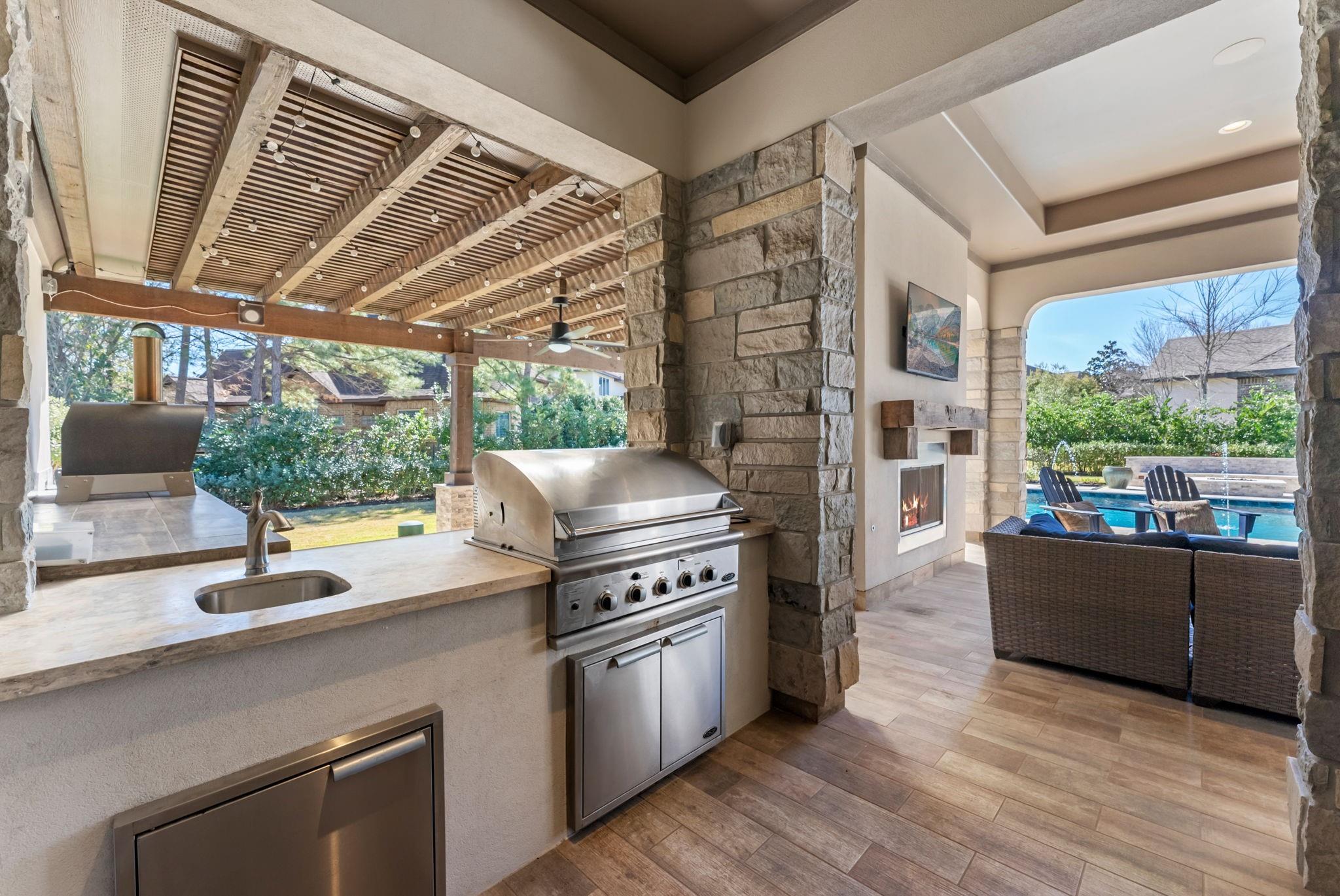 Exquisite Tommy Bailey custom home nestled on a well manicured corner lot in the highly desired enclave of Player Crest. Chef's dream kitchen features a five burner Wolf gas cooktop, Bosch double ovens, farm house sink, pot filler, and huge granite island. Dramatic theatre room has comfortable raised loungers and top of the line Adobe Atmos media equipment. Entertain in style on the fabulous 49'x18' loggia with fireplace, dining area, and two cozy conversation spaces. The 23'x21' outdoor kitchen area offers the perfect setting for entertainment and relaxation. The sparking pool with twelve person spa has an exciting water feature and shelf loungers. The backyard features a stone firepit with cozy bench seating and plenty of lawn area for children and pets to play. The three car garage has an EV charging station. Zoned to outstanding schools with access to world class shopping and dining.