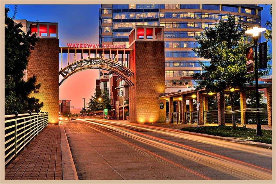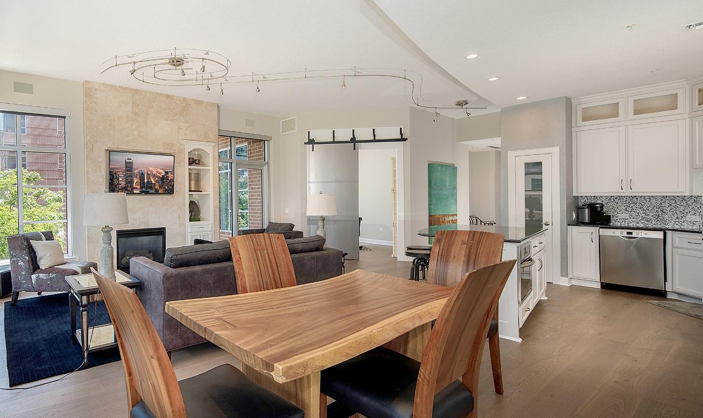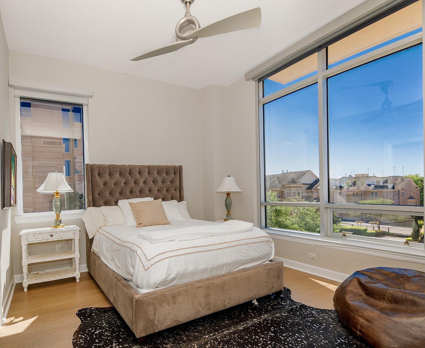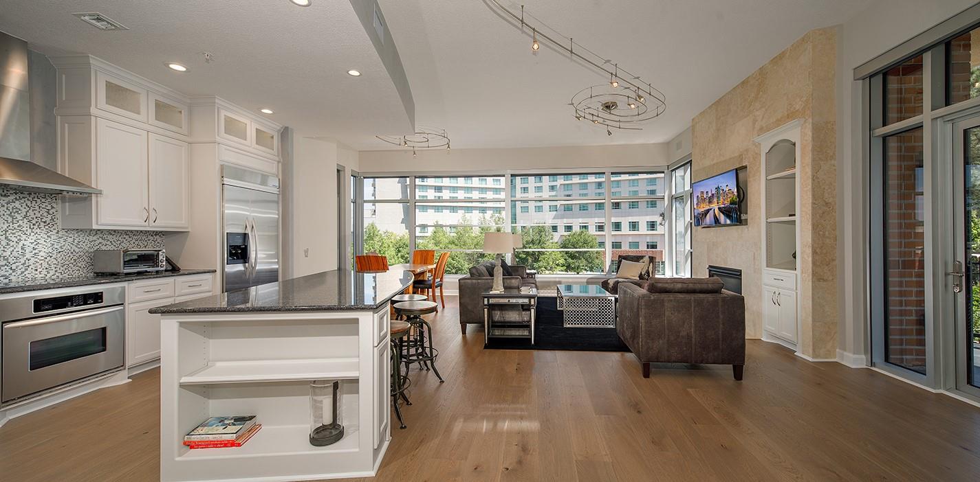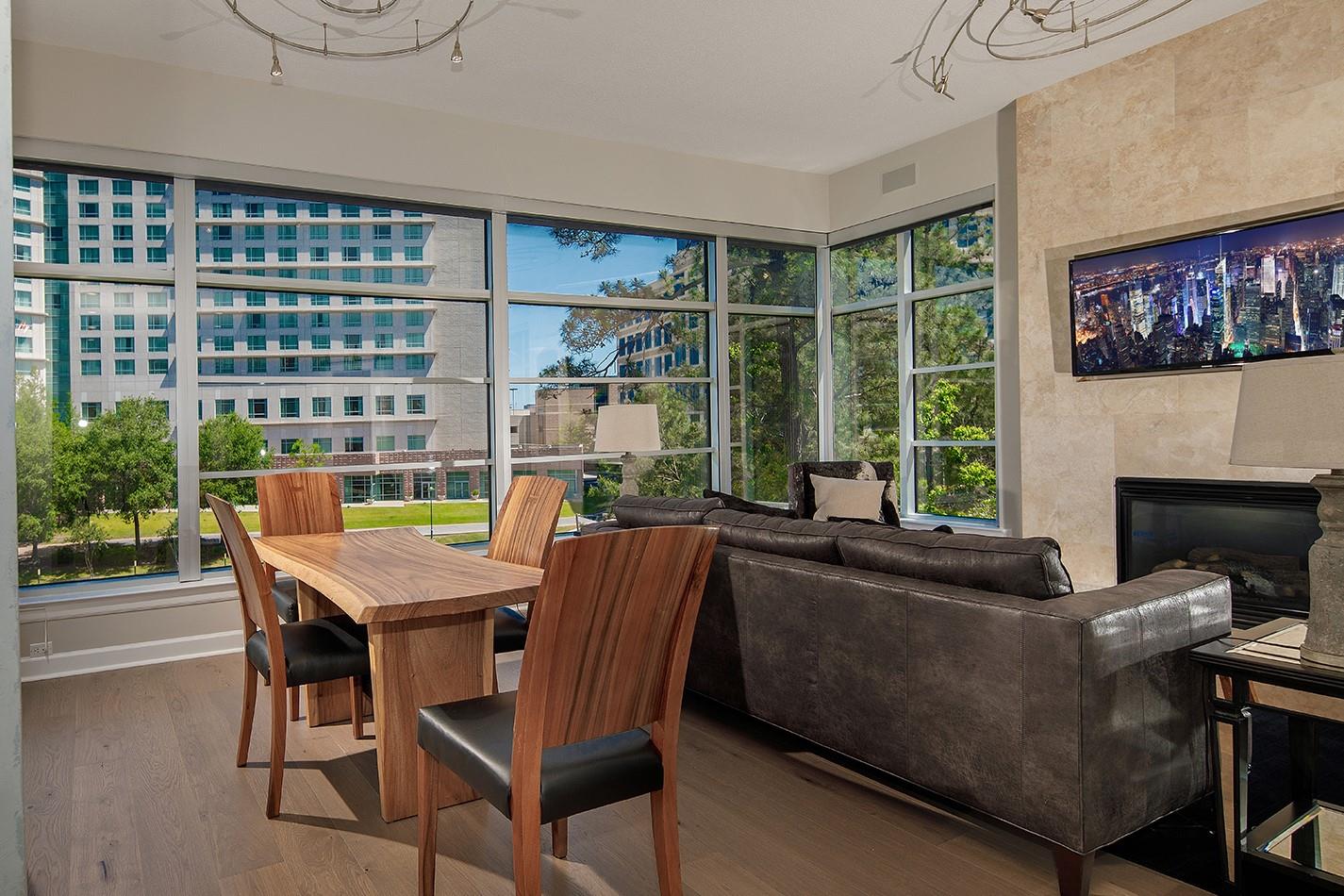 Waterfront loft with enormous windows and wraparound balconies offering panoramic views of The Woodlands Waterway! Walk to endless restaurants and shops, enjoy concerts at the Cynthia Woods Mitchell Pavilion, and experience low maintenance lock and leave living in this mid-rise condo with key FOB entry. Recently replaced hardwood flooring throughout, new tile in the completely remodeled baths, motorized shades, and new a/c in 2025. The sleek, open kitchen with center island features a new gas range, new stainless refrigerator, granite counters, a breakfast bar, and plenty of cabinet storage. The kitchen overlooks the dining and den with a gas fireplace; study with custom sliding metal barn door and closet could be a 3rd bedroom; primary bedroom has a walk-in closet, stunning bath with free standing tub and large shower; guest bedroom with en-suite bath and walk-in closet; washer/dryer/fridge convey with the home. Amenities include garage parking for 2, pool, spa, and grilling area.