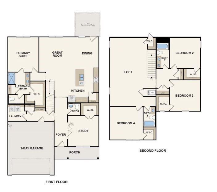 With over 3,000 square feet, the Sinclair boasts abundant space for private living and entertaining. This plan welcomes you with a charming columned front porch, leading you into a welcoming foyer. With over 3,000 square feet, the Sinclair boasts abundant space for private living and entertaining. This plan welcomes you with a charming columned front porch, leading you into a welcoming foyer. Directly off the foyer, a secluded study boasts a walk-in closet. Beyond the foyer, you'll love an open-concept living area that features an inviting kitchen—boasting a center island and corner pantry—an elegant dining area and a spacious great room. Anchoring the home, a convenient downstairs primary suite features its own attached bath and an expansive walk-in closet. Additional main-floor highlights include a valet entry off the 2-bay garage and a patio off the dining area. On the second floor, three secondary bedrooms—each with a walk-in closet—surround a versatile loft space.