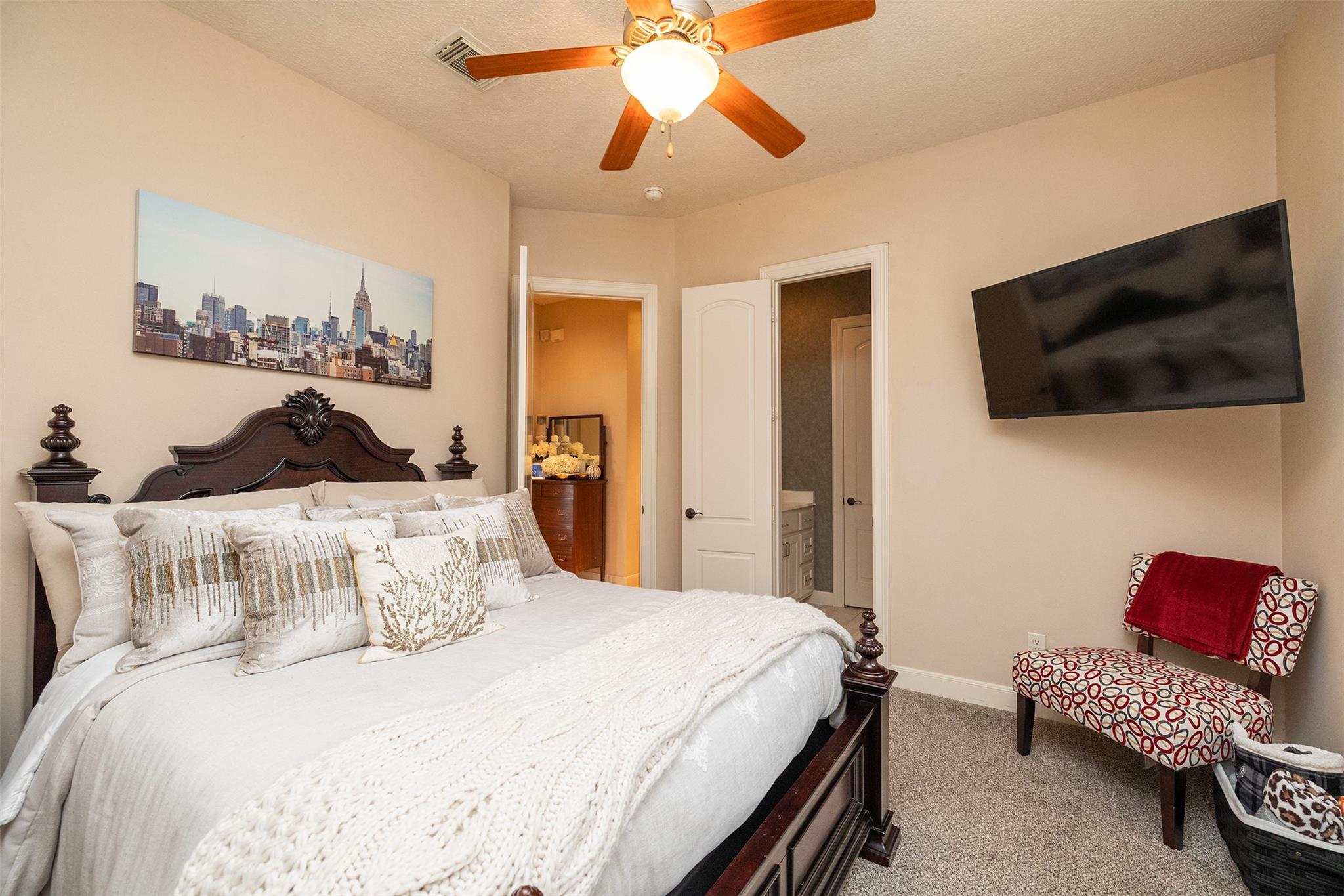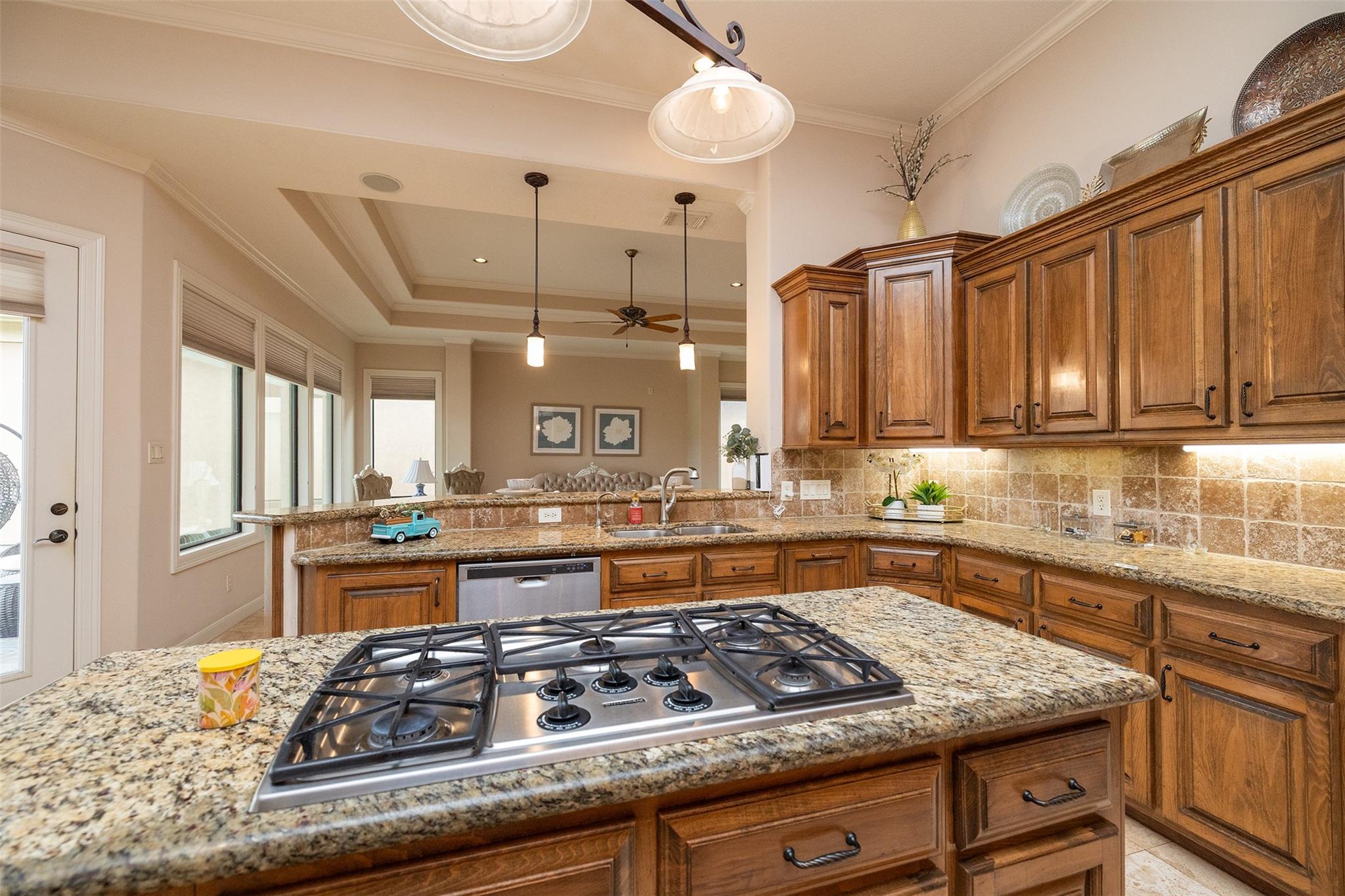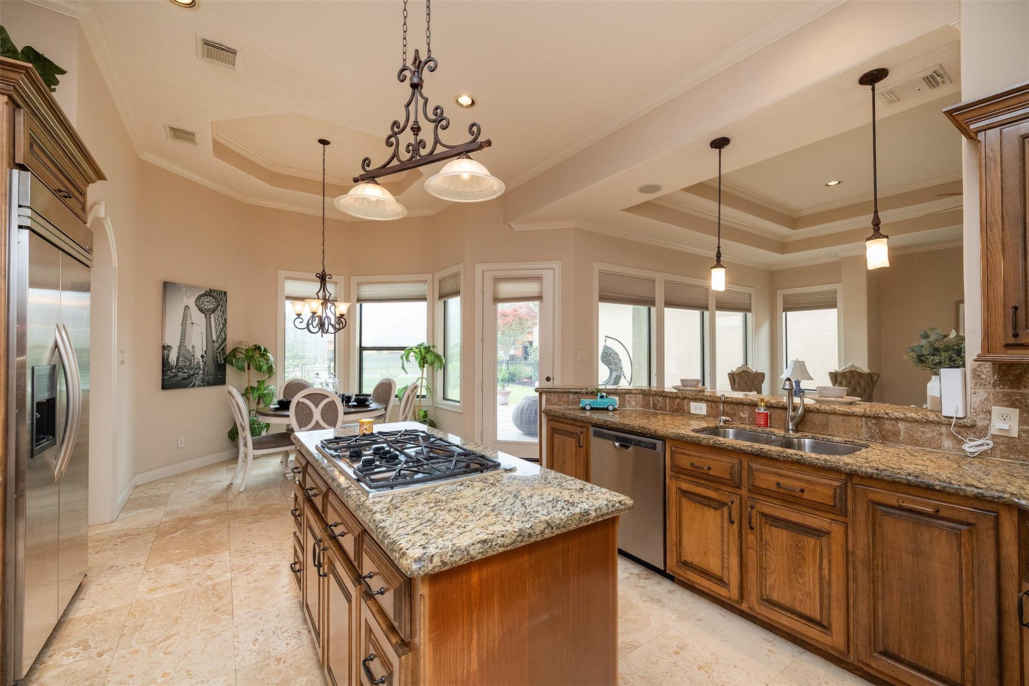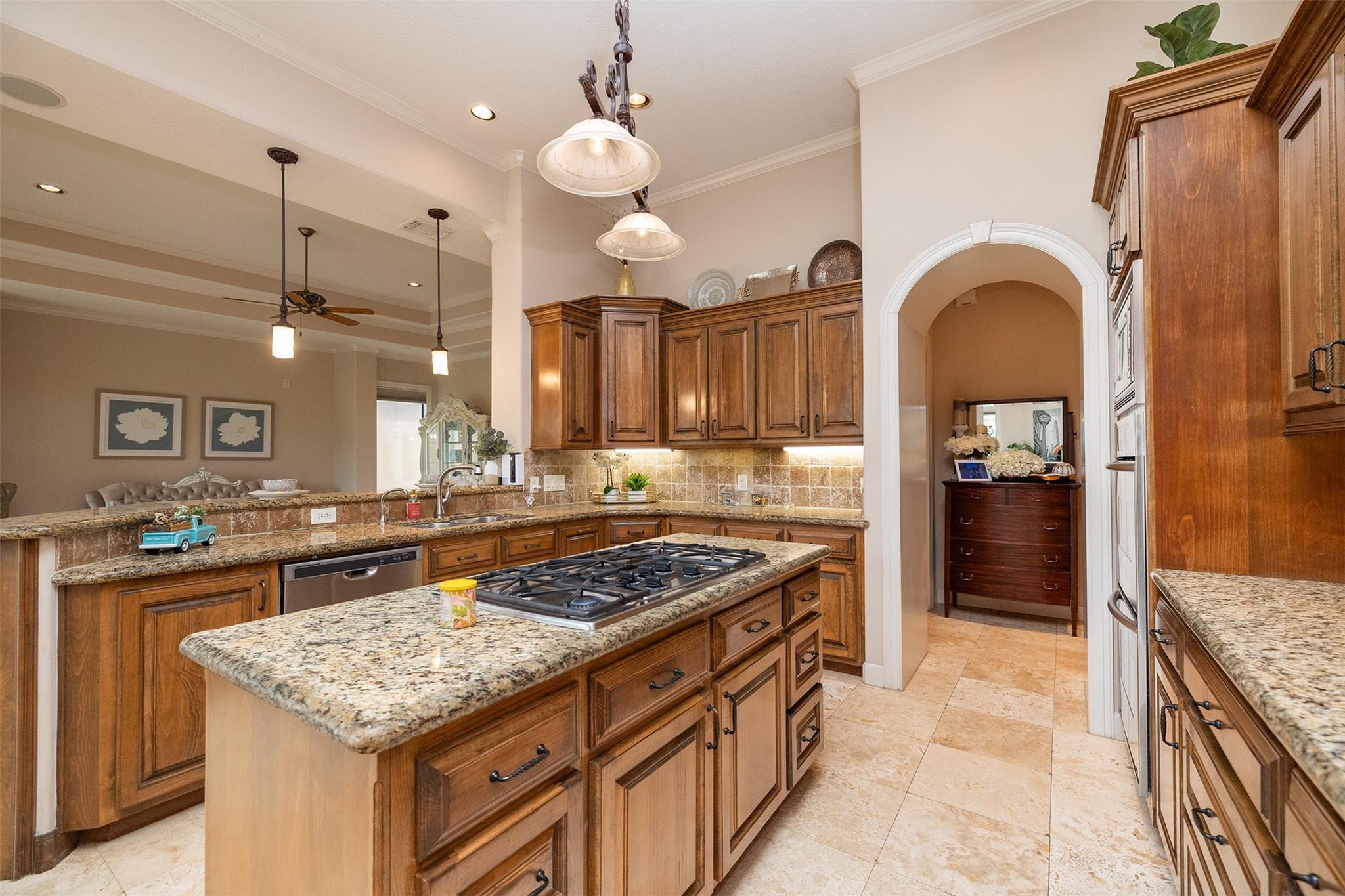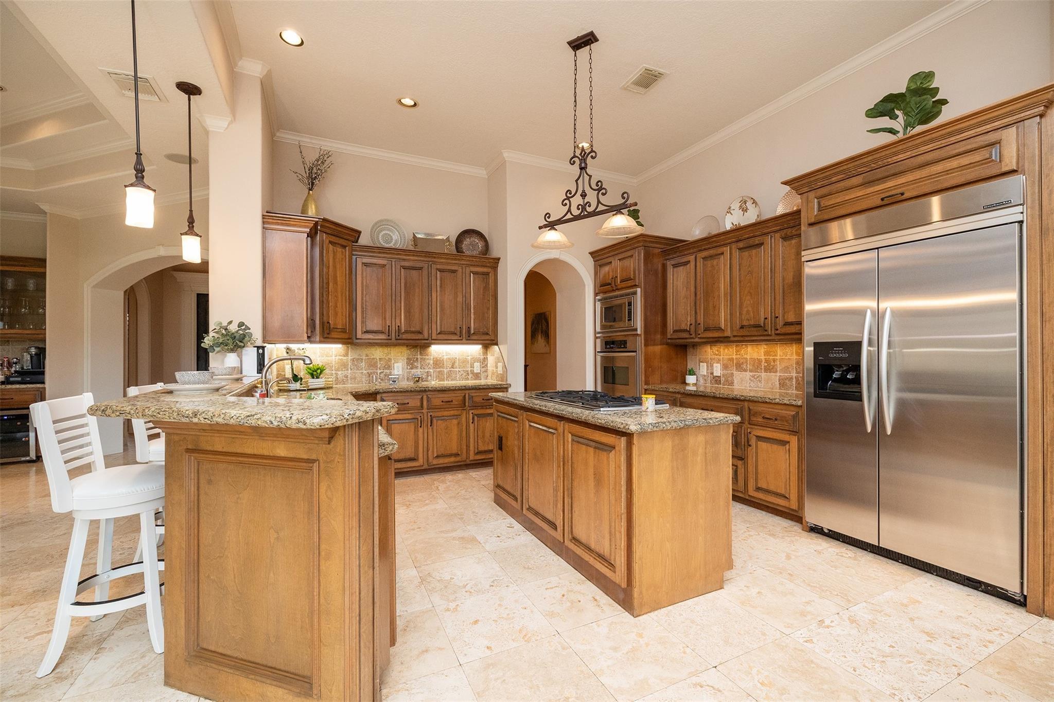 InteriorFireplace:1/Gas Connections,Gaslog FireplaceFloors:Carpet,Engineered Wood,Slate,TravertineCountertop:GRANITEBathroom Description:Full Secondary Bathroom Down,Half Bath,Primary Bath: Double Sinks,Primary Bath: Jetted Tub,Primary Bath: Separate Shower,Secondary Bath(s): Tub/Shower Combo,Vanity AreaBedroom Desc:All Bedrooms Down,En-Suite Bath,Split Plan,Walk-In ClosetKitchen Desc:Breakfast Bar,Island w/ Cooktop,Kitchen open to Family Room,Pantry,Pots/Pans Drawers,Soft Closing Cabinets,Soft Closing Drawers,Under Cabinet Lighting,Walk-in PantryRoom Description:Breakfast Room,Den,Entry,Formal Dining,Home Office/Study,Utility Room in HouseHeating:Central GasCooling:Central ElectricConnections:Electric Dryer Connections,Gas Dryer Connections,Washer ConnectionsDishwasher:YesDisposal:YesMicrowave:YesRange:Gas CooktopOven:Convection Oven,Double Oven,Electric OvenIce Maker:YesEnergy Feature:Attic Vents,Ceiling Fans,Digital Program Thermostat,High-Efficiency HVAC,HVAC>13 SEER,HVAC>15 SEER,Insulated/Low-E windows,Insulation - Blown CelluloseInterior:Alarm System - Owned,Crown Molding,Dryer Included,Fire/Smoke Alarm,Formal Entry/Foyer,High Ceiling,Prewired for Alarm System,Refrigerator Included,Spa/Hot Tub,Washer Included,Window Coverings