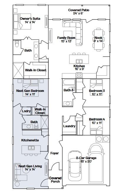 NEW! Lennar Classic Collection "McCartney" Plan with Elevation "K4" in Sunterra! This single-story home features a Next Gen® suite with a separate entrance, living space, bedroom and bathroom, ideal for multigenerational households or residents needing extra privacy. The main home shares an open layout between the kitchen, nook and family room with access to the covered patio, making entertaining easy. The luxe owner's suite is in a rear corner of the home and has an en-suite bathroom and walk-in closet, while two secondary bedrooms are near the front of the home.