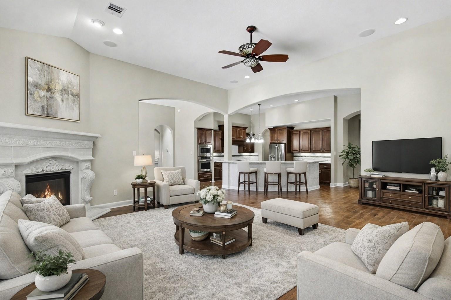 InteriorFireplace:2/Gas Connections,Gaslog FireplaceFloors:Brick,Carpet,TileBathroom Description:Full Secondary Bathroom Down,Half Bath,Primary Bath: Double Sinks,Primary Bath: Separate Shower,Primary Bath: Soaking Tub,Secondary Bath(s): Shower Only,Secondary Bath(s): Tub/Shower Combo,Vanity AreaBedroom Desc:All Bedrooms Down,En-Suite Bath,Primary Bed - 1st Floor,Sitting Area,Split Plan,Walk-In ClosetKitchen Desc:Breakfast Bar,Butler Pantry,Island w/o Cooktop,Kitchen open to Family Room,Pots/Pans Drawers,Under Cabinet Lighting,Walk-in PantryRoom Description:Breakfast Room,Butlers Pantry,Entry,Family Room,Formal Dining,Formal Living,Gameroom Up,Guest Suite,Home Office/Study,Living Area - 1st Floor,Media,Utility Room in HouseHeating:Central Gas,ZonedCooling:Central Electric,ZonedConnections:Electric Dryer Connections,Gas Dryer Connections,Washer ConnectionsDishwasher:YesDisposal:YesMicrowave:YesRange:Gas RangeOven:Double Oven,Gas Oven,Single OvenEnergy Feature:Attic Vents,Ceiling Fans,Digital Program Thermostat,Generator,High-Efficiency HVAC,Insulated Doors,Insulated/Low-E windows,Insulation - OtherInterior:Alarm System - Owned,Dry Bar,Fire/Smoke Alarm,Formal Entry/Foyer,High Ceiling,Prewired for Alarm System,Spa/Hot Tub,Water Softener - Owned,Window Coverings
