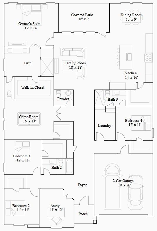 First FloorFamily Room:18x18Dining:13x9Kitchen:14x16Primary Bedroom:17x14Bedroom:11x11Bedroom 2:12x11Bedroom 3:12x11Game Room:16x13Home Office/Study:11x12
