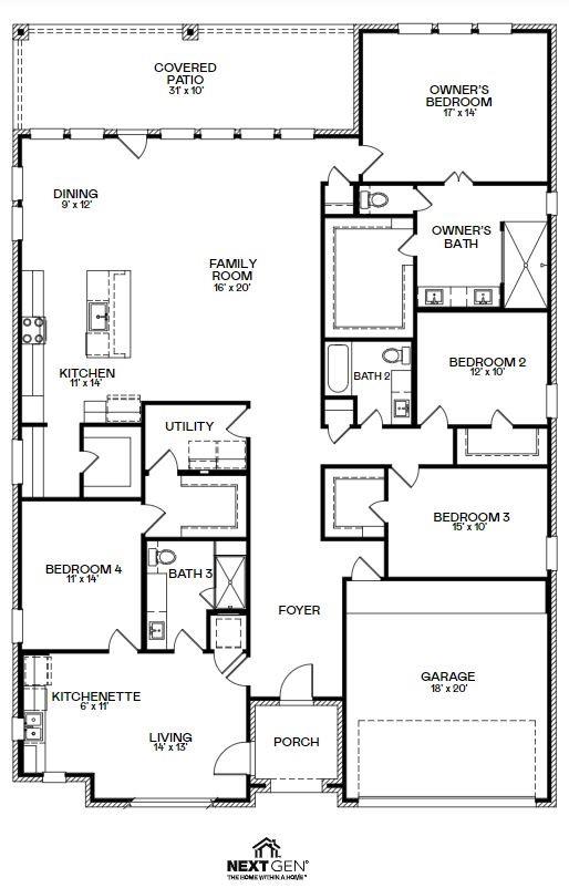 NEW Lennar Village Builders, Pinnacle Collection, the Kimball floorplan with Elevation A! Showcasing Lennar’s Next Gen® design, this single-story home delivers modern comfort with a layout that is perfect for multigenerational households. The flexible Next Gen® suite can be used for various purposes, enabling residents to live independently or serving as a private home office. At the back, the main home features an open-concept main living area with direct access to a covered patio. In addition to an owner’s suite with a spa-style bathroom, there are two secondary bedrooms and a two-car garage. Prices and features may vary and are subject to change. Photos are for illustrative purposes only.