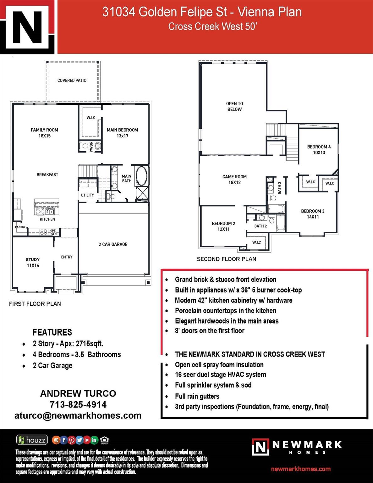 The high ceiling open concept VIENNA by NEWMARK HOMES in the must see CROSS CREEK WEST COMMUNITY checks all the boxes. This 4/3.5 2 story has a bold show stopping brick& stucco front elevation. The spacious family room features a show stopping wall of windows overlooking the tranquil backyard. Hand selected design features including elegant hardwoods in the main living areas that bring this architectural masterpiece together. The must have chef's dream kitchen has pristine porcelain countertops, built in appliances, & 42" cabinets. The cozy main suite has upgrade floor tile, a mud-set shower, a separate garden tub & duel sinks. Head upstairs to the large game room entertainment hotspot. Spray foam insulation, a reverse osmosis system, a tankless hot water heater, full sprinklers, & full gutters included.