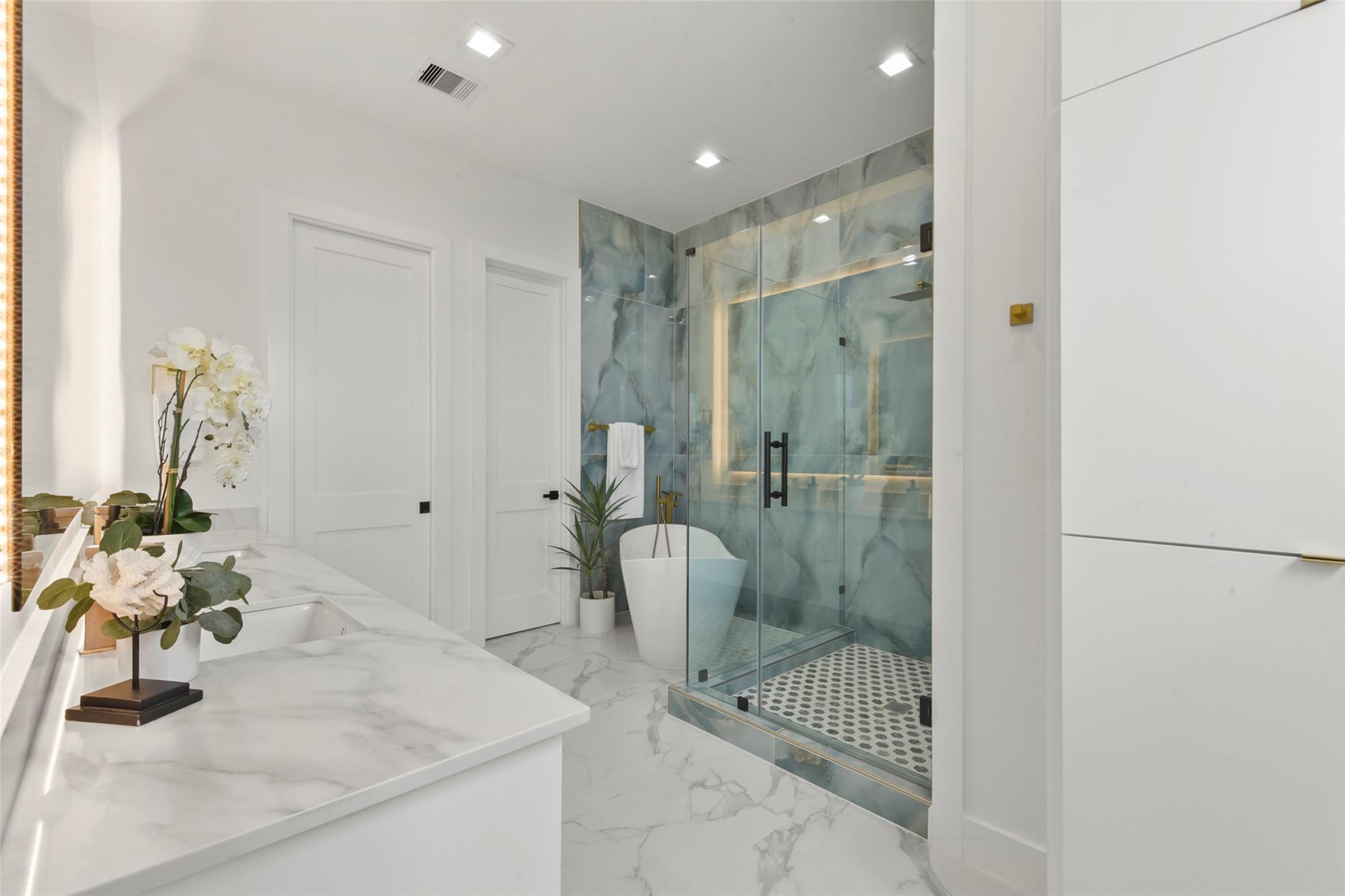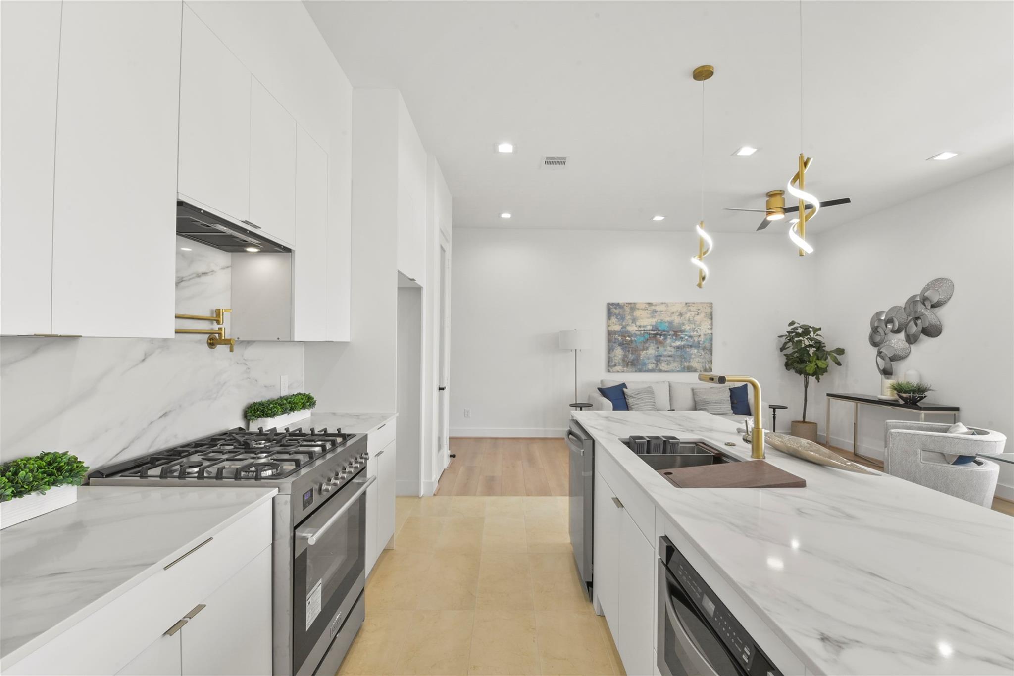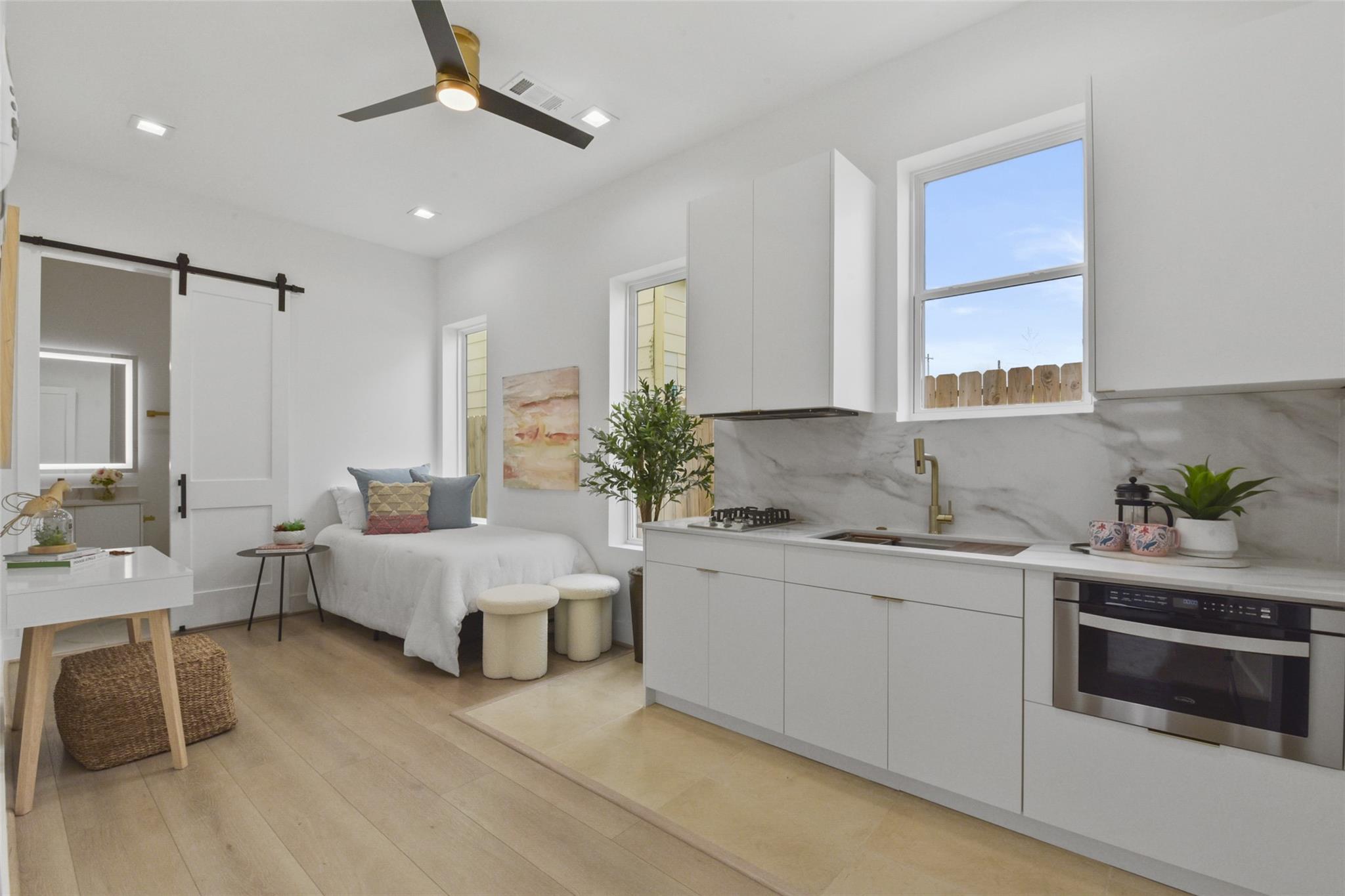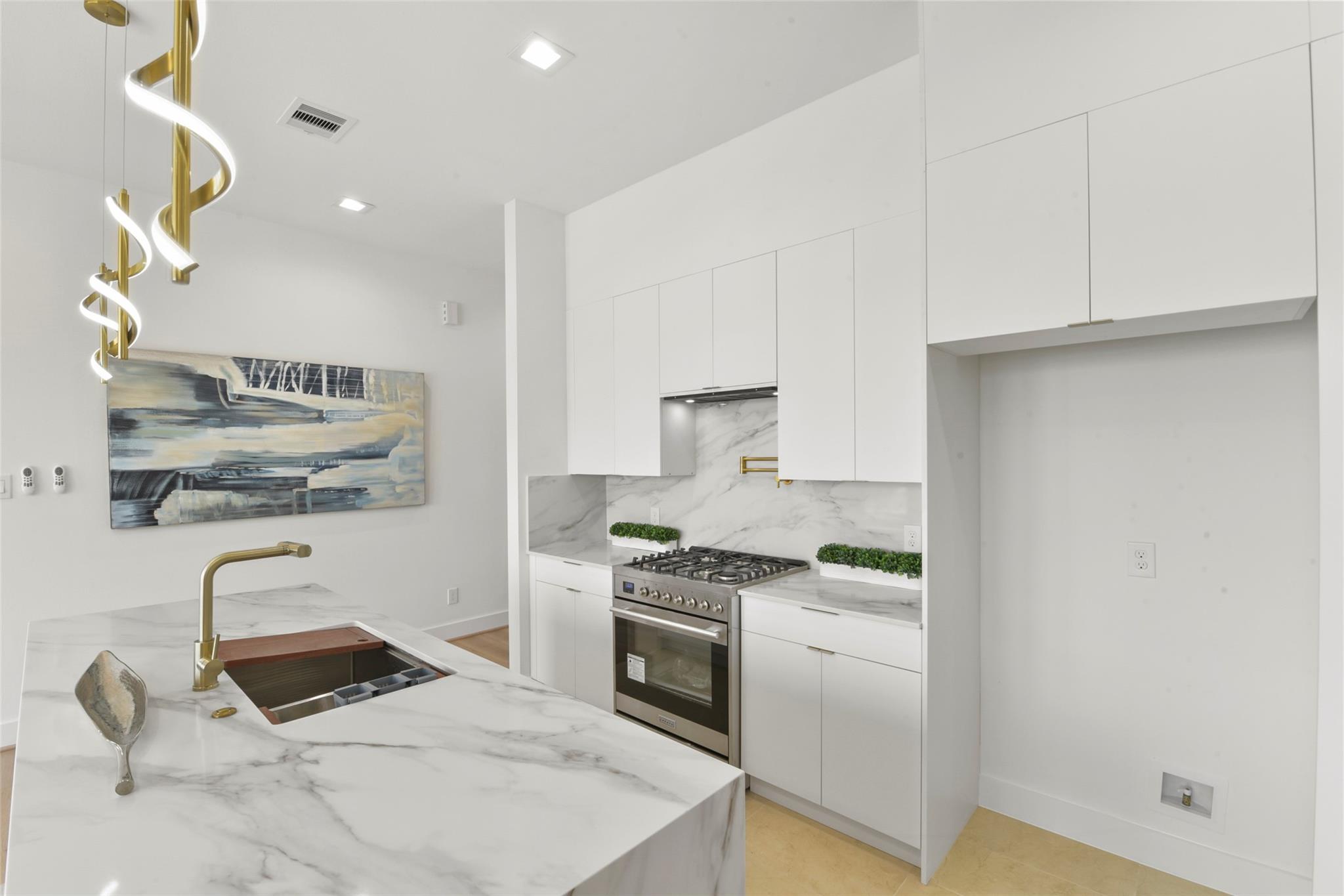 Culinary sanctuary features rare, expensive stone countertops, custom floor-to-ceiling cabinetry, and a suite of professional-grade stainless steel appliances, including a high-performance free-standing stove and a state-of-the-art convection wall oven. The primary suite offers a spa-inspired retreat with a primary bathroom. A freestanding soaking tub serves as the centerpiece, and custom vanity lighting. For effortless entertaining, the lower-level lounge features a sleek kitchenette designed with minimalist cabinetry, an undermount sink, and a built-in convection microwave. Beautiful wooden floors and windows provide a refined backdrop.