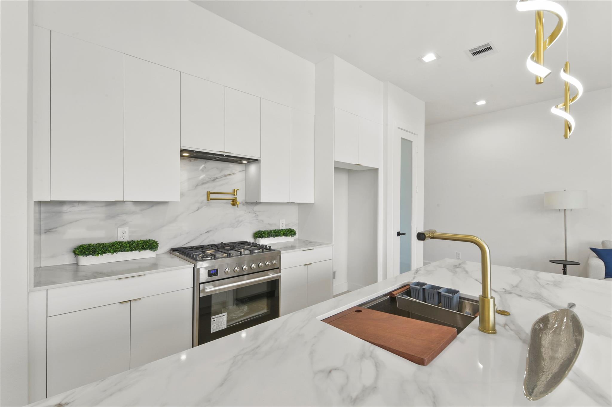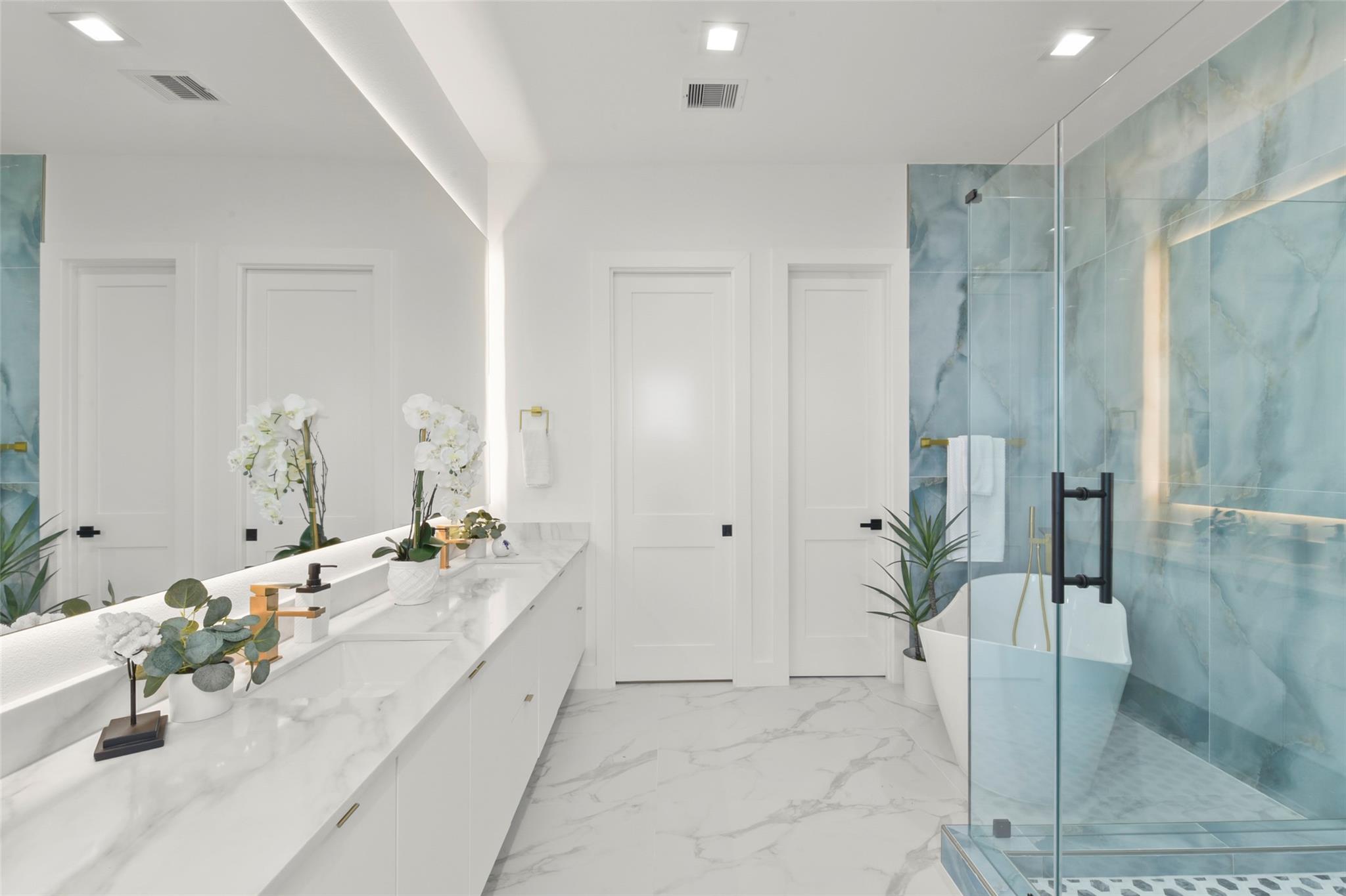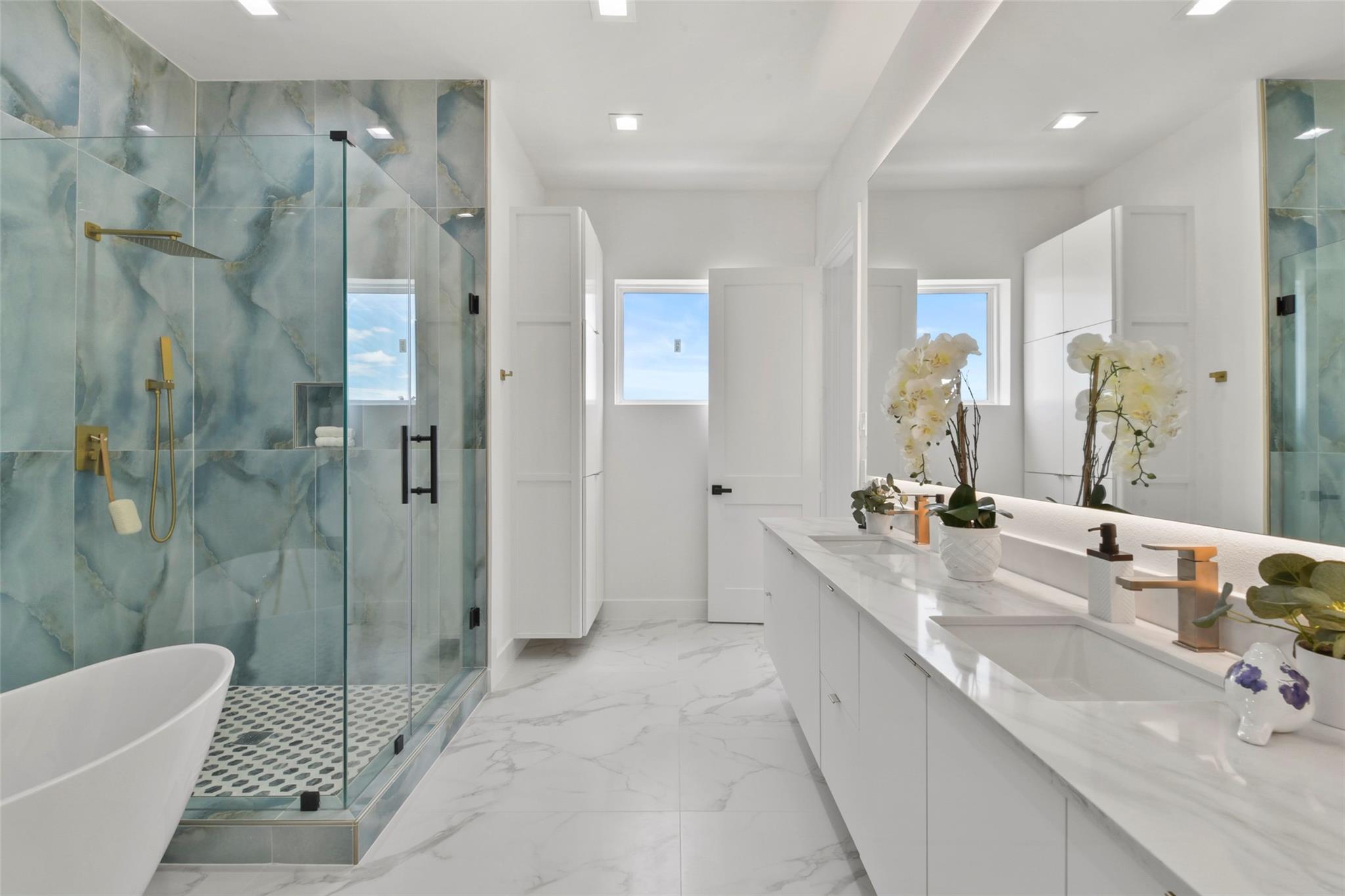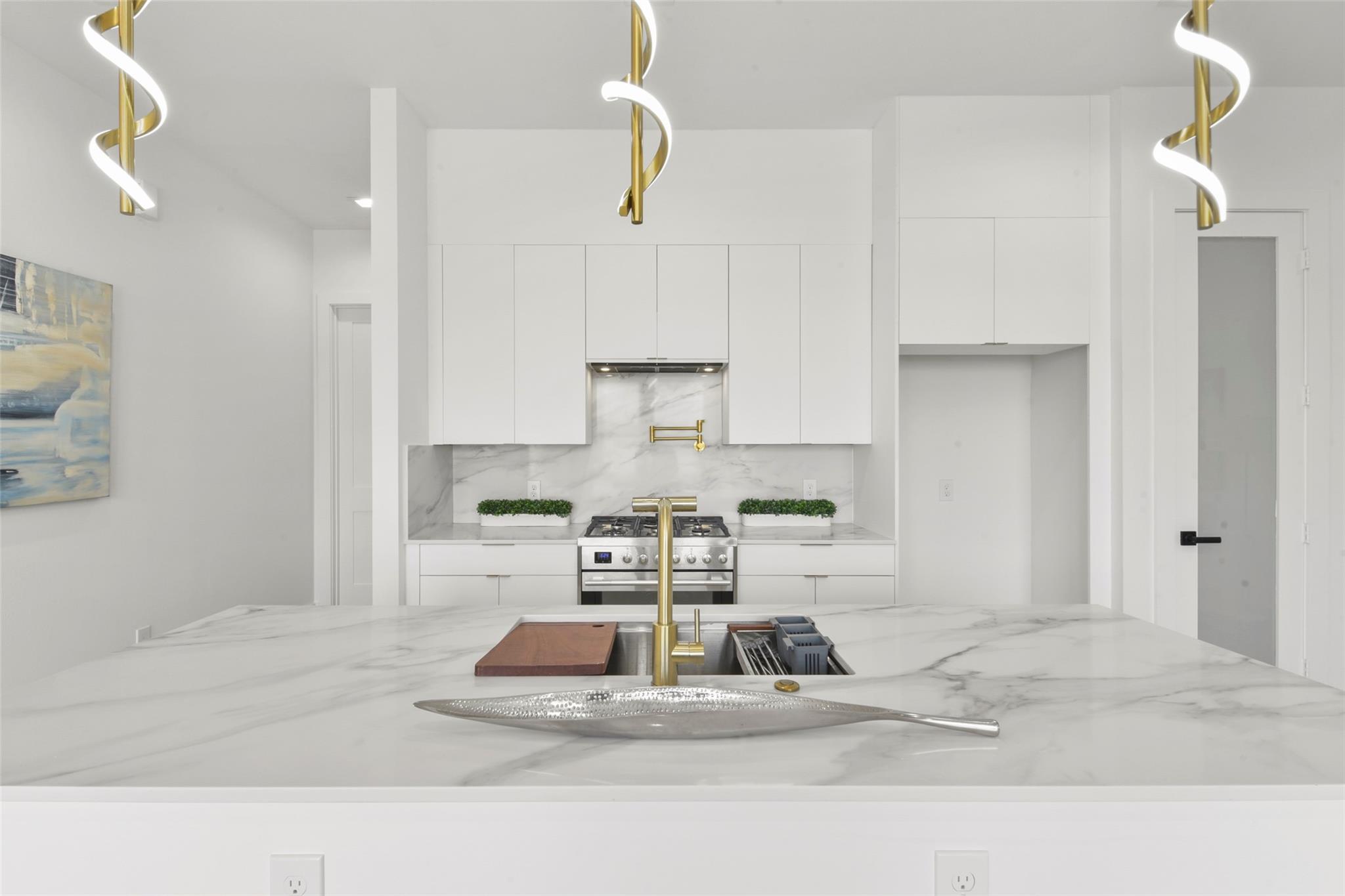 Culinary sanctuary features rare, expensive stone countertops, custom floor-to-ceiling cabinetry, and a suite of professional-grade stainless steel appliances, including a high-performance free-standing stove and a state-of-the-art convection wall oven. The primary suite offers a spa-inspired retreat with a primary bathroom. A freestanding soaking tub serves as the centerpiece, and custom vanity lighting. For effortless entertaining, the lower-level lounge features a sleek kitchenette designed with minimalist cabinetry, an undermount sink, and a built-in convection microwave. Beautiful wooden floors and windows provide a refined backdrop.