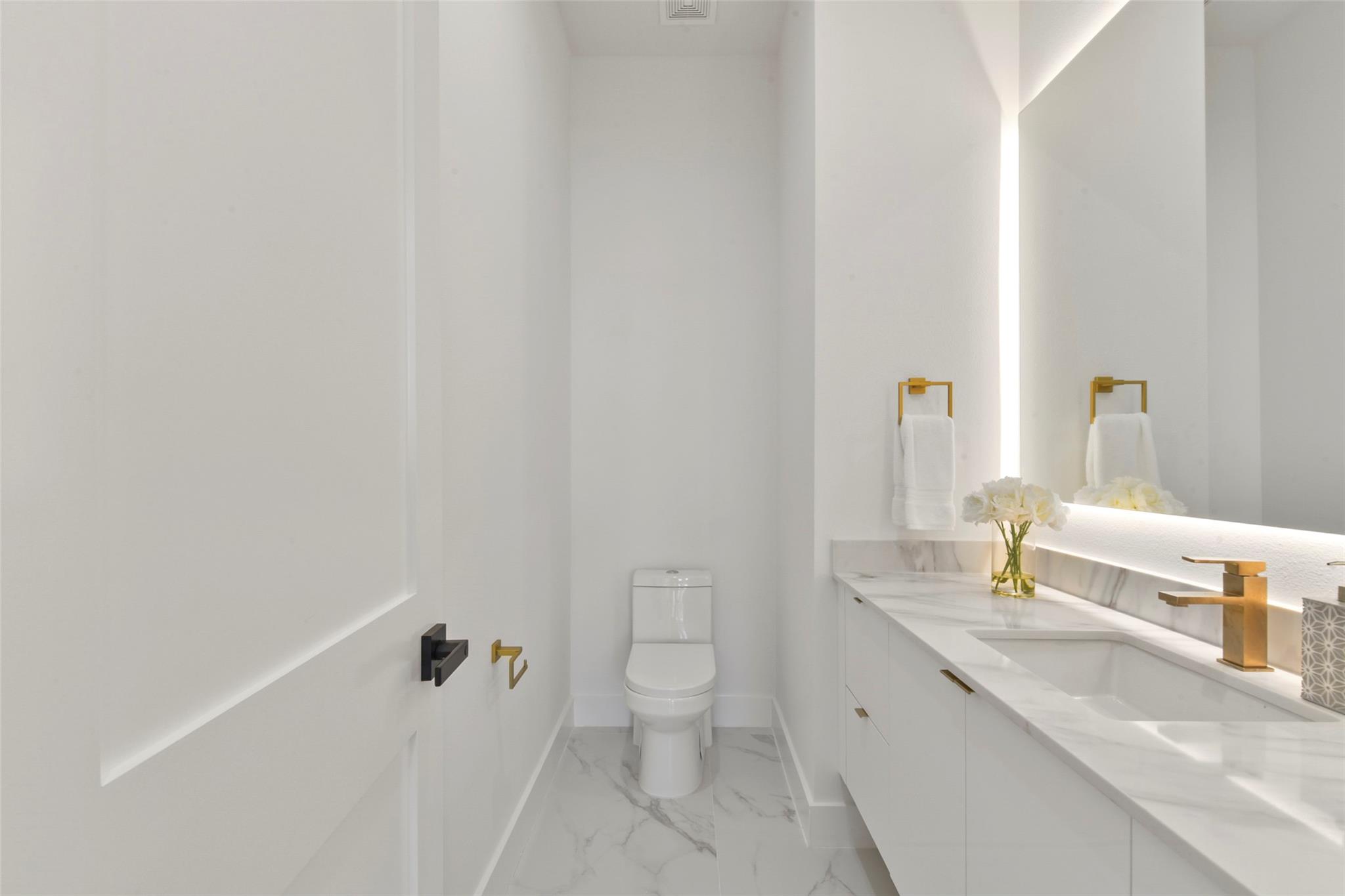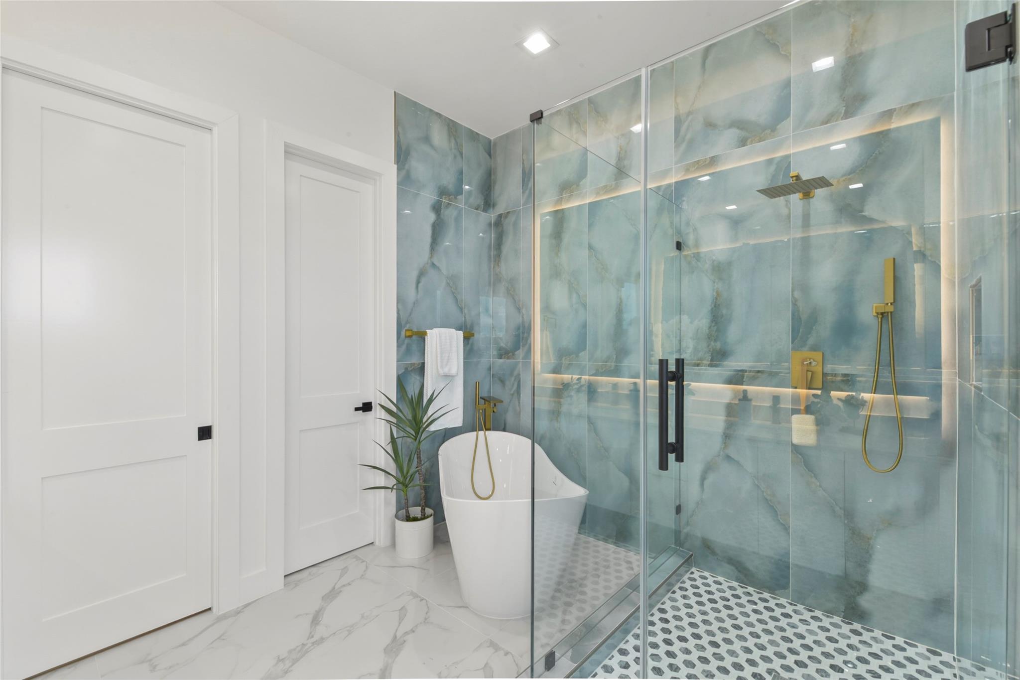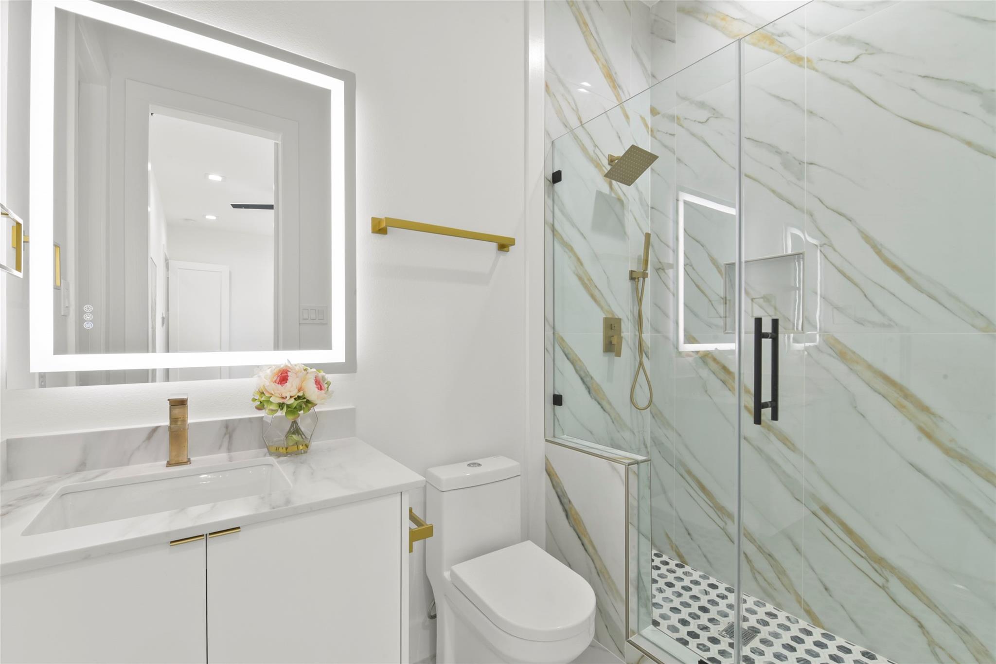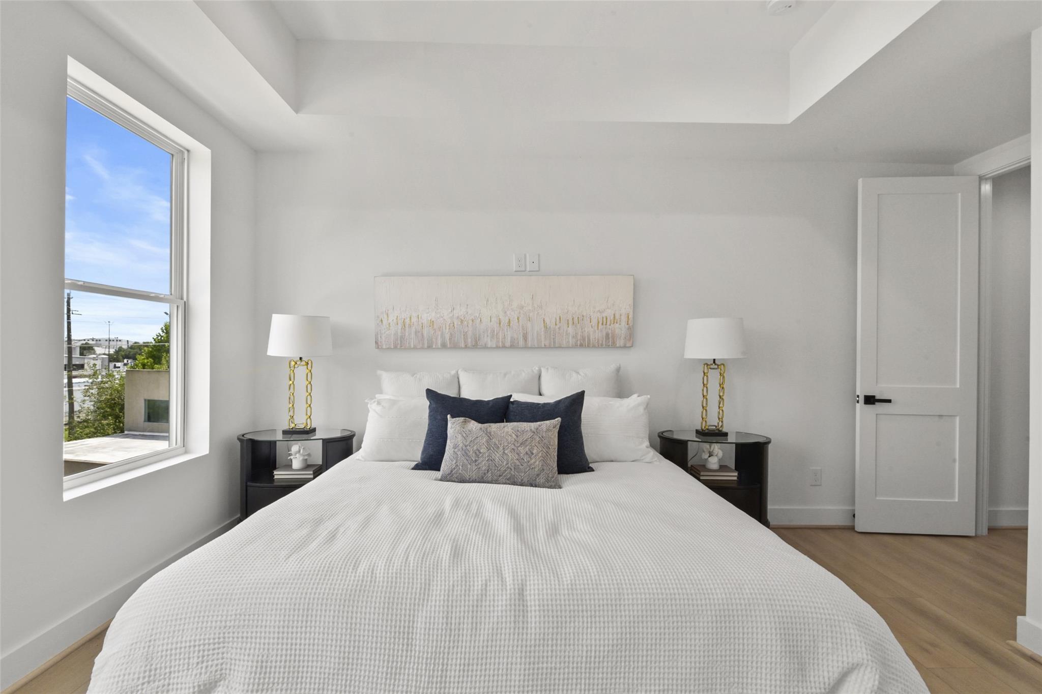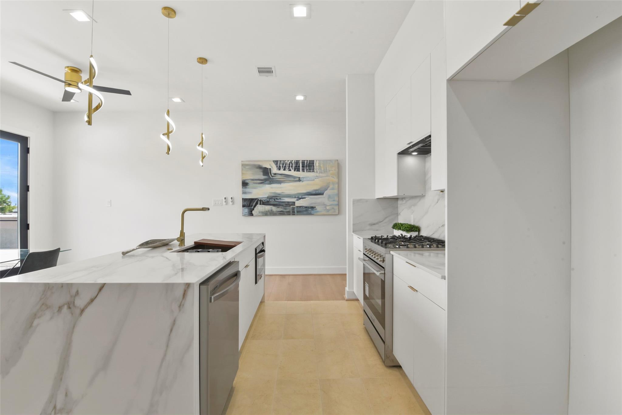 Culinary sanctuary features rare, expensive stone countertops, custom floor-to-ceiling cabinetry, and a suite of professional-grade stainless steel appliances, including a high-performance free-standing stove and a state-of-the-art convection wall oven. The primary suite offers a spa-inspired retreat with a primary bathroom. A freestanding soaking tub serves as the centerpiece, and custom vanity lighting. For effortless entertaining, the lower-level lounge features a sleek kitchenette designed with minimalist cabinetry, an undermount sink, and a built-in convection microwave. Beautiful wooden floors and windows provide a refined backdrop.