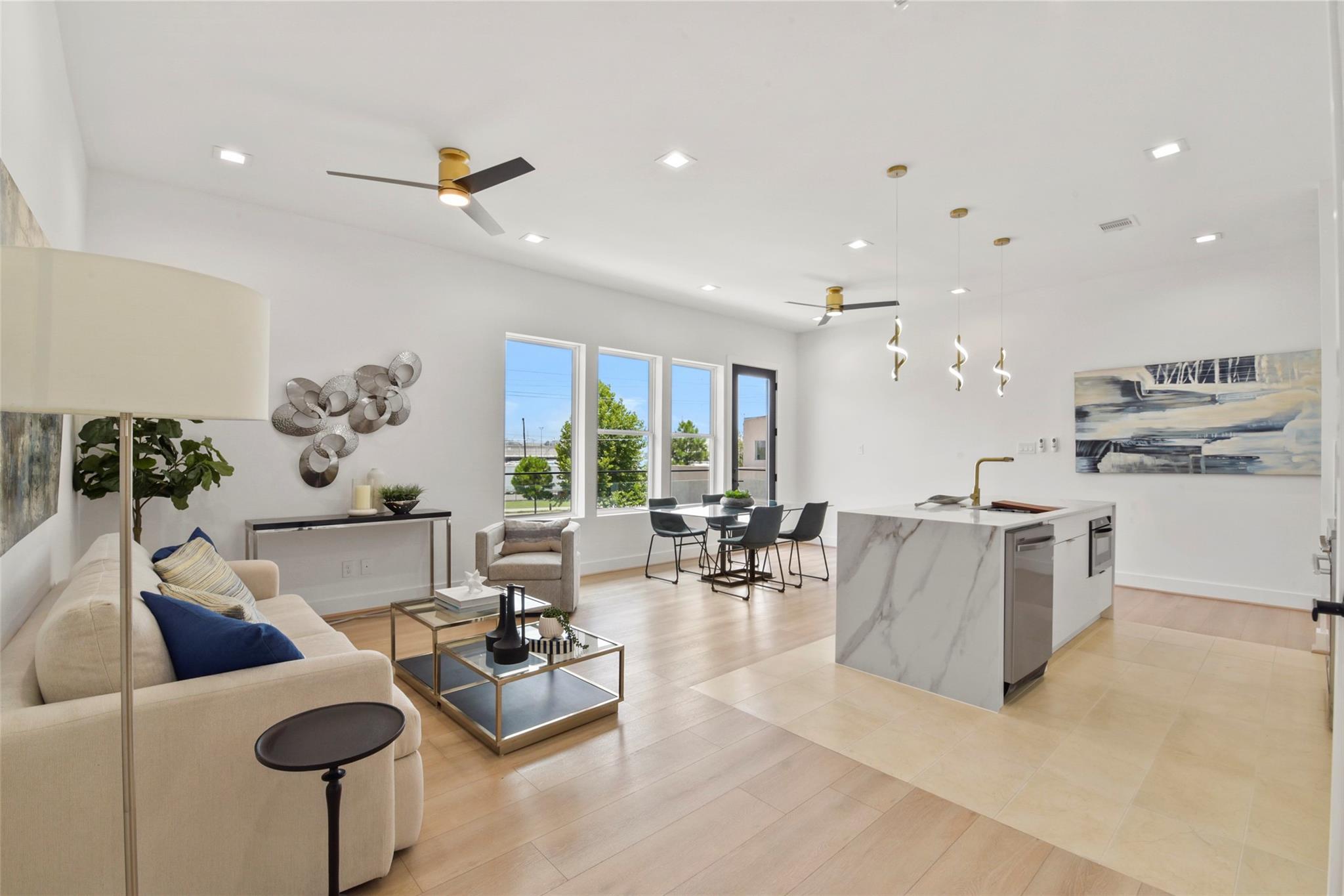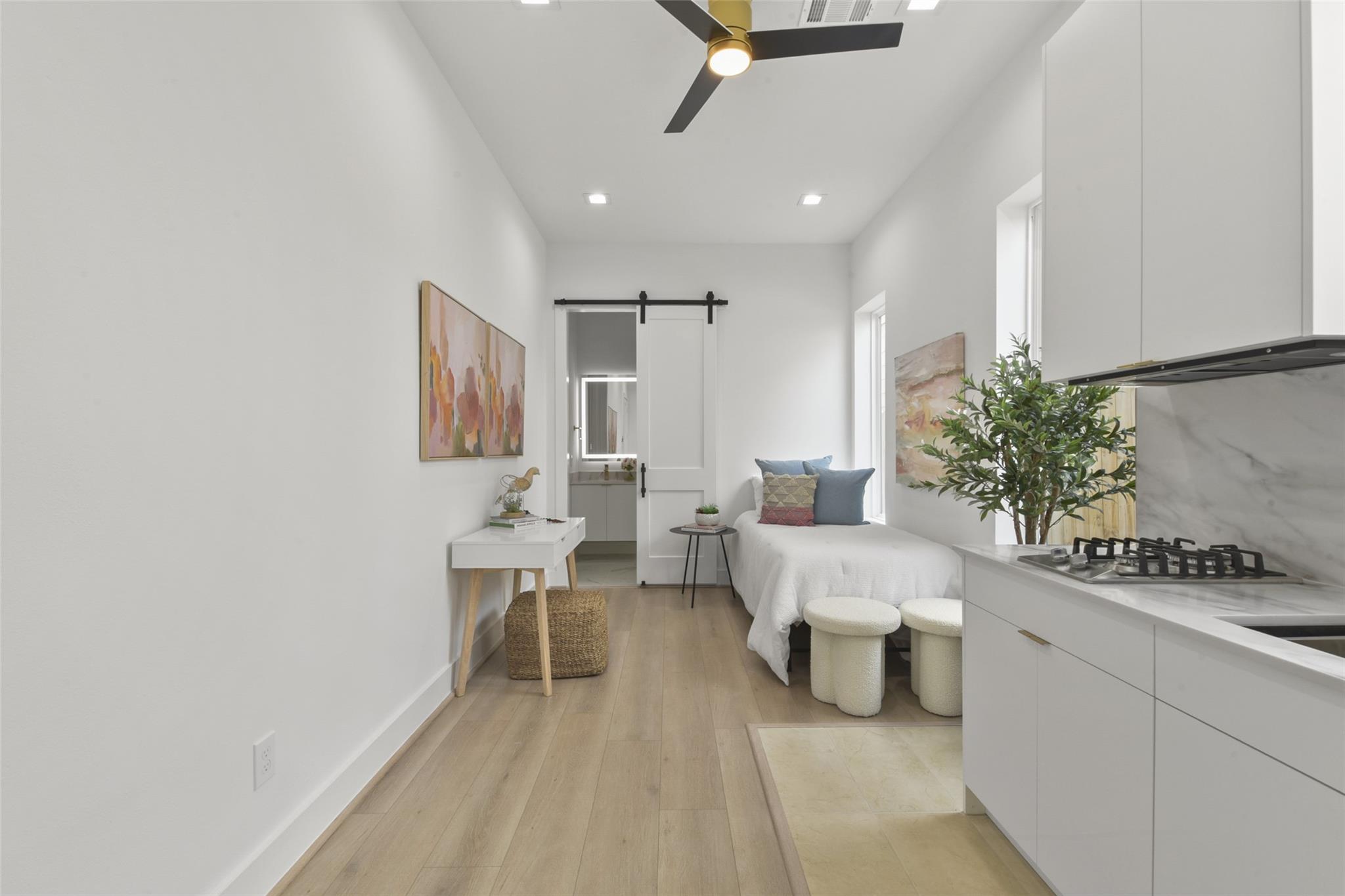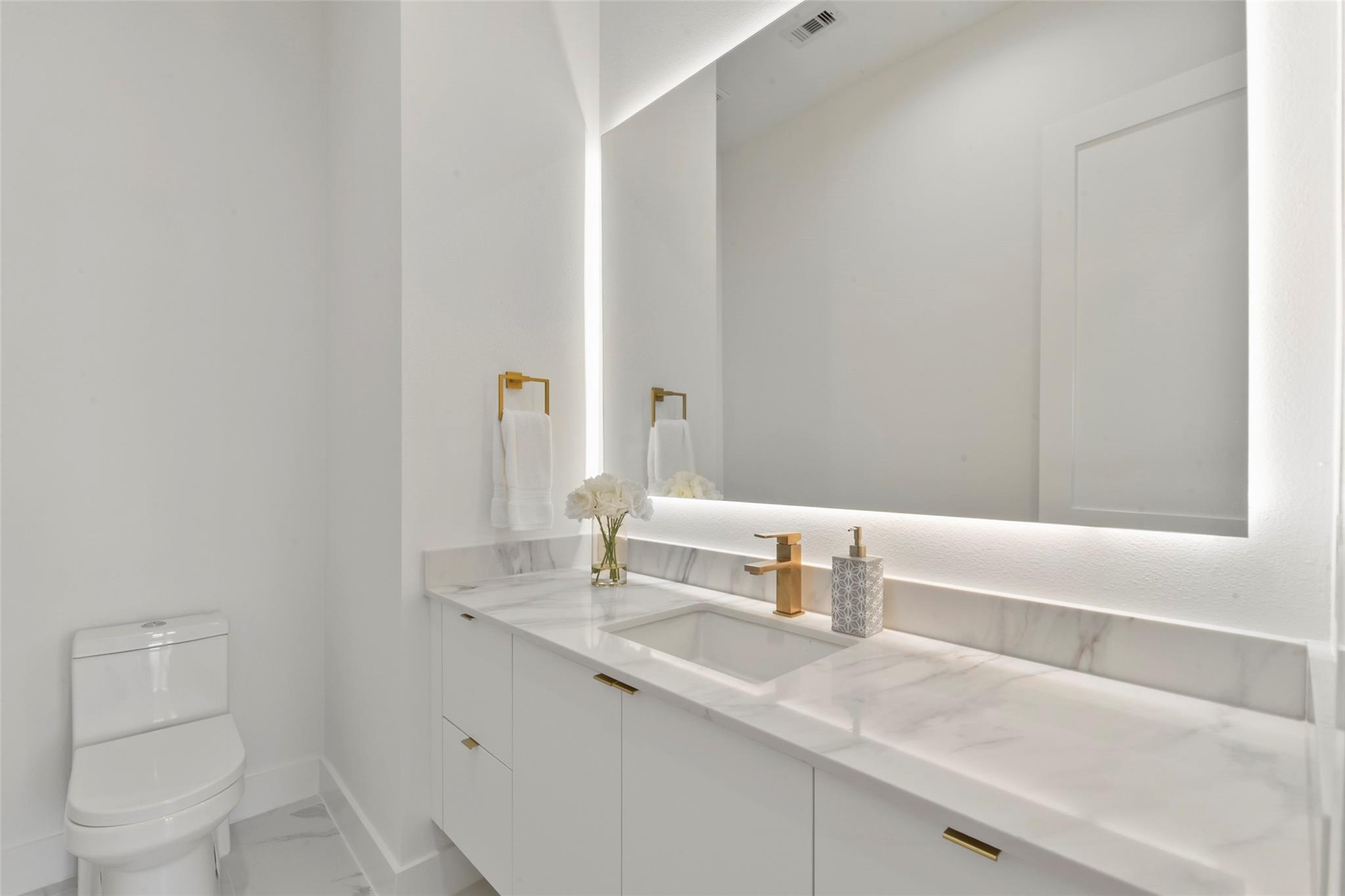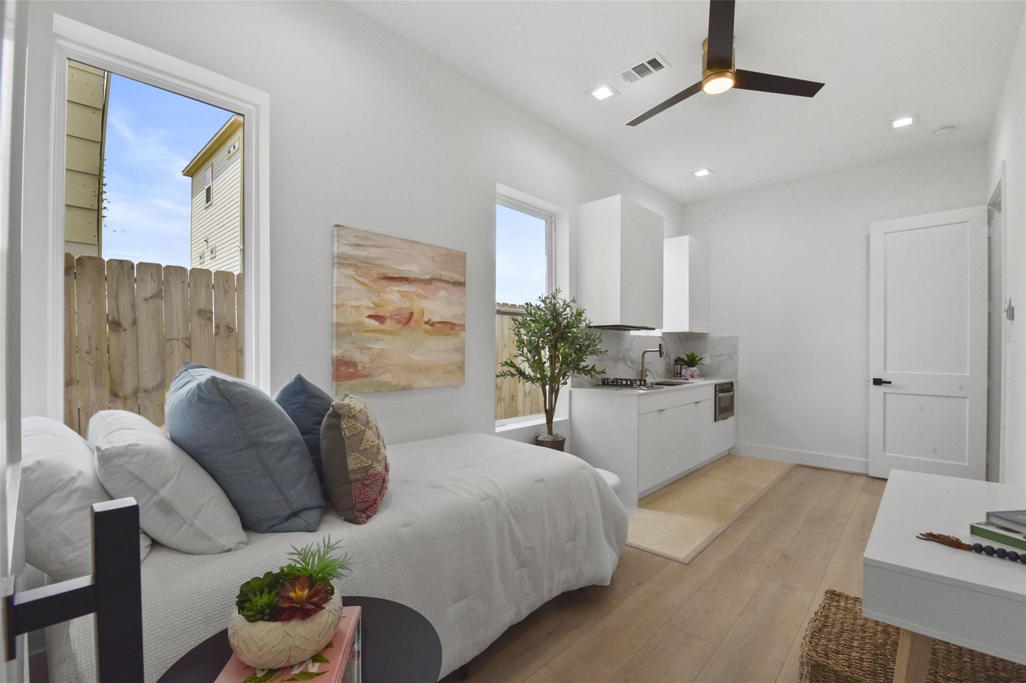Culinary sanctuary features rare, expensive stone countertops, custom floor-to-ceiling cabinetry, and a suite of professional-grade stainless steel appliances, including a high-performance free-standing stove and a state-of-the-art convection wall oven. The primary suite offers a spa-inspired retreat with a primary bathroom. A freestanding soaking tub serves as the centerpiece, and custom vanity lighting. For effortless entertaining, the lower-level lounge features a sleek kitchenette designed with minimalist cabinetry, an undermount sink, and a built-in convection microwave. Beautiful wooden floors and windows provide a refined backdrop.