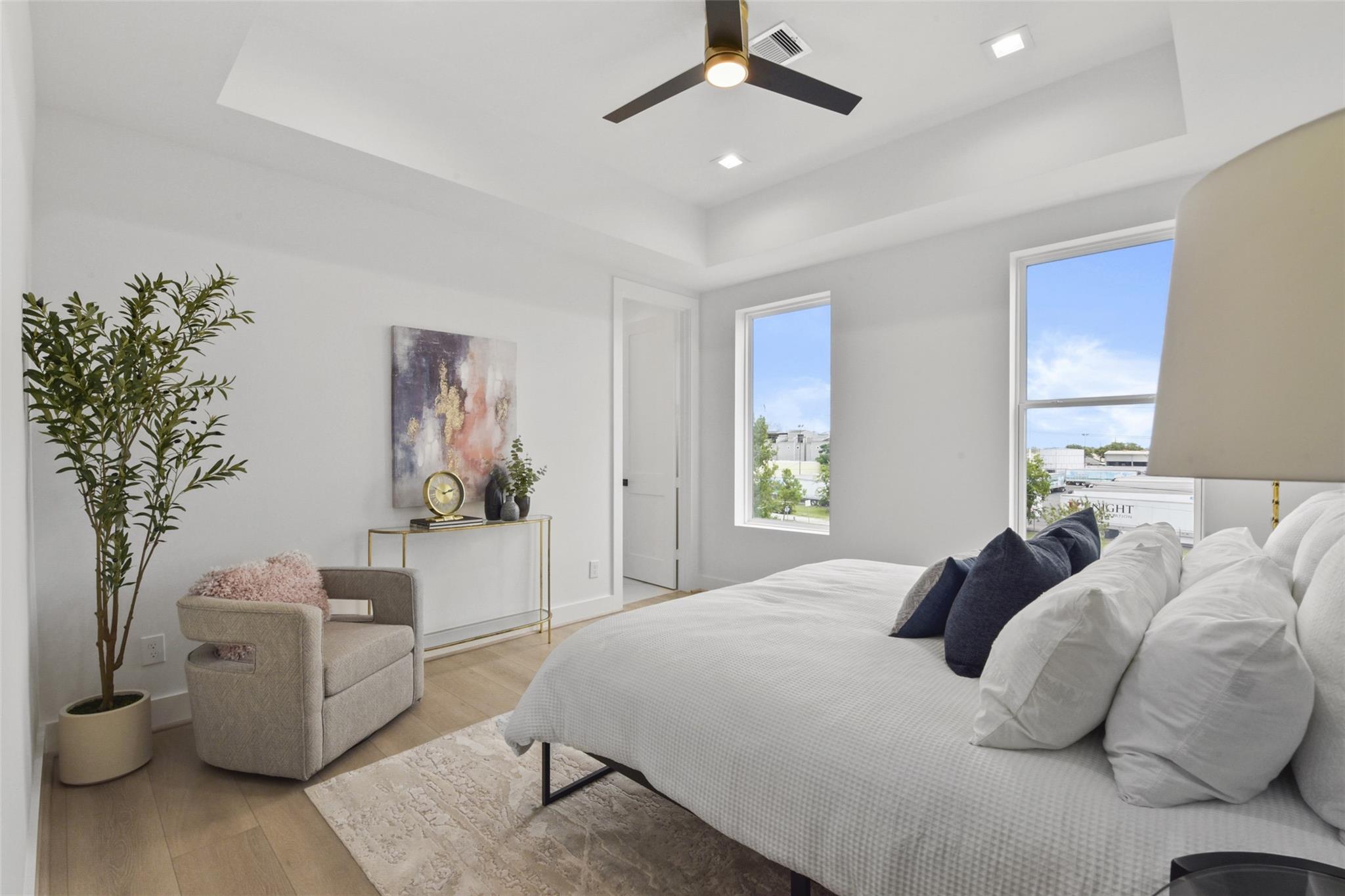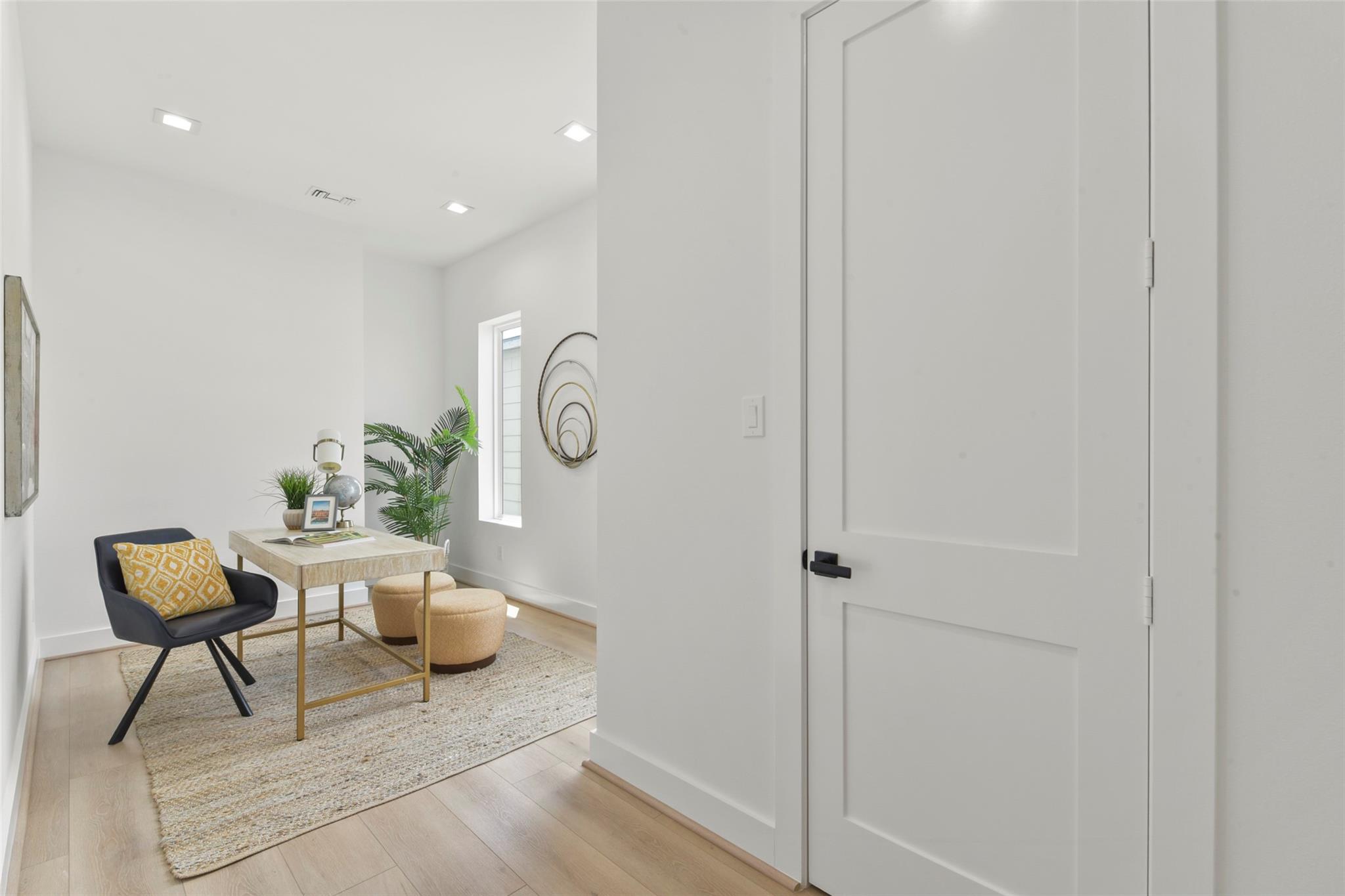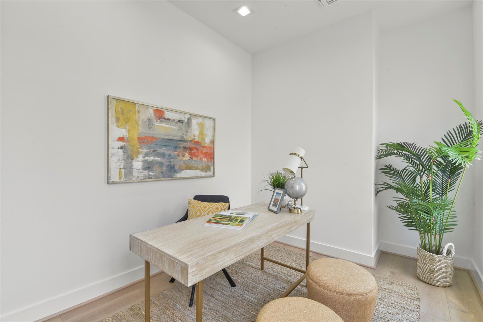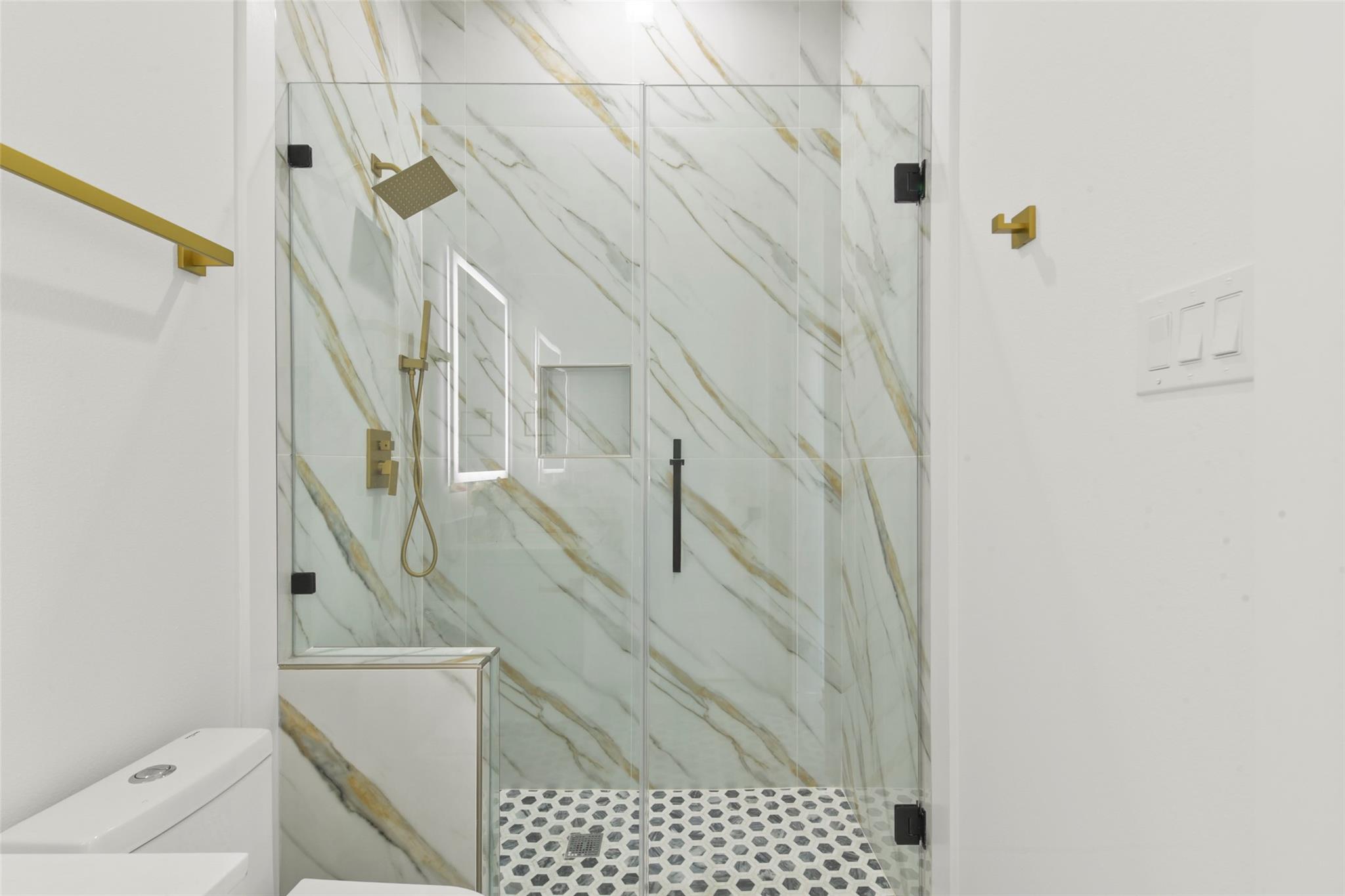Culinary sanctuary features rare, expensive stone countertops, custom floor-to-ceiling cabinetry, and a suite of professional-grade stainless steel appliances, including a high-performance free-standing stove and a state-of-the-art convection wall oven. The primary suite offers a spa-inspired retreat with a primary bathroom. A freestanding soaking tub serves as the centerpiece, and custom vanity lighting. For effortless entertaining, the lower-level lounge features a sleek kitchenette designed with minimalist cabinetry, an undermount sink, and a built-in convection microwave. Beautiful wooden floors and windows provide a refined backdrop.