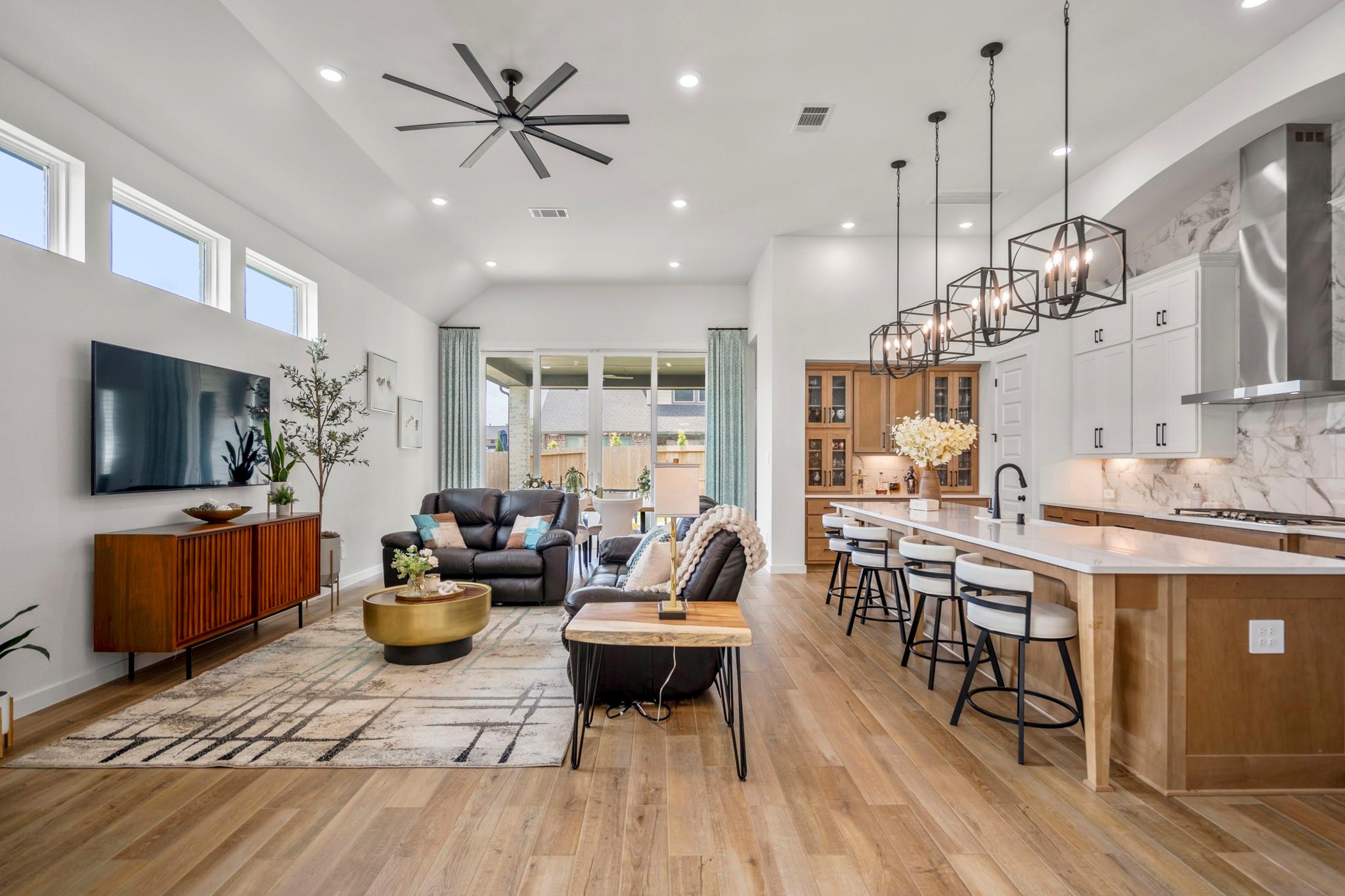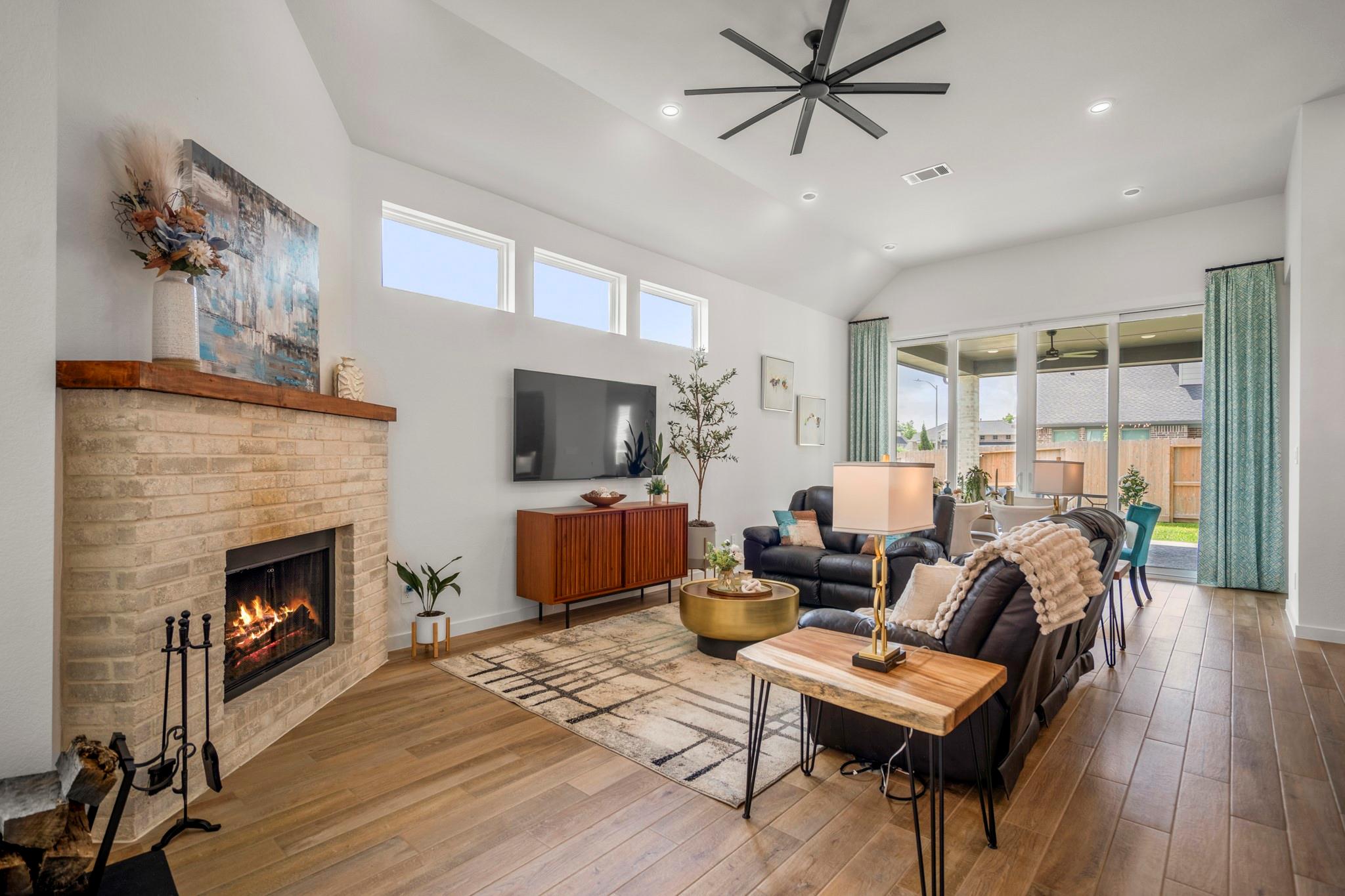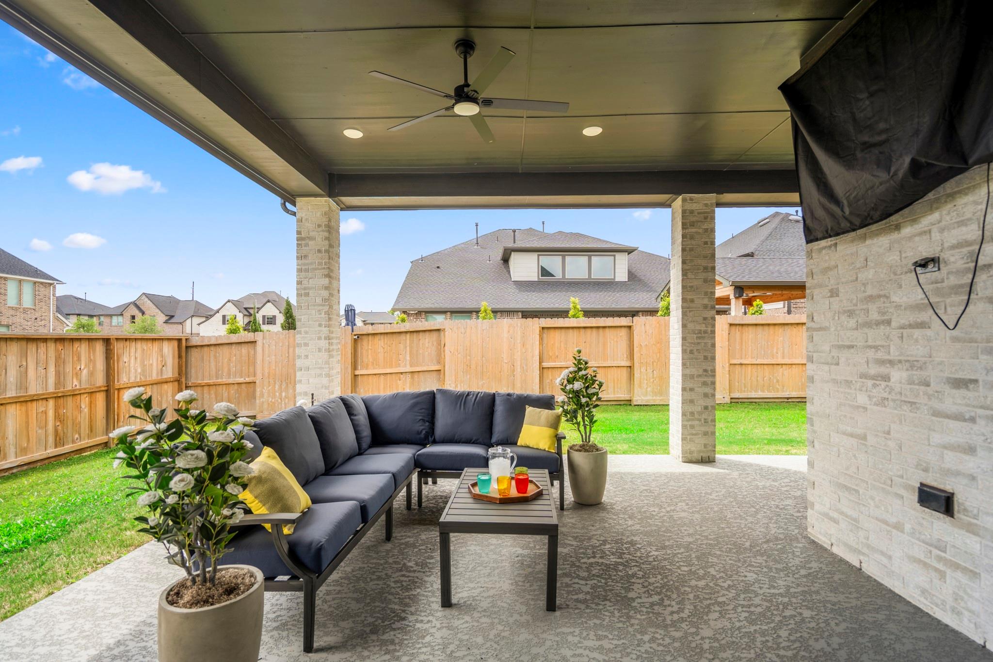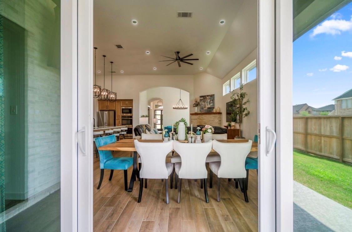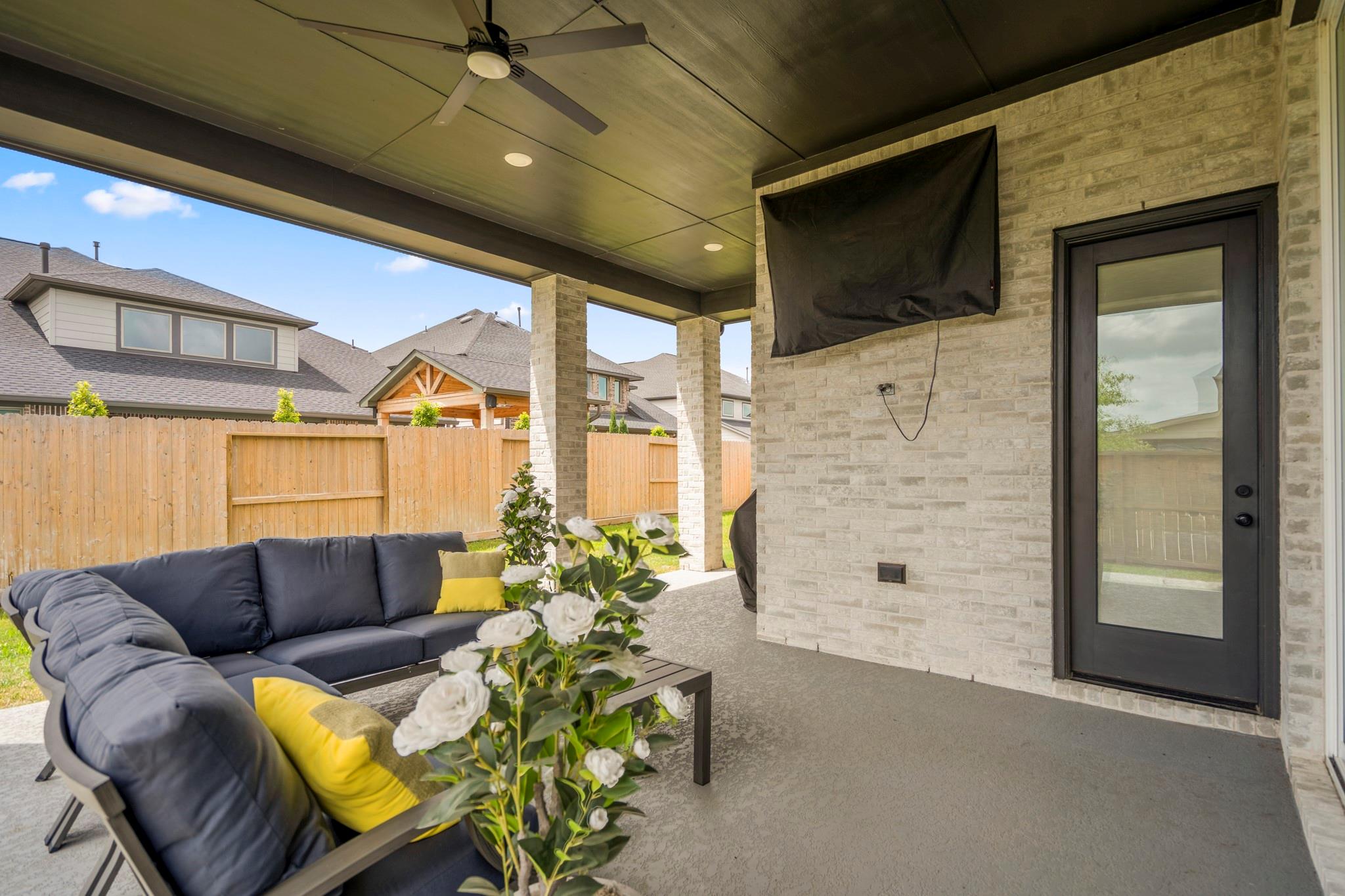 Welcome to your dream home in Fulshear, TX! This stunning 4-bedroom, 3-bath luxury residence spans 3,002 sq ft on a premium corner lot in one of the Houston area’s most sought-after communities. The elegant family room, anchored by a cozy fireplace, flows into a gourmet kitchen with double ovens, quartz countertops, glass-front hutch cabinets, upgraded pendants, and a Blanco sink. The extended primary suite stuns with a freestanding 67” soaking tub, custom barn door, tile-to-ceiling shower, and a custom closet with soft-close drawers. Matte black fixtures, 8’ interior doors, and hardwood-look tile add designer flair throughout. Entertain effortlessly on the extended covered patio with spray deck, gas drop, pre-plumbed water line for outdoor kitchen, and flood lights, plus a tandem garage with epoxy floors. Extras include plantation shutters, water softener, and full gutters with French drains. See attachments for a list of the home’s many upgrades and standout features.