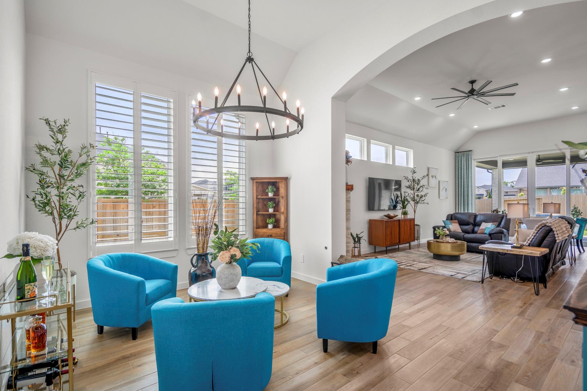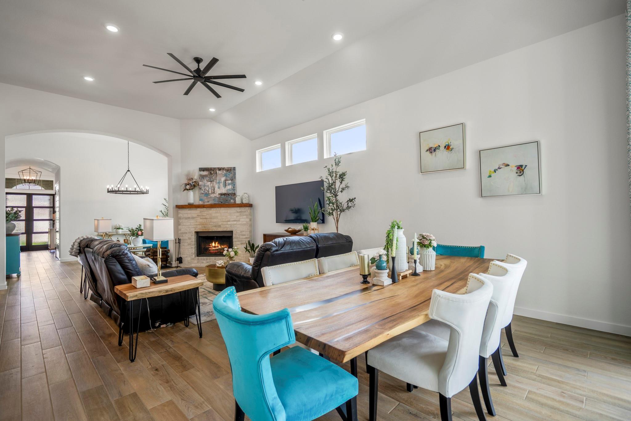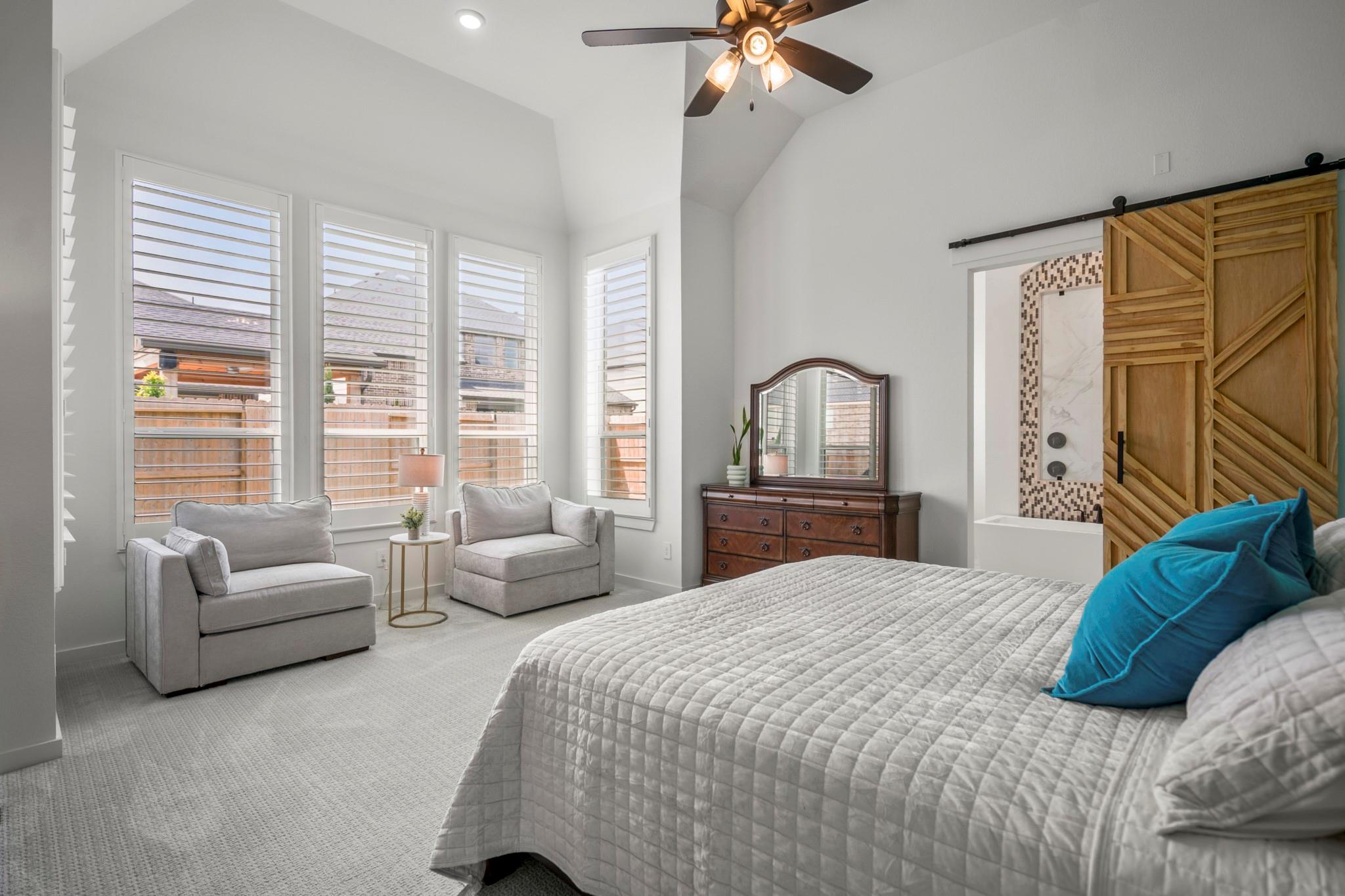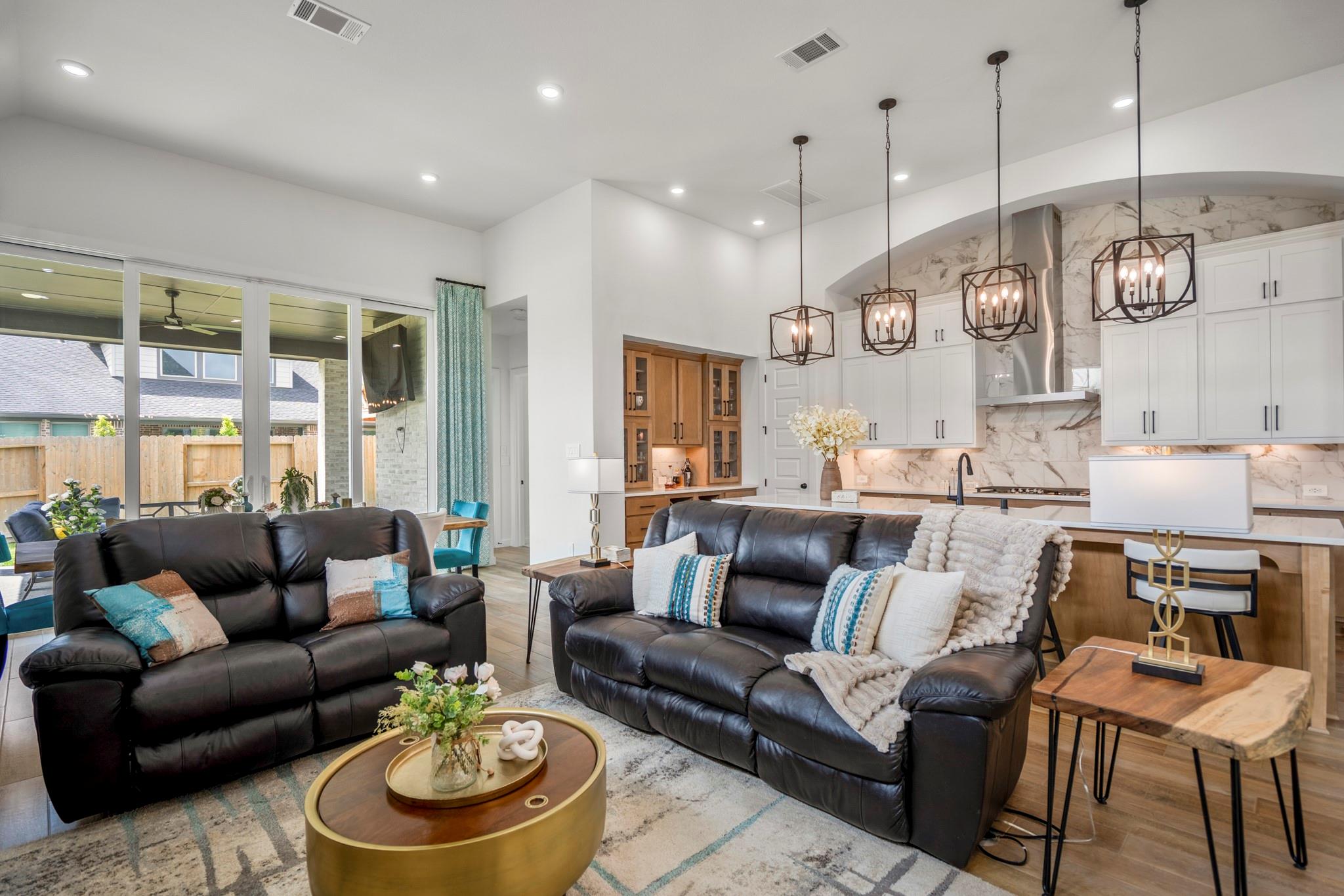 Welcome to your dream home in Fulshear, TX! This stunning 4-bedroom, 3-bath luxury residence spans 3,002 sq ft on a premium corner lot in one of the Houston area’s most sought-after communities. The elegant family room, anchored by a cozy fireplace, flows into a gourmet kitchen with double ovens, quartz countertops, glass-front hutch cabinets, upgraded pendants, and a Blanco sink. The extended primary suite stuns with a freestanding 67” soaking tub, custom barn door, tile-to-ceiling shower, and a custom closet with soft-close drawers. Matte black fixtures, 8’ interior doors, and hardwood-look tile add designer flair throughout. Entertain effortlessly on the extended covered patio with spray deck, gas drop, pre-plumbed water line for outdoor kitchen, and flood lights, plus a tandem garage with epoxy floors. Extras include plantation shutters, water softener, and full gutters with French drains. See attachments for a list of the home’s many upgrades and standout features.