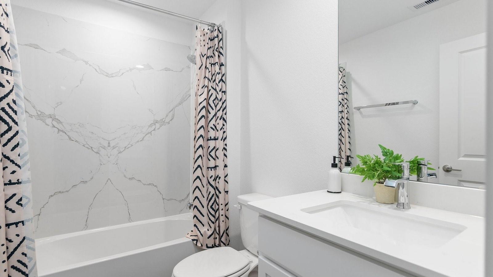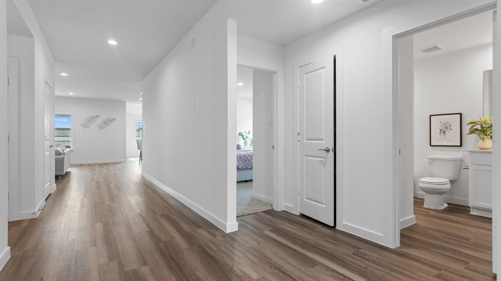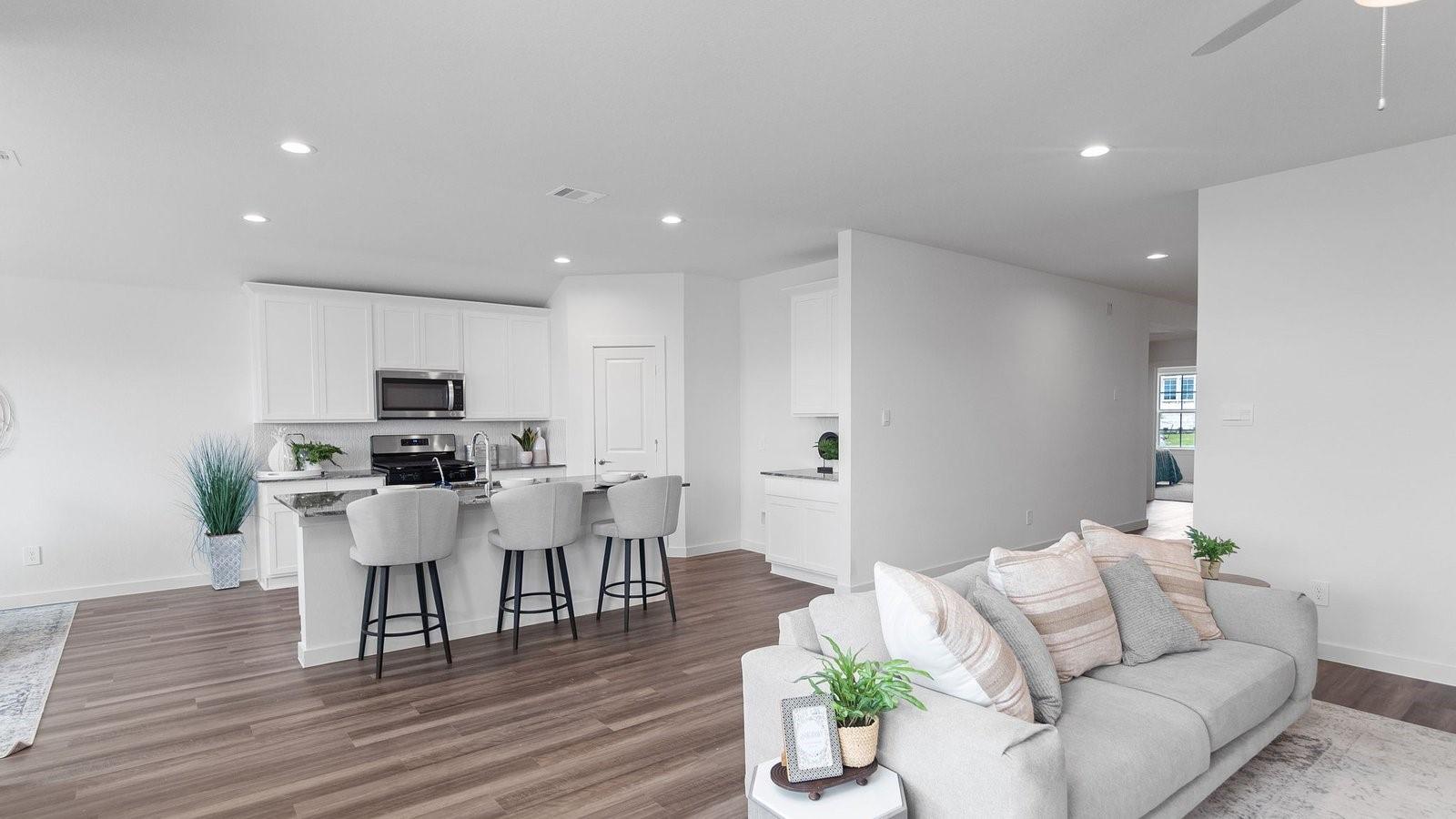 MOVE IN READY. The Fairfield is a spacious one-story home offering 4 bedrooms, 3 bathrooms, and a 3-car garage. Designed with an open-concept layout, the heart of the home features a gourmet kitchen with durable countertops, crisp white cabinetry, stainless steel appliances, and a corner pantry—all overlooking the dining & family rooms. The private primary suite includes a well-appointed bathroom with the option for a separate tub and shower, along with a generous walk-in closet. Bedroom 4 is paired with a private third bathroom, making it an ideal guest suite. A covered rear patio, located just off the family room, comes standard size-perfect for relaxing outdoors. Stylish LVP flooring is featured throughout, adding comfort and elegance to every room. Enjoy Tamarron’s resort-style pool, splash pad, fitness center, playgrounds, lakes, trails & sports fields. Close to shopping, dining, I-10, Grand Pkwy & Westpark Tollway. Zoned to top-rated LCISD schools.