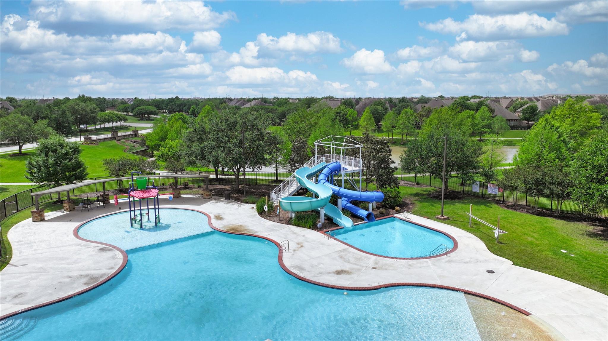 Perry home with a stunning water view, no back neighbors, located on a corner homesite. Two story mahogany front door entrance on a brick and stone stunning elevation. Office on 1st floor, and formal dining room, coming off of the foyer. Family room features an 18-foot ceiling, wall of windows, cast-stone fireplace, and is open to the kitchen and breakfast area. Kitchen features an angled island with seating space, granite countertops, a walk-in pantry, 42-inch raised panel cabinets and a Butler's pantry. Primary on the 1st floor has his and hers closets, ample natural light, soaking tub, and double bathroom sinks on opposite walls. There is a secondary bedroom on the 1st floor that has its own en suite bath. 6 bedrooms with whole house water softener, security system, and generator. Front and back sprinklers, covered back patio with gas access. Residents can enjoy a clubhouse, splash pad and swimming, tennis, basketball and sports fields. Students attend recognized Katy ISD schools.